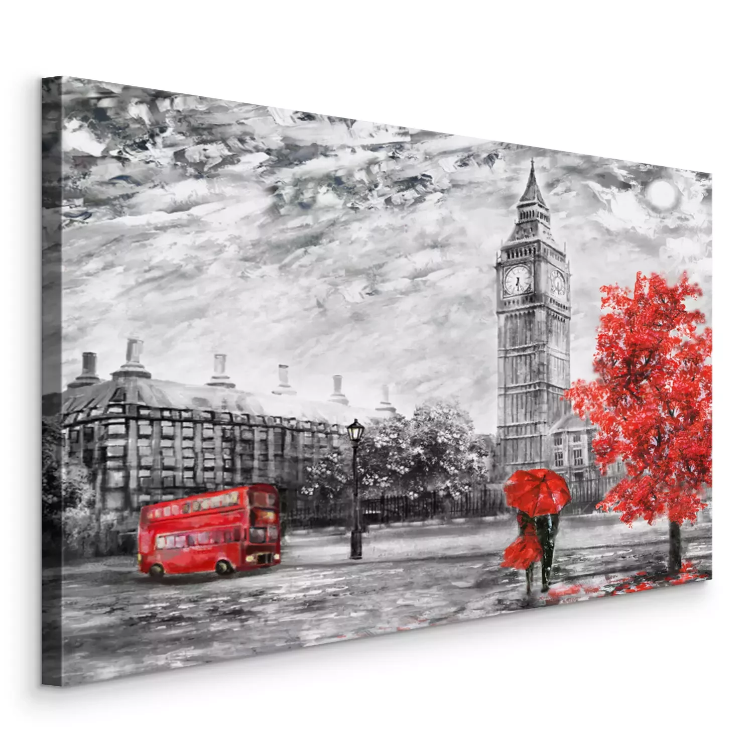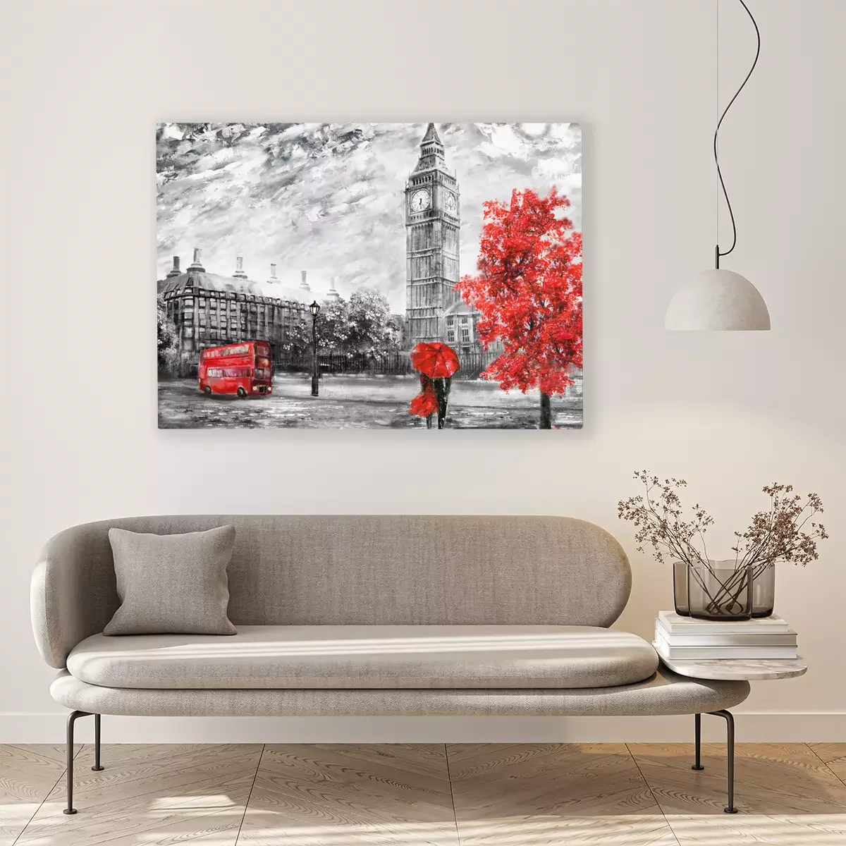 Eine der schönsten und von Touristen meistbesuchten Städte ist London. Bild, das wir ausgewählt haben, zeigt diese Metropole nicht einfach nur, sondern tut dies auf eine außergewöhnliche Art und Weise. Es ist kein Foto, sondern ein Muster, das wie ein gemaltes Kunstwerk aussieht. Den künstlerischen Charakter der gesamten Komposition unterstreicht die Farbgebung dieses Bildes. London wird in Schwarz-Weiß mit kräftigen roten Akzenten wie dem charakteristischen Doppeldeckerbus, einem Baum mit Herbstblättern und einem Mädchen mit Regenschirm dargestellt. Eine solch interessante Farbkombination macht es zu einer Dekoration, die zwar unsere Aufmerksamkeit auf sich zieht, aber gleichzeitig die Einrichtung nicht dominiert. In welcher Raumdeko präsentiert sich gut ein solches Bild? Big Ben auf einem schwarz-weißen Gemälde ist eine hervorragende Ergänzung für ein romantisch eingerichtetes Schlafzimmer. Ein bemerkenswerter Akzent in diesem Zusammenhang ist das Paar im Vordergrund, das der Komposition eine stimmungsvolle Note verleiht. Ein weiterer wichtiger Aspekt ist hier die Farbgebung dieses Bildes. London sieht auch in einer modernen Einrichtung, die auf einer grauen Farbpalette basiert, gut aus. Die roten Akzente lockern das monochrome Design auf und verleihen dem Raum Ausdruckskraft. Wenn Sie sich für ein solches Motiv entscheiden, können Sie dieses Bild Big Ben zur Hauptdekoration machen. Es reicht aus, eine großformatige Leinwand zu wählen, damit die Stadtansicht zum Mittelpunkt des Arrangements wird. Auf der Suche nach einer Idee für die Raumdekoration sollten Sie auf dekorative Akzente setzen, die nicht nur beeindrucken, sondern auch zusätzlichen Wert haben. Waren Sie schon einmal in London? Bild mit einer solchen Ansicht ist eine hervorragende Lösung, um zu zeigen, wie sehr Ihnen diese Stadt gefallen hat. So weckt die Illustration angenehme Erinnerungen und wird zu einem Accessoire, das nie langweilig wird oder aufhört zu gefallen. Fügen Sie noch ein paar rote Akzente hinzu, damit sich die Dekoration besser in das bestehende Arrangement einfügt, und genießen Sie die schöne Verwandlung des Raumes.