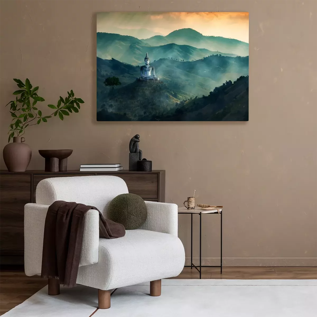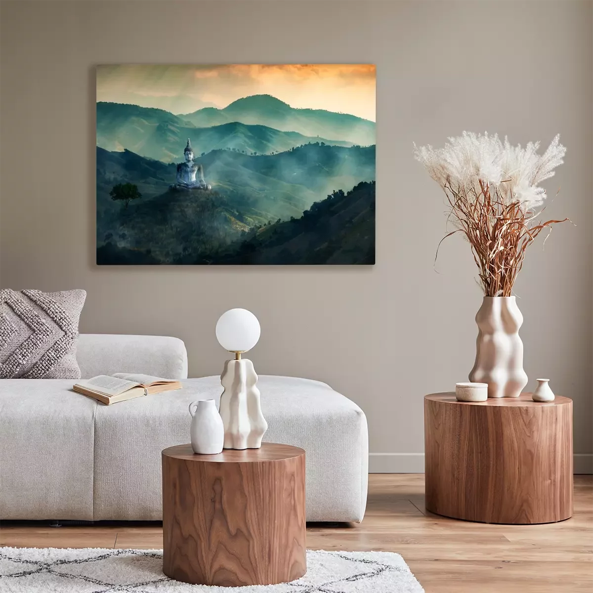Bild Religiöse Statue vor dem Hintergrund einer schönen Berglandschaft