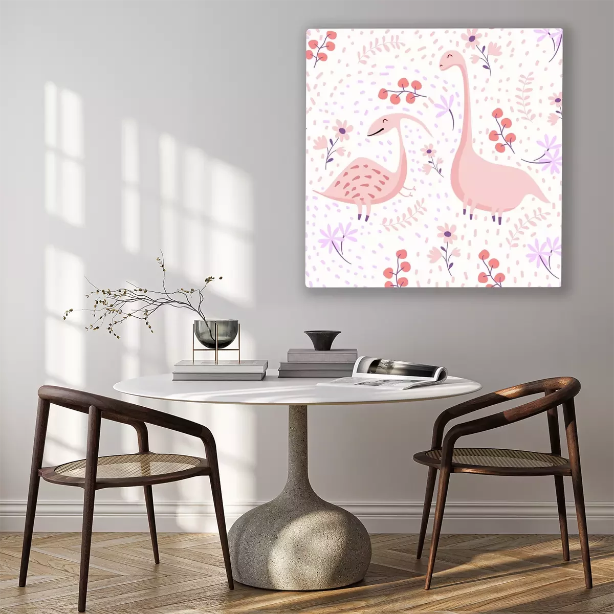 Bild: Rosa Dinosaurier auf floralem Hintergrund