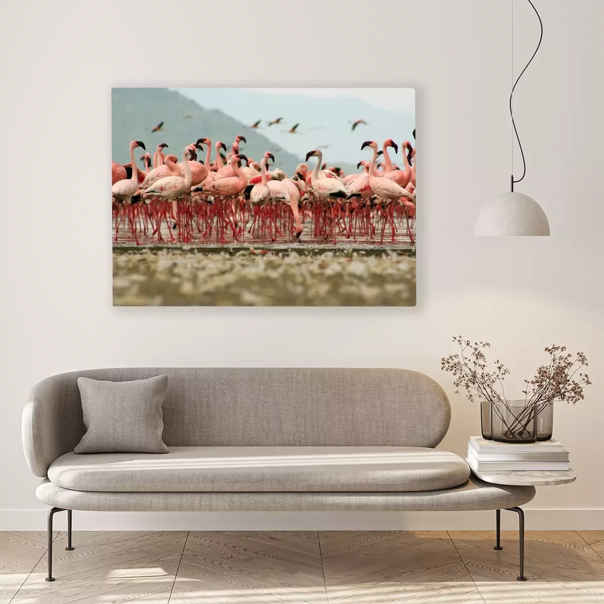 Flamingo vor dem Hintergrund des Himmels und Wassers