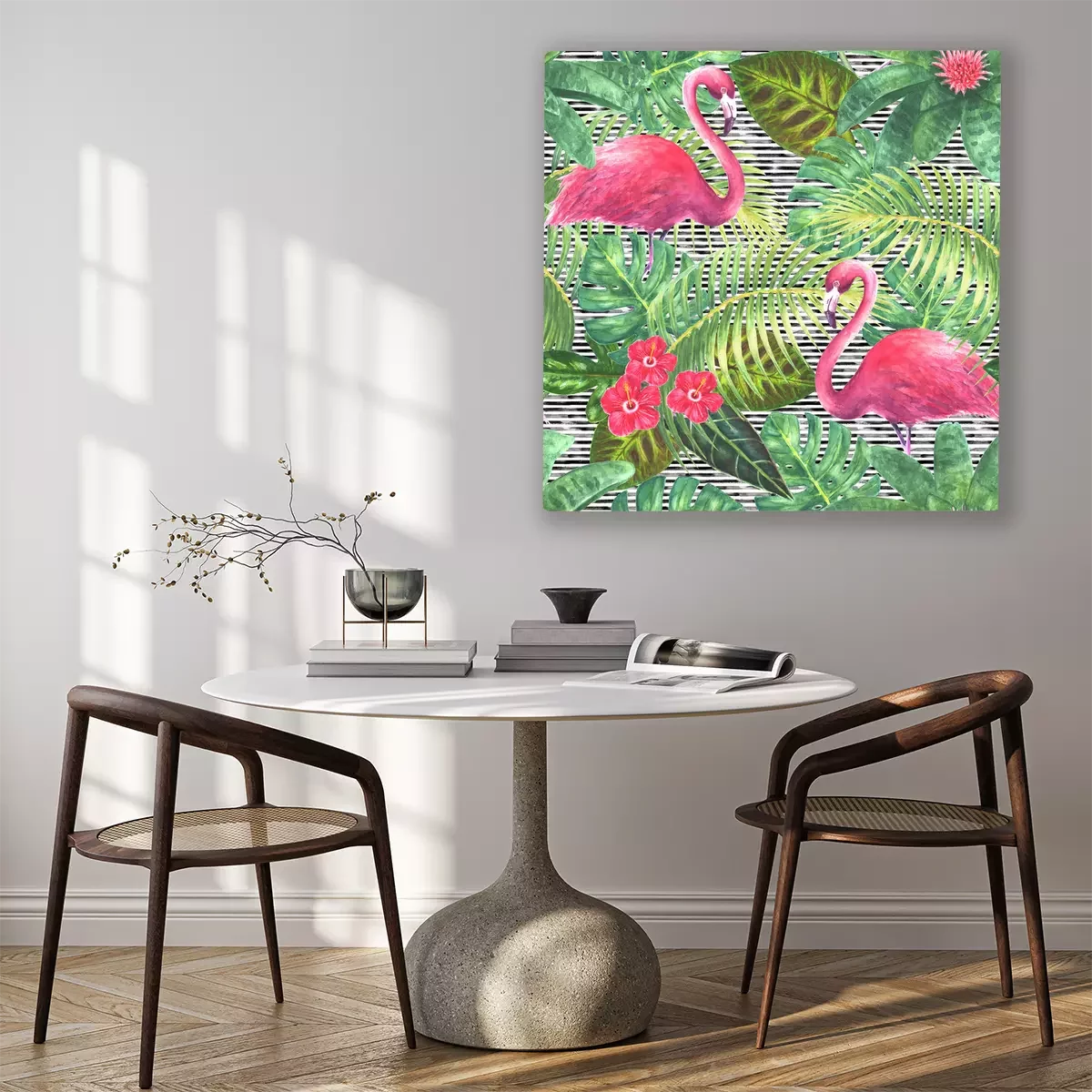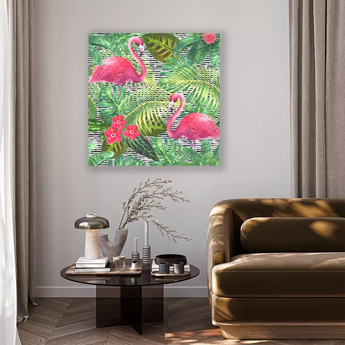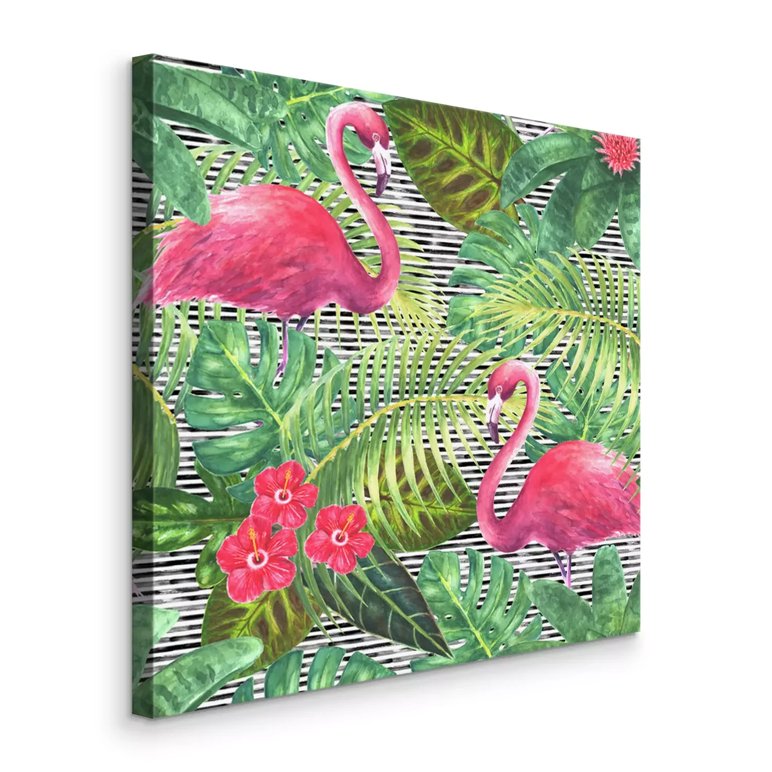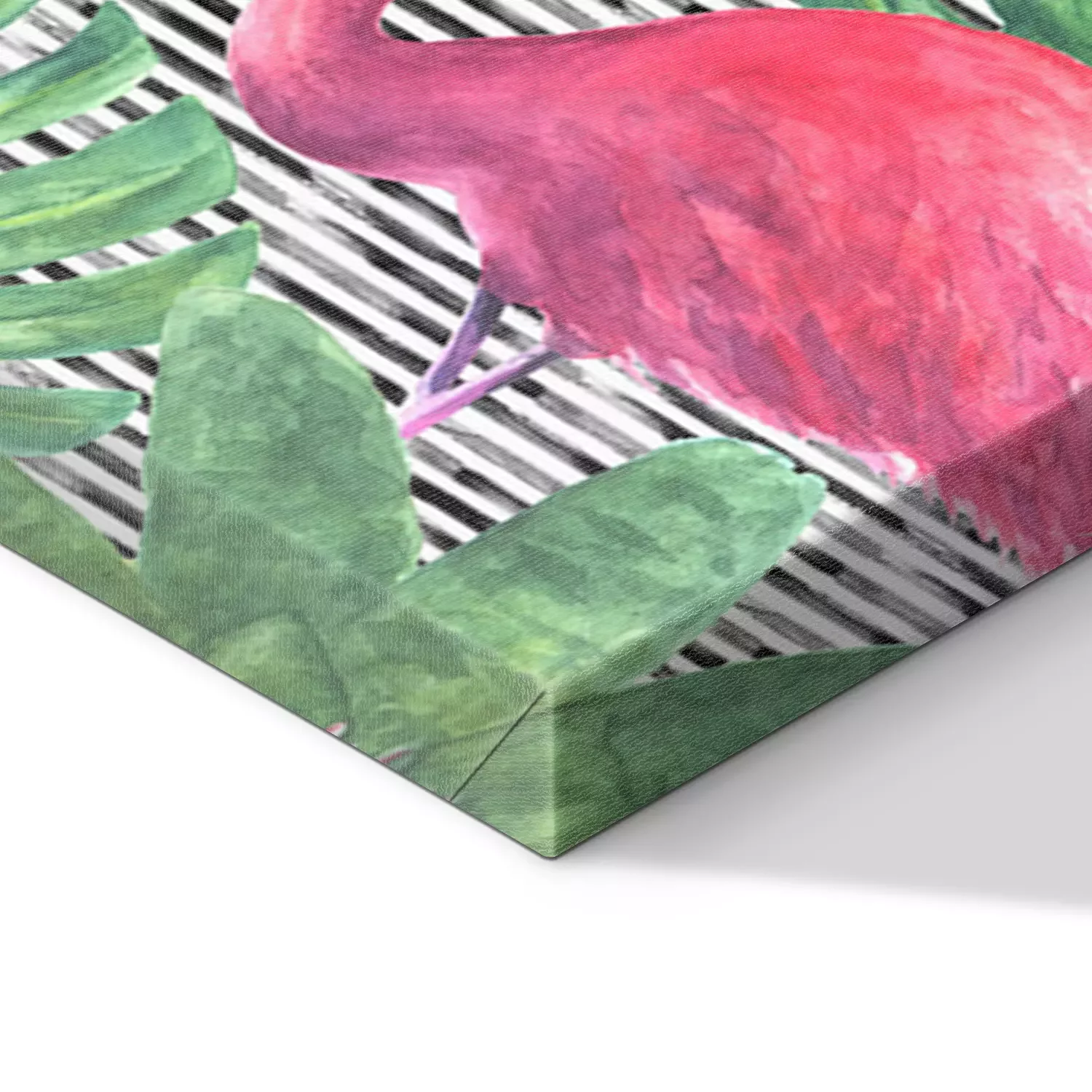 Flamingos Blätter und Blumen auf gestreiftem Hintergrund