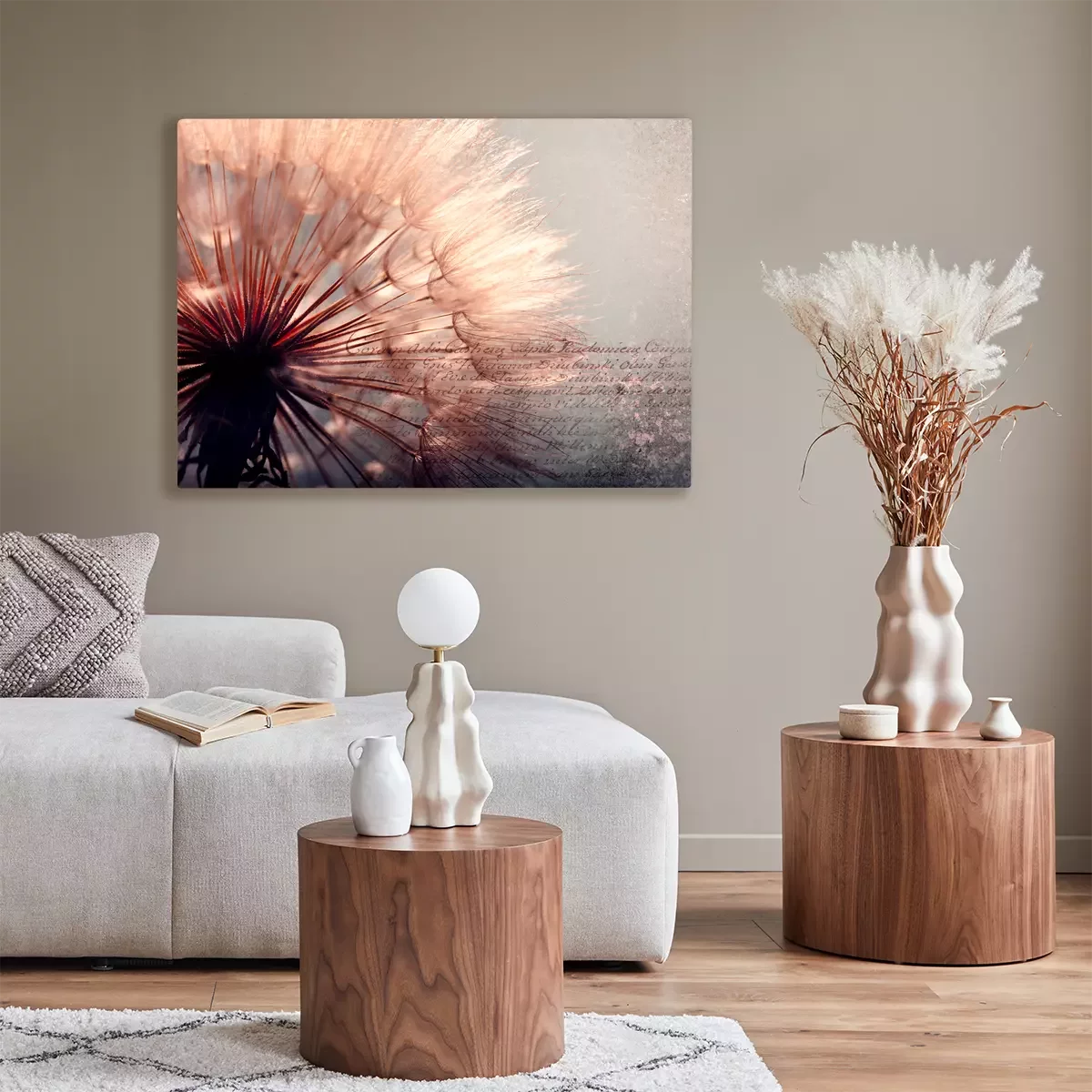 Rosa und bernsteinfarbene pusteblume mit inschrift im hintergrund