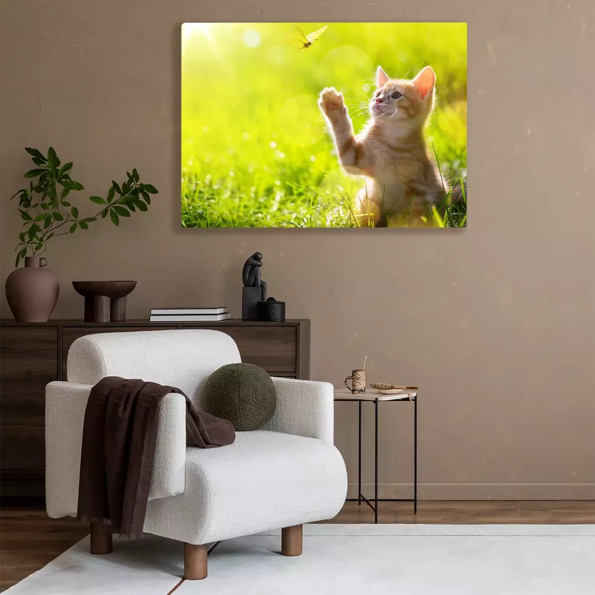 Kleines Kätzchen mit Schmetterling auf einer sonnigen Wiese