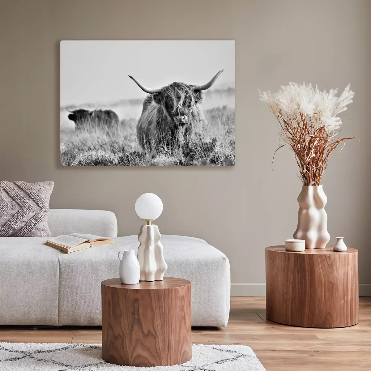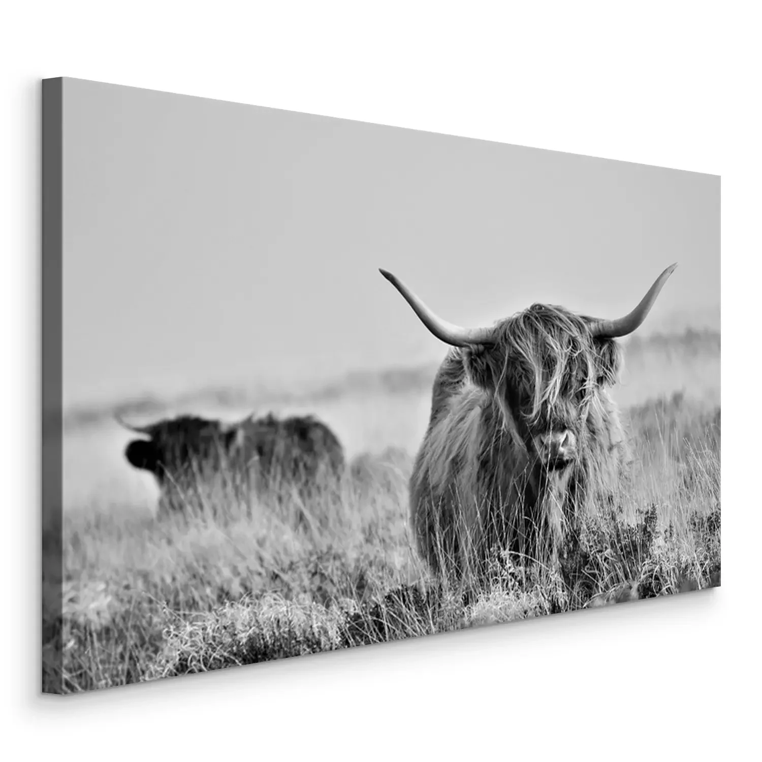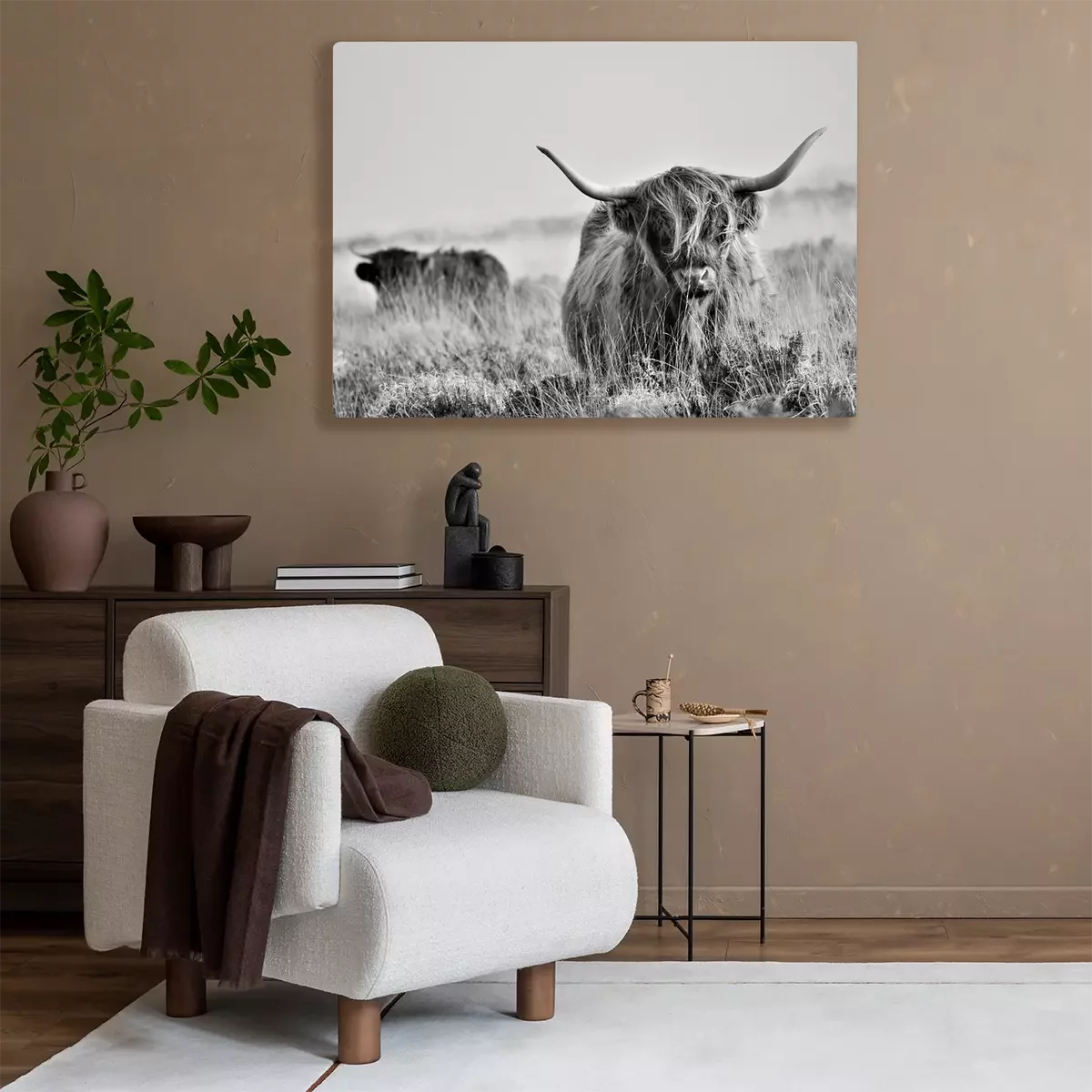 Bild Schwarz-weiße Landschaft mit schottischen Kühen