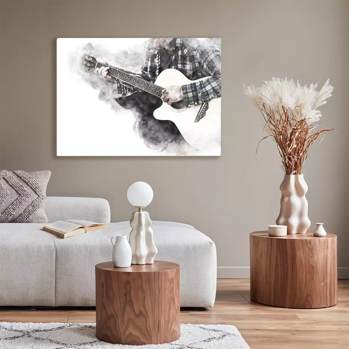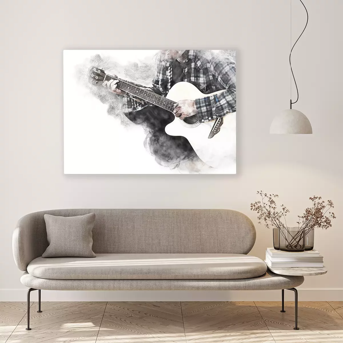 Bild: Schwarz-weißes Instrument und Gitarrist