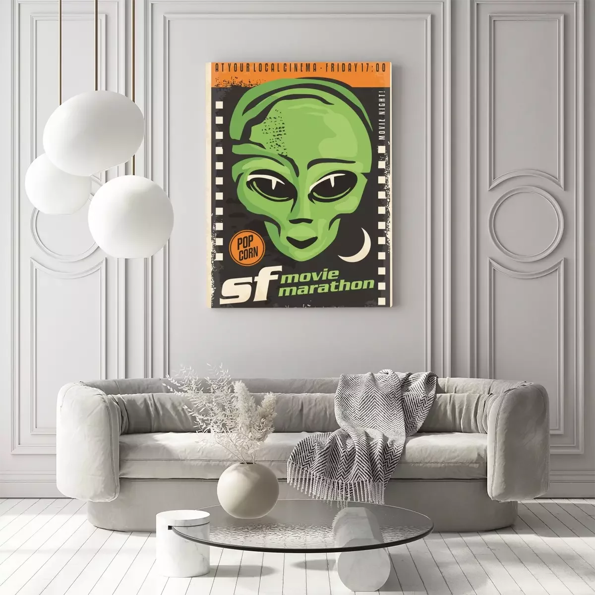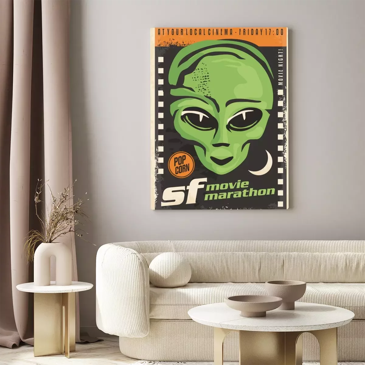 Bild Science fiction movie night retro poster design with alien and film strip on dark background. Cinema event vintage flyer.