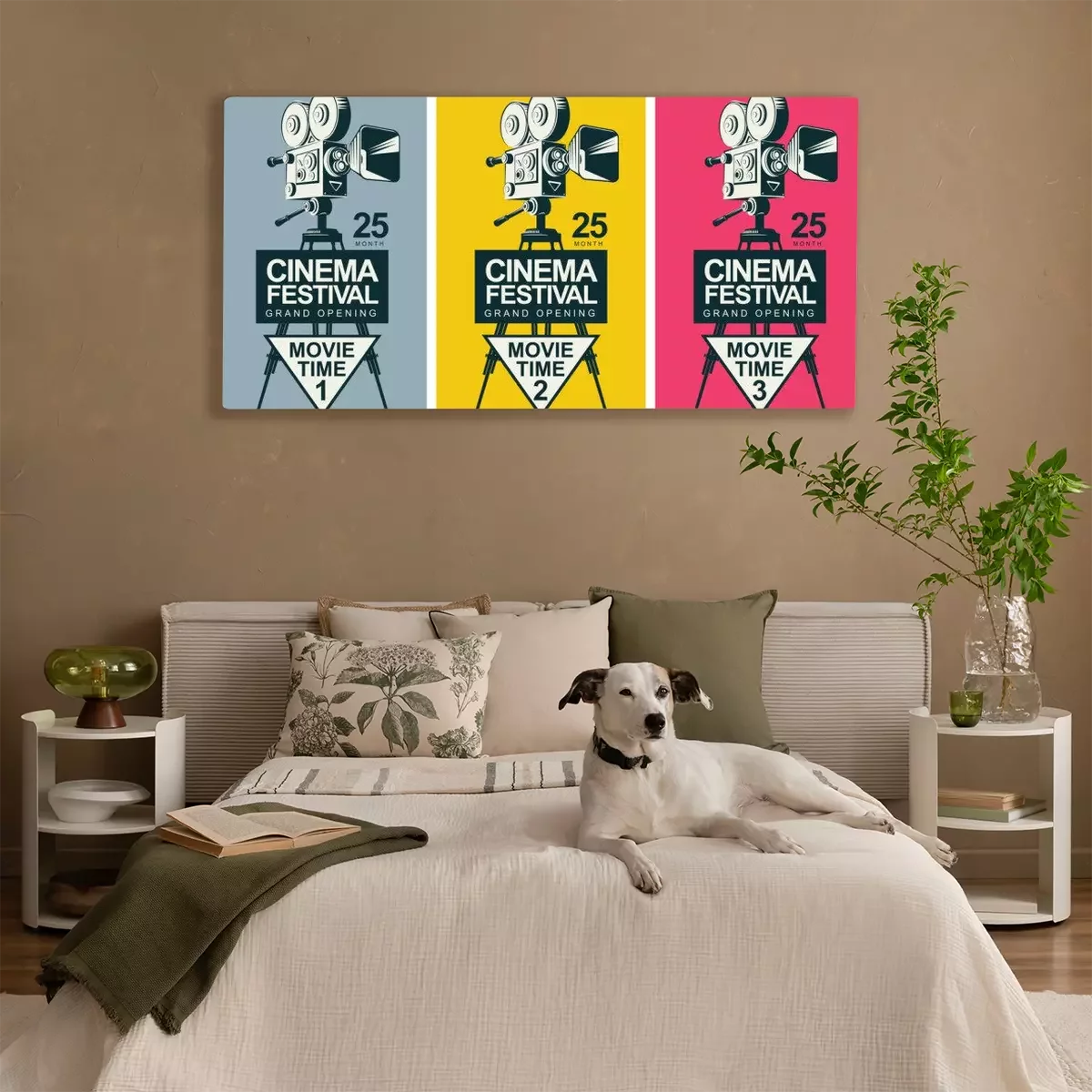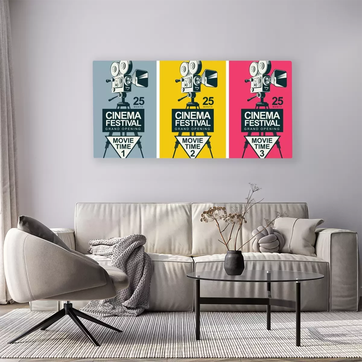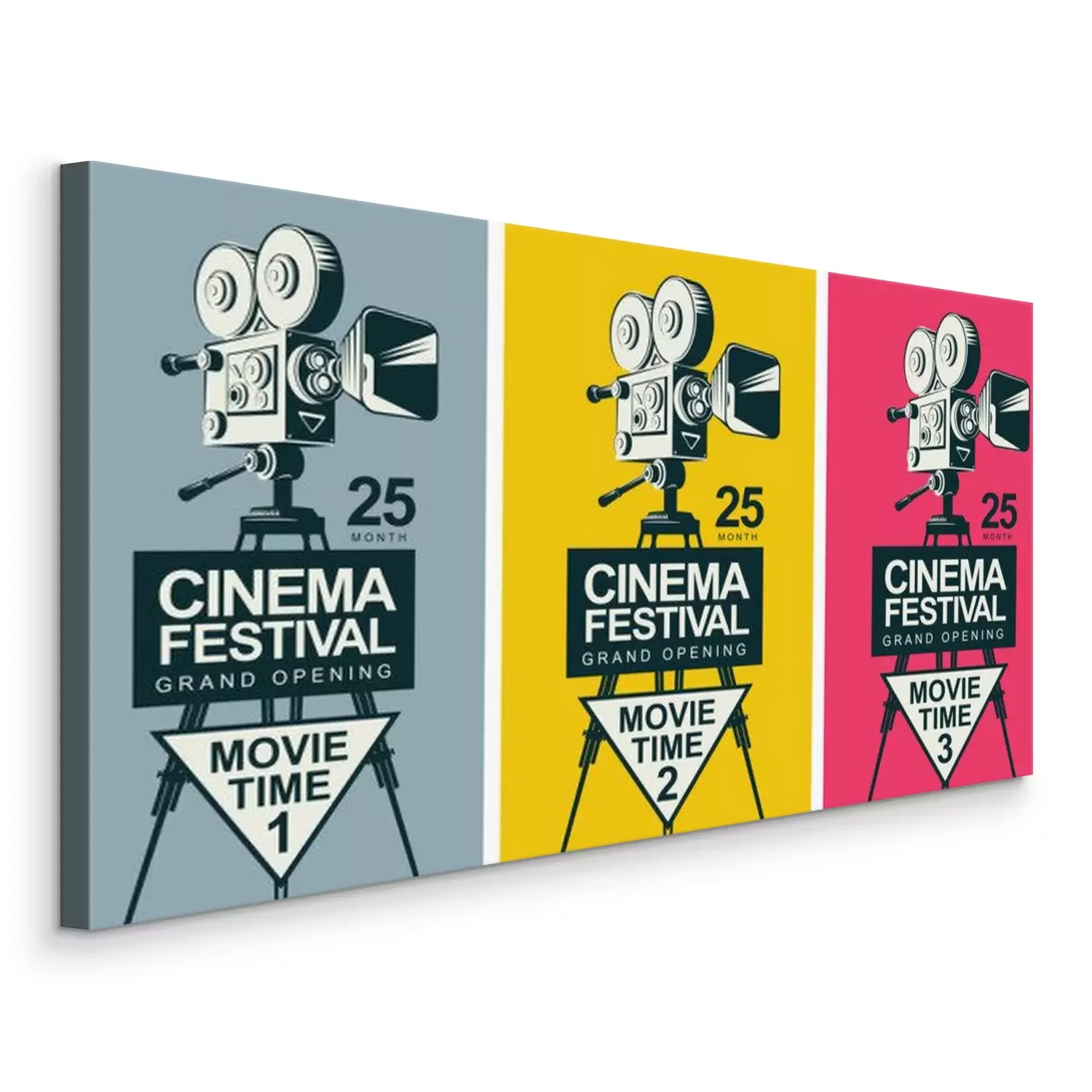 Bild Set of three vector posters for cinema festival with old fashioned movie camera on the tripod in retro style. Can be used for flyer, ticket, poster, web page. Movie time 1, movie time 2, movie time 3