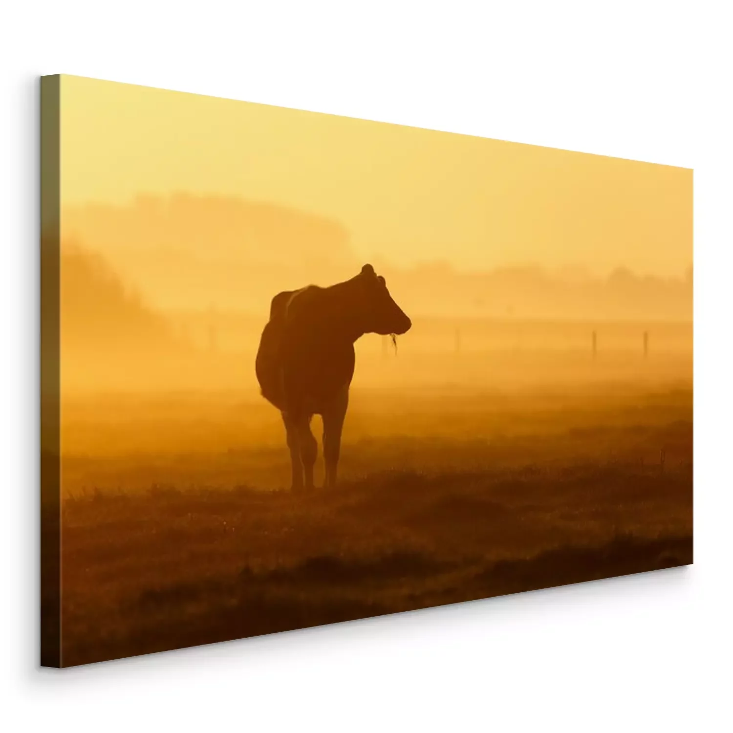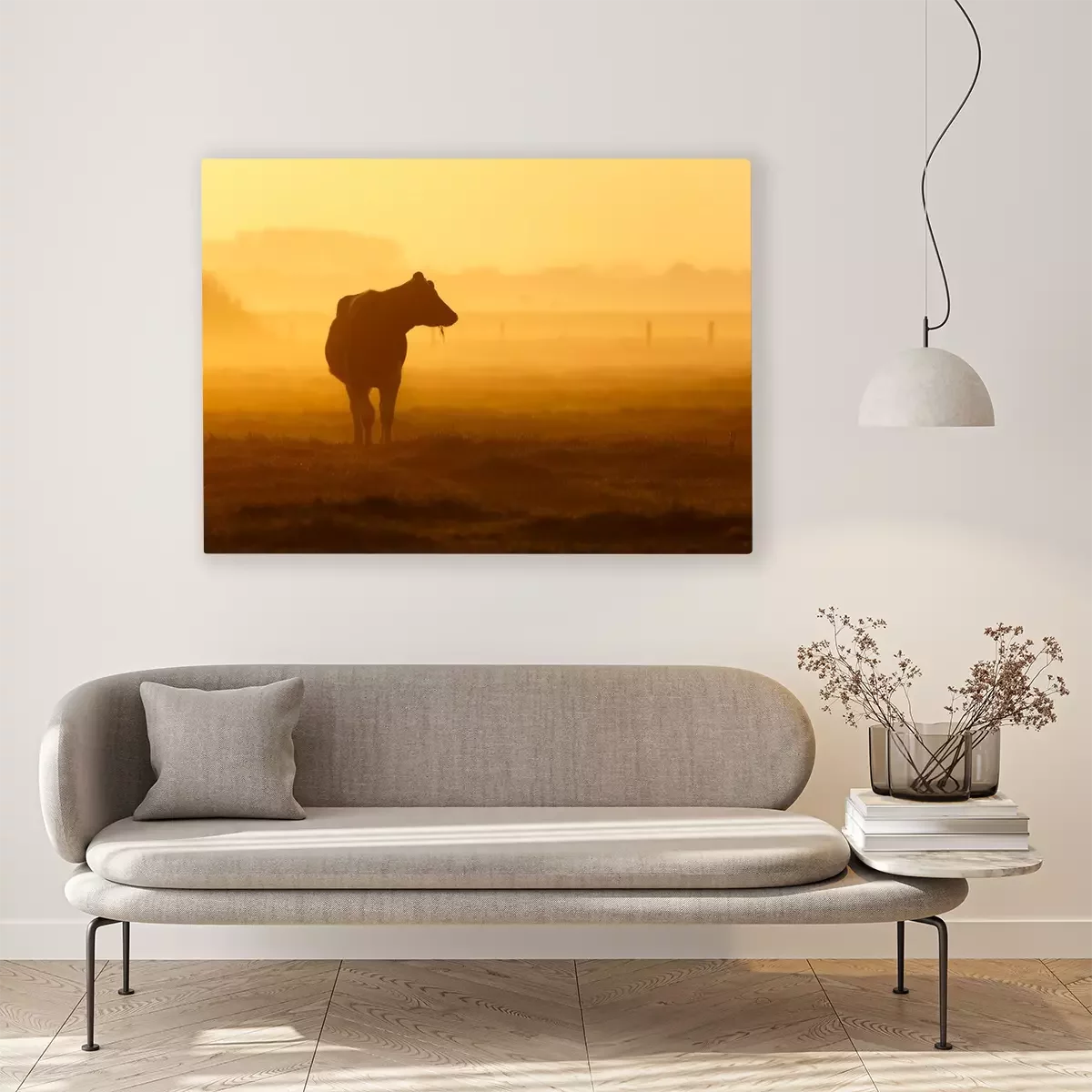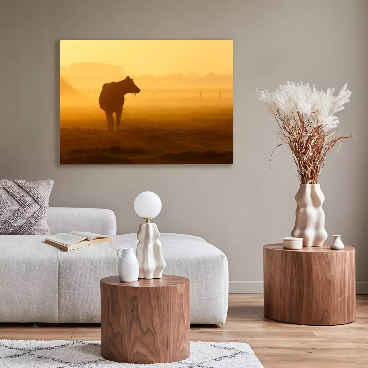 Bild Silhouette einer Kuh auf einem nebligen Feld
