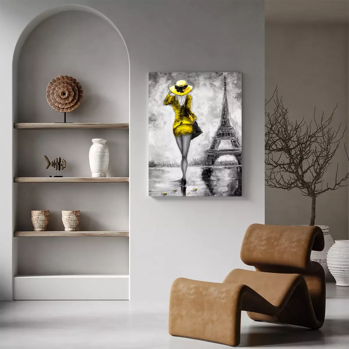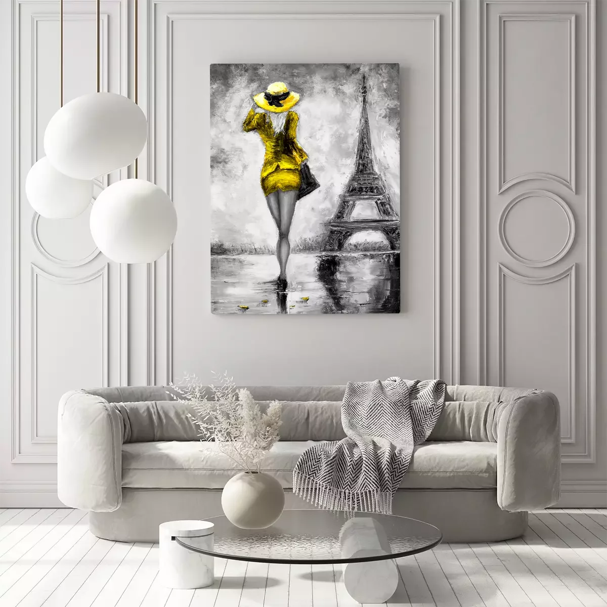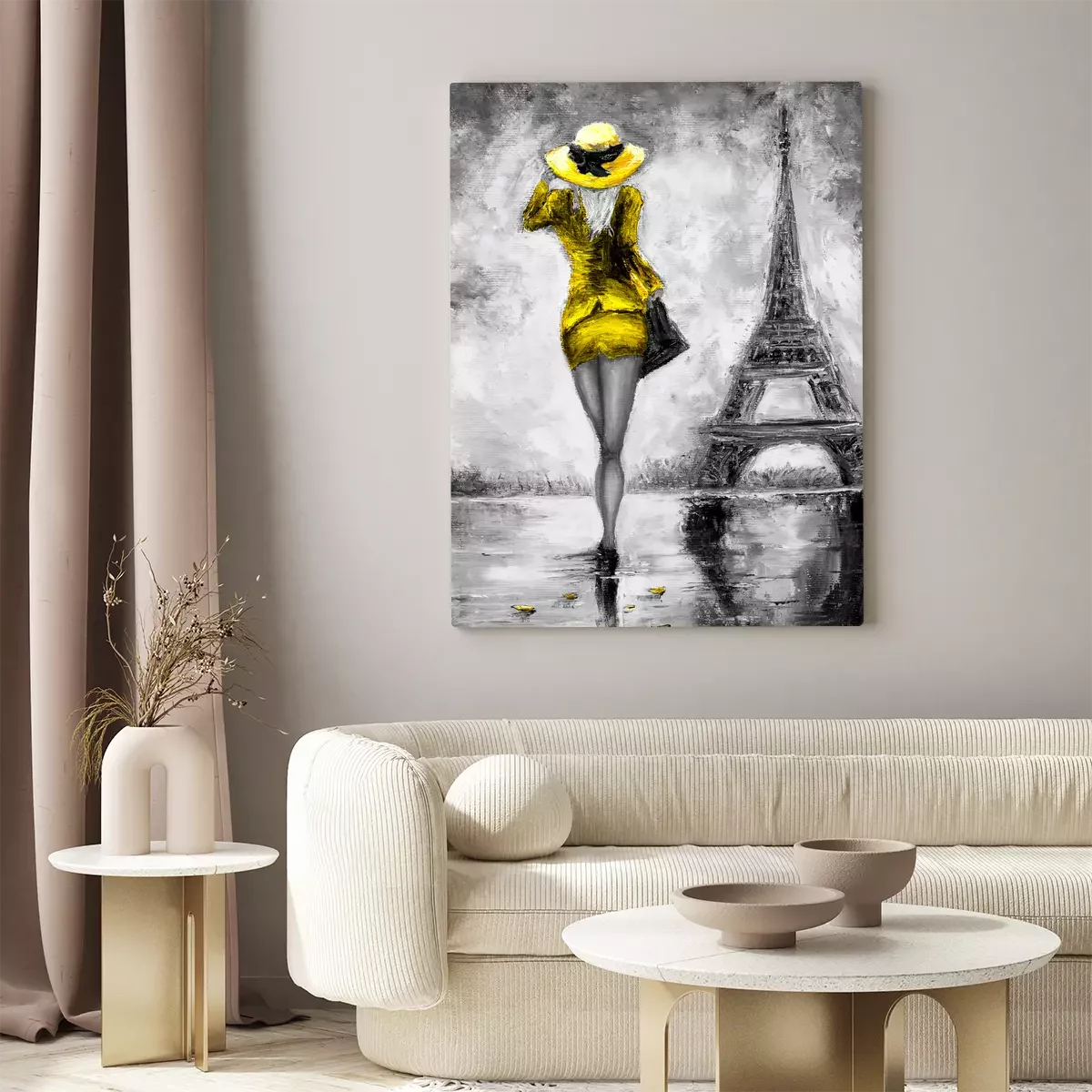 Skizze einer frau in kleid und hut vor dem hintergrund des eiffelturms
