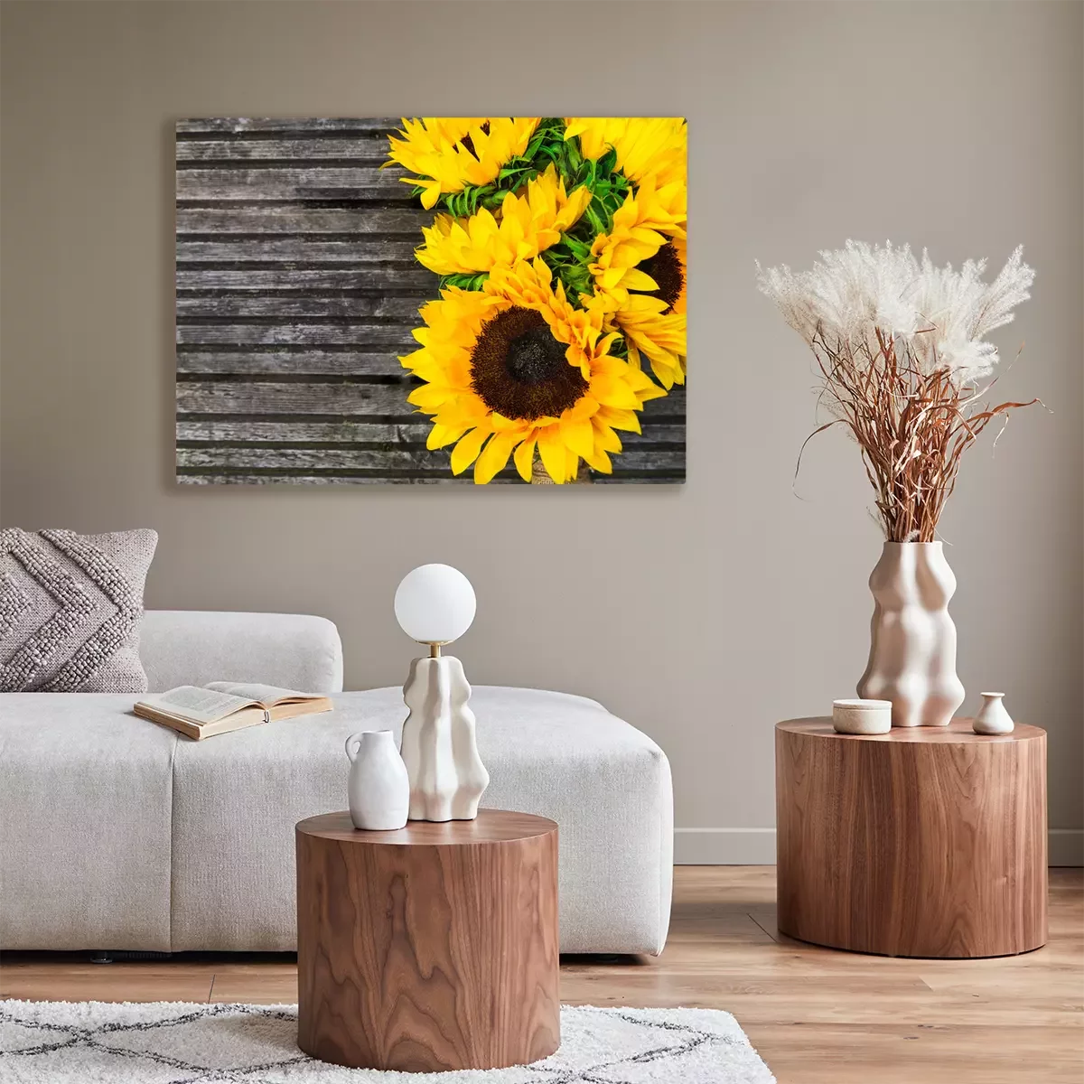 Sonnenblumen und rustikales Holz