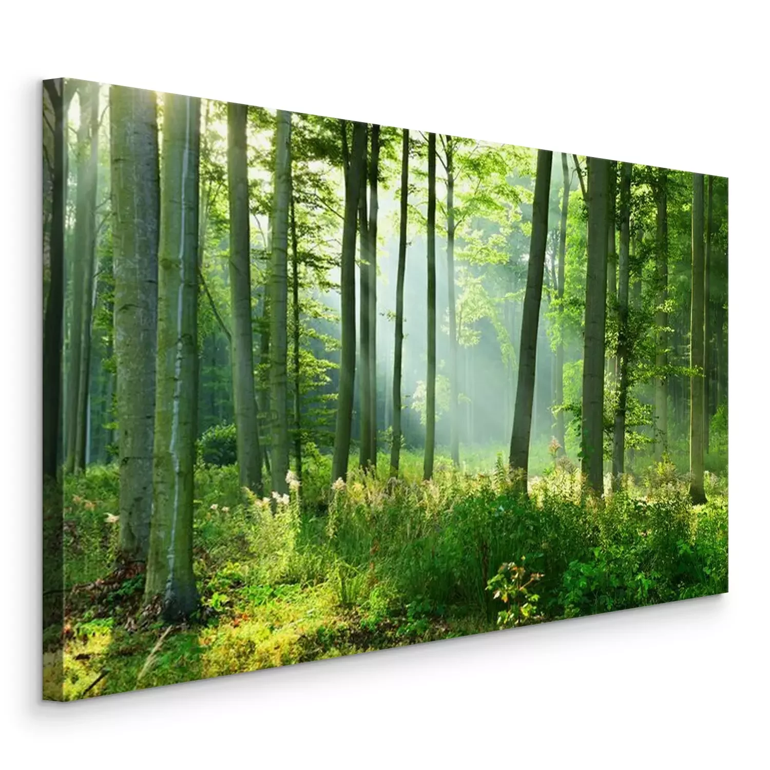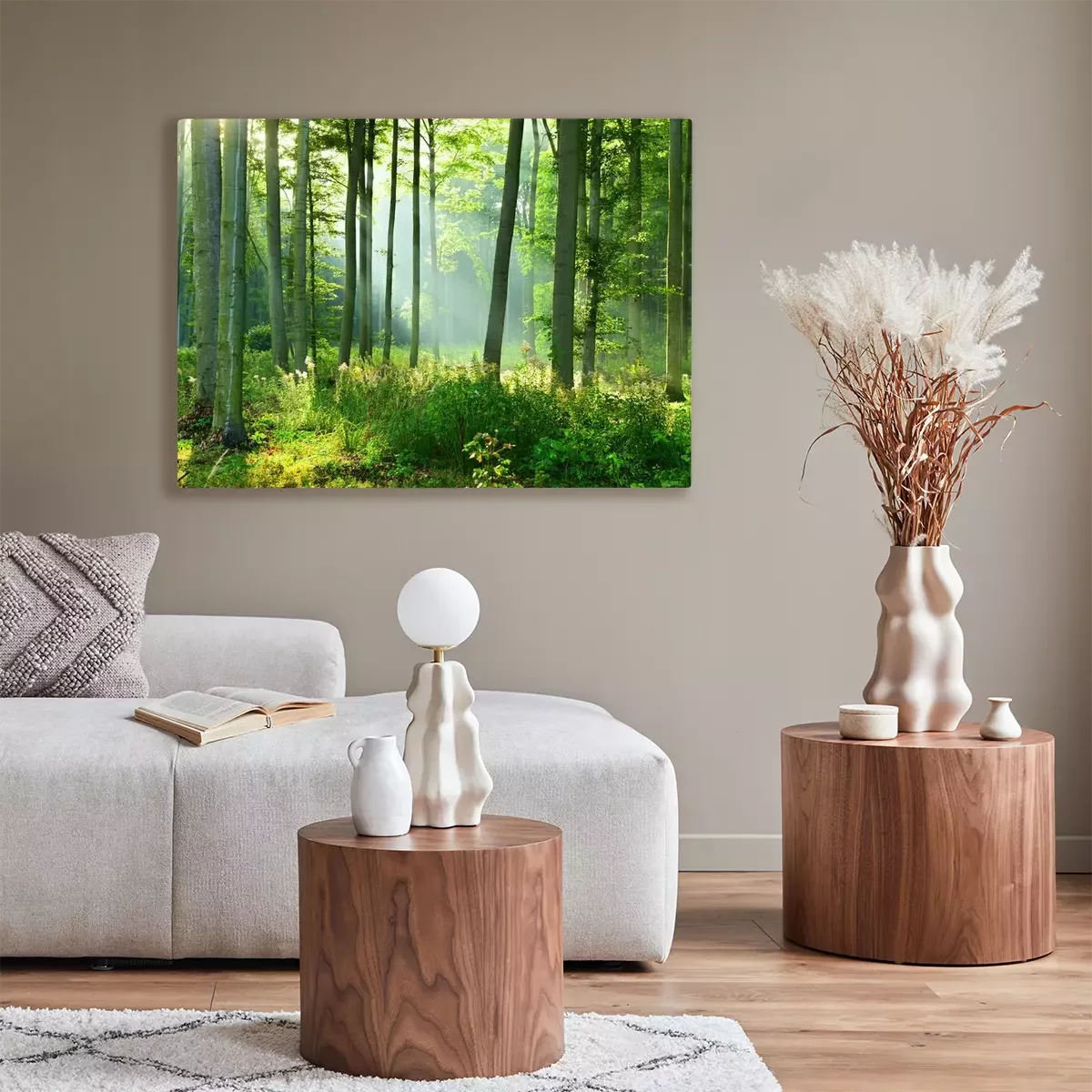 Waldlandschaft mit Sonnenstrahlen zwischen den Bäumen