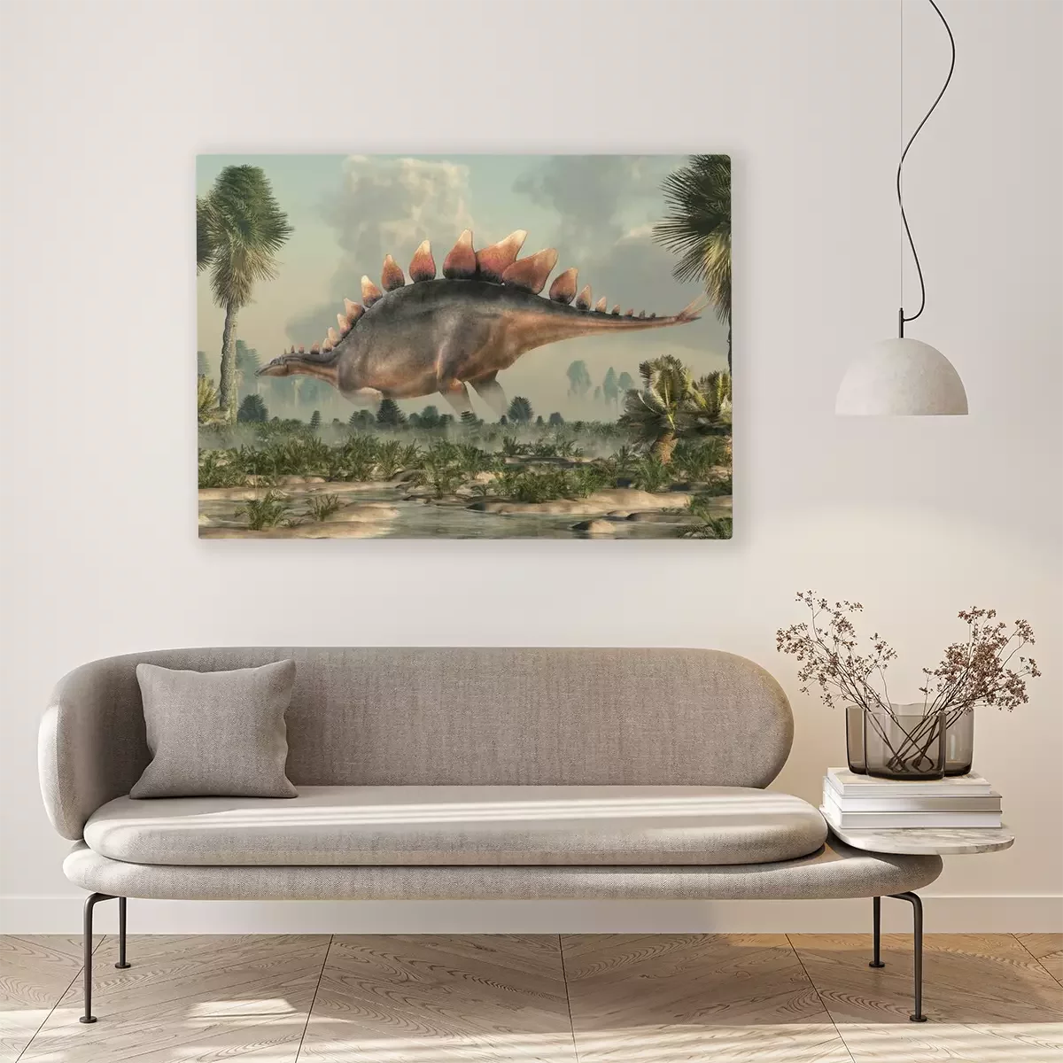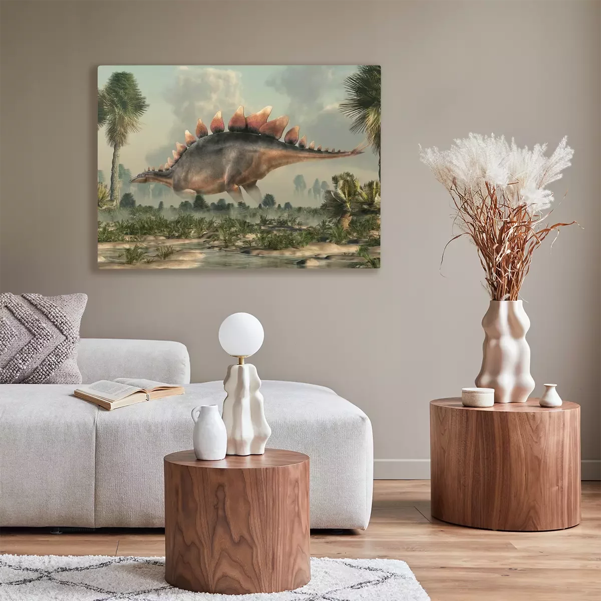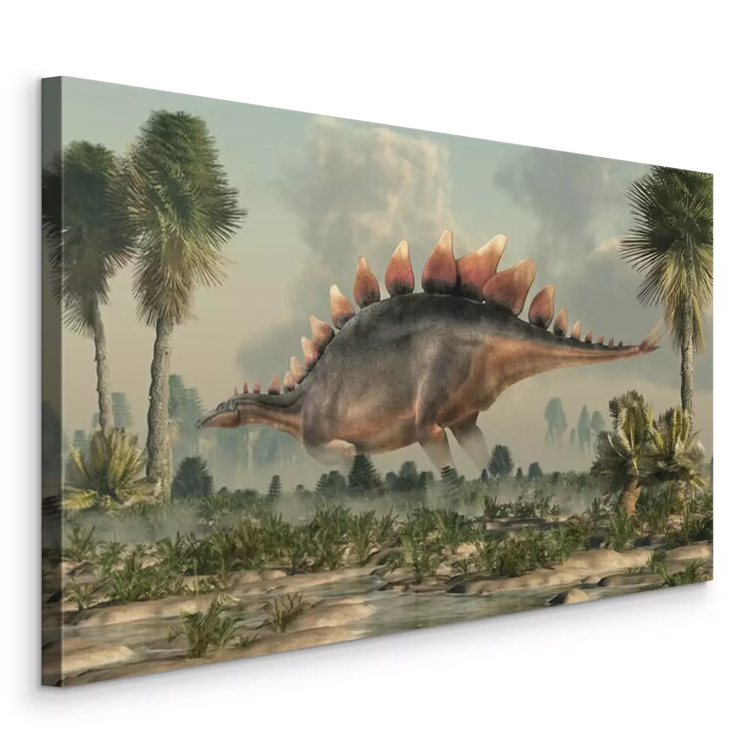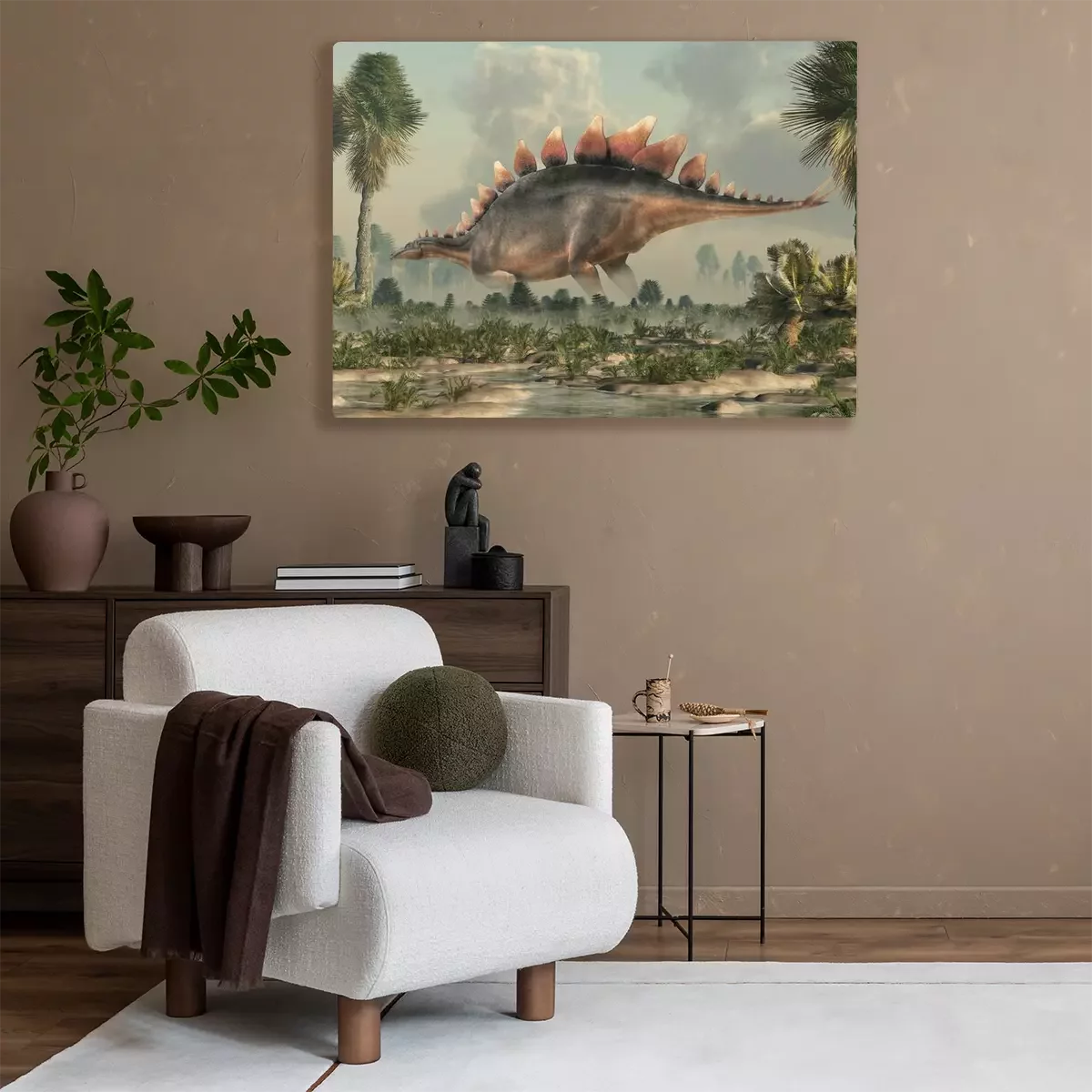 Bild Stegosaurus, was a thyreophoran dinosaur. An herbivore, it is one of the best known dinosaurs of the Jurassic period. Here, a grey and brown one is standing in profile in a wetland. 3D Rendering.