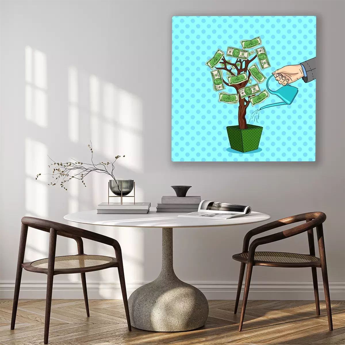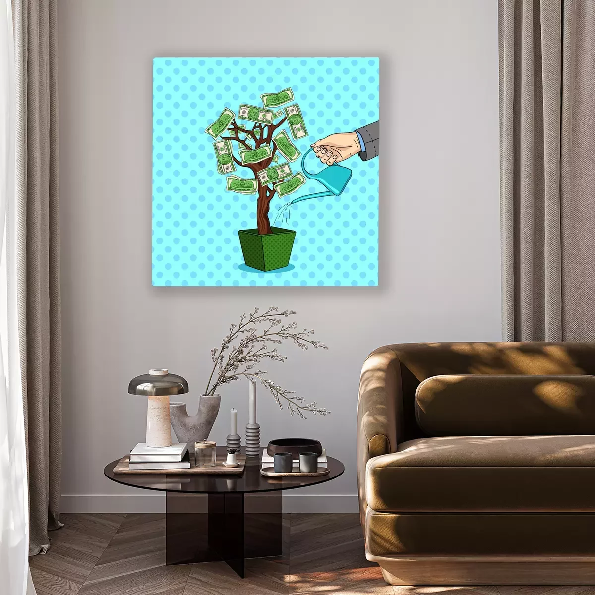 Bild Style comics raster pop art. A mans hand pours a money tree with green dollars. Watering can with water.