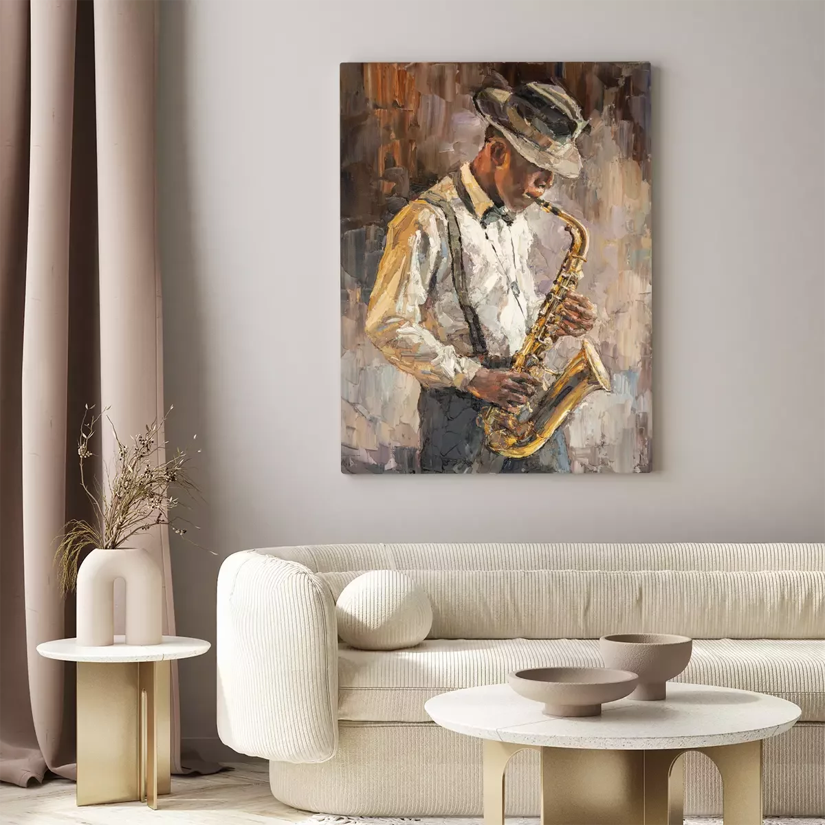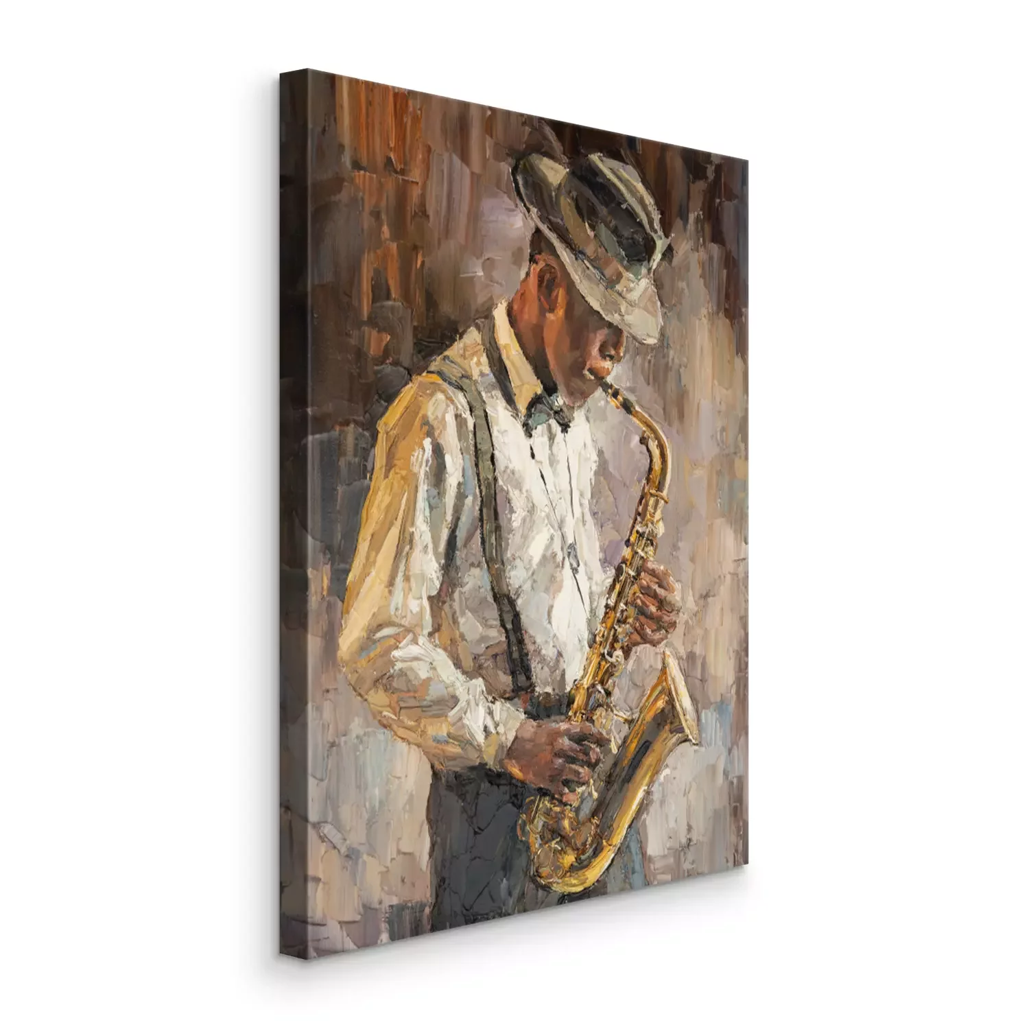 Bild Stylish jazz band playing music on the scene, background is brown. Palette knife technique of oil painting and brush. .The jazzman plays the sexophone.