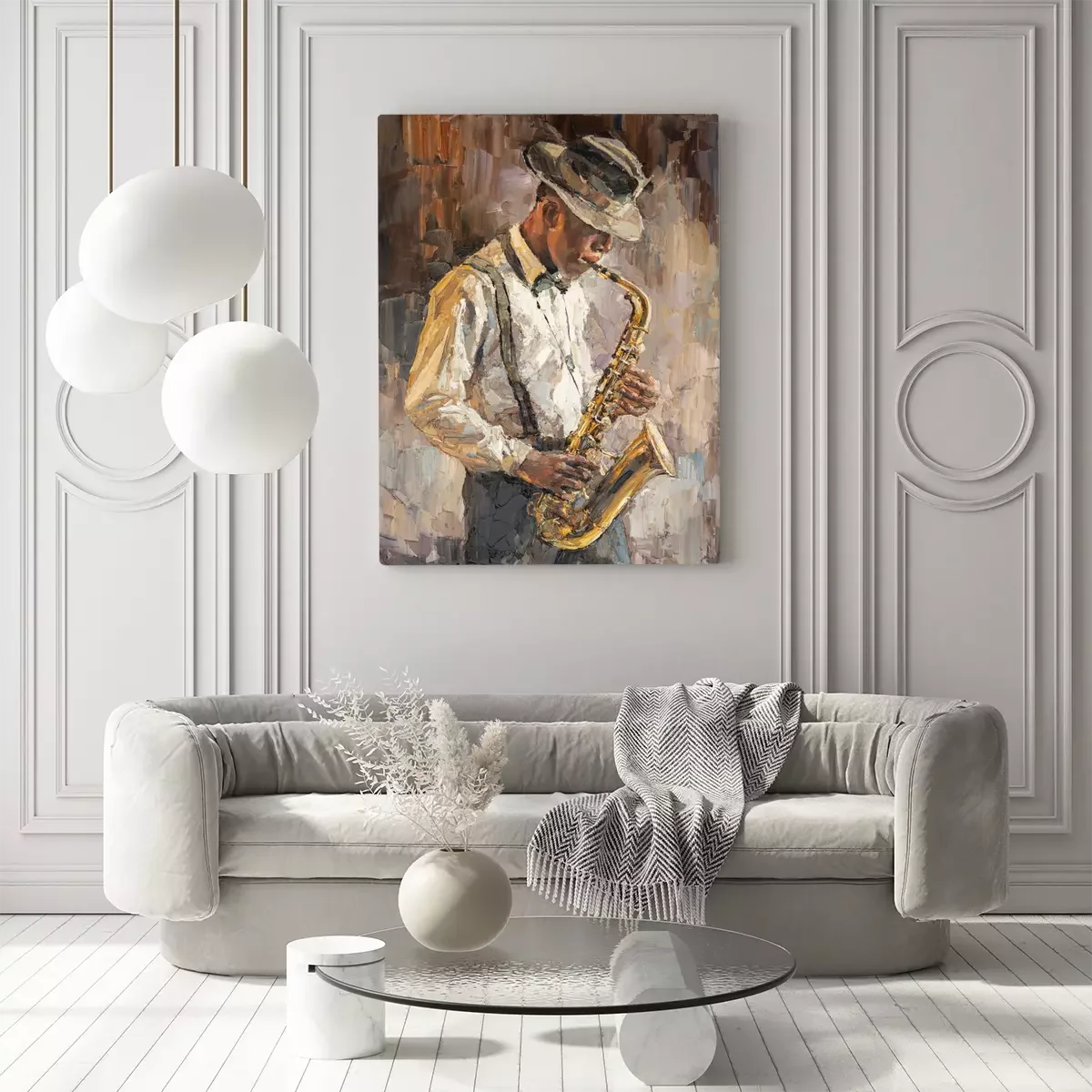 Bild: Stylish jazz band playing music on the scene, background is brown. Palette knife technique of oil painting and brush. .The jazzman plays the sexophone.