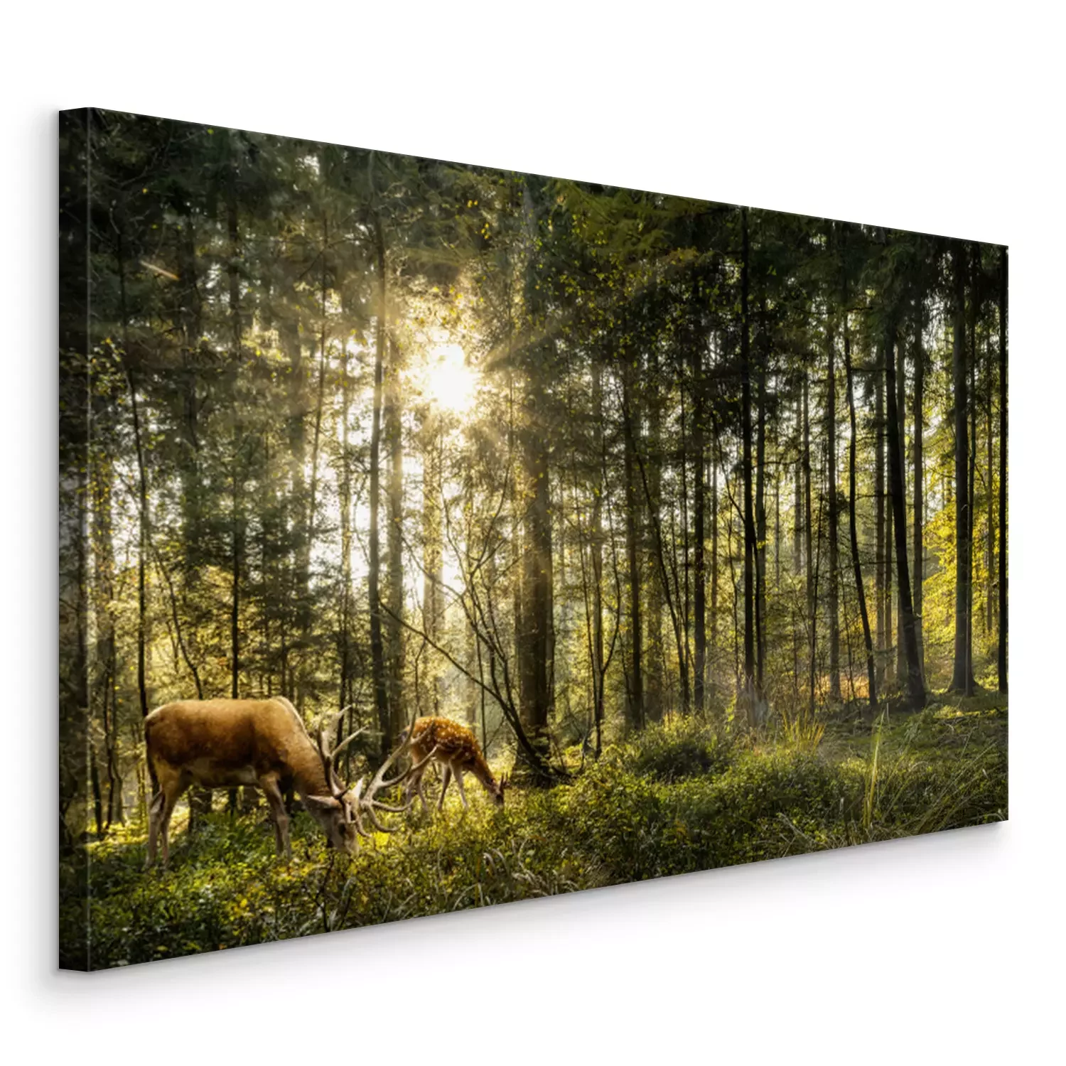 Bild Sun is shining in forest and roe deer are grazing in beautiful forest