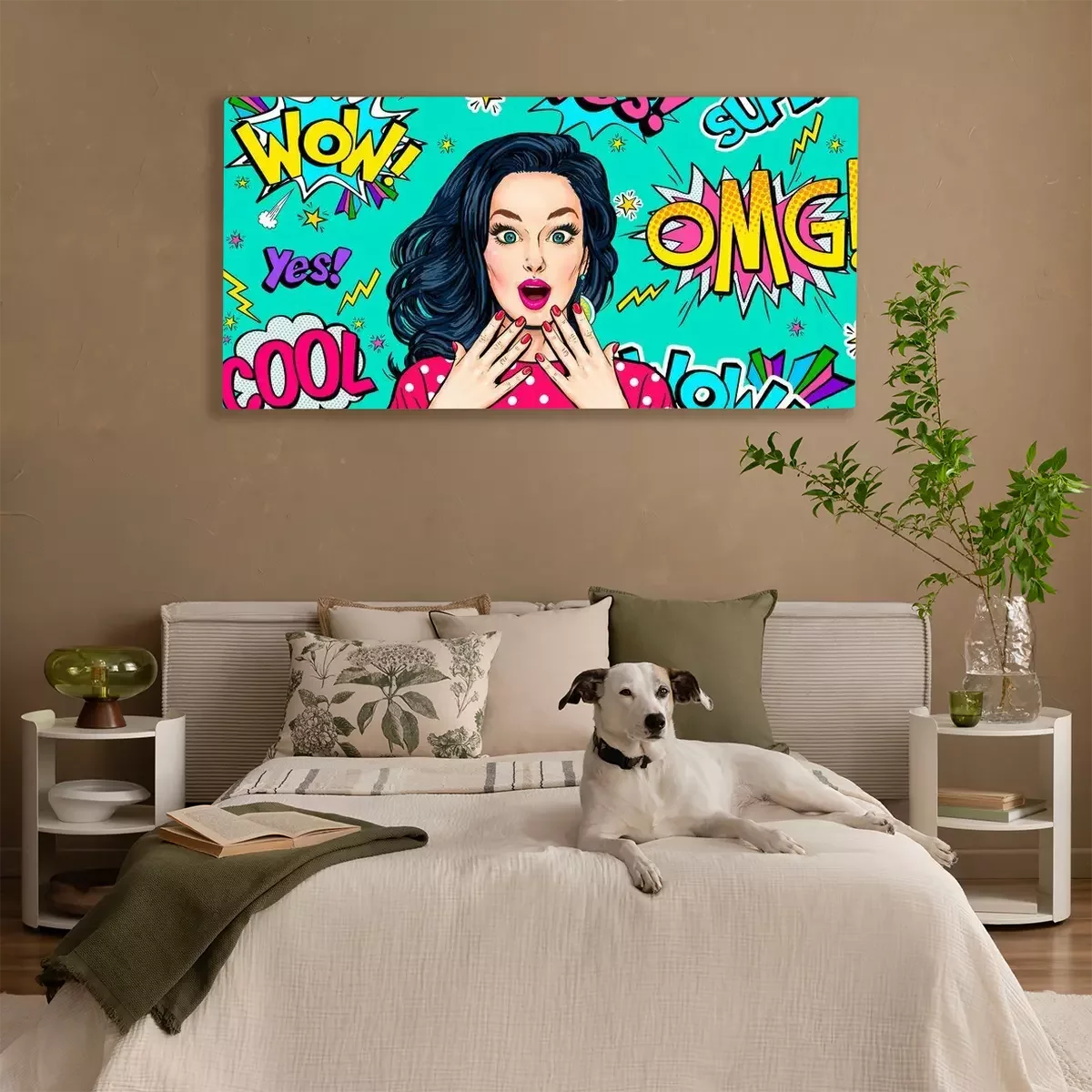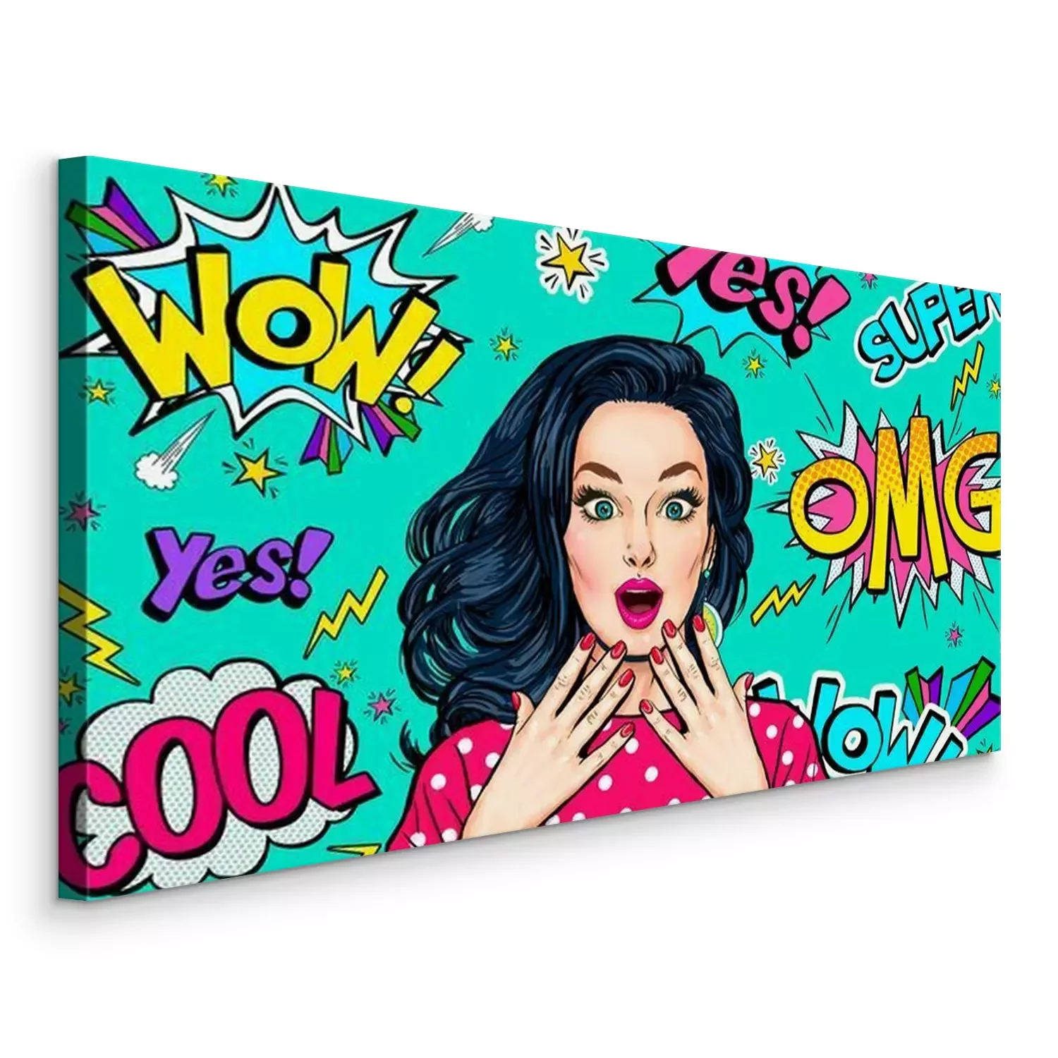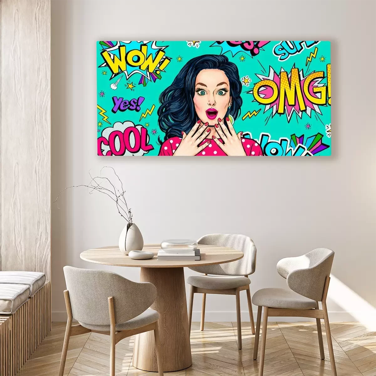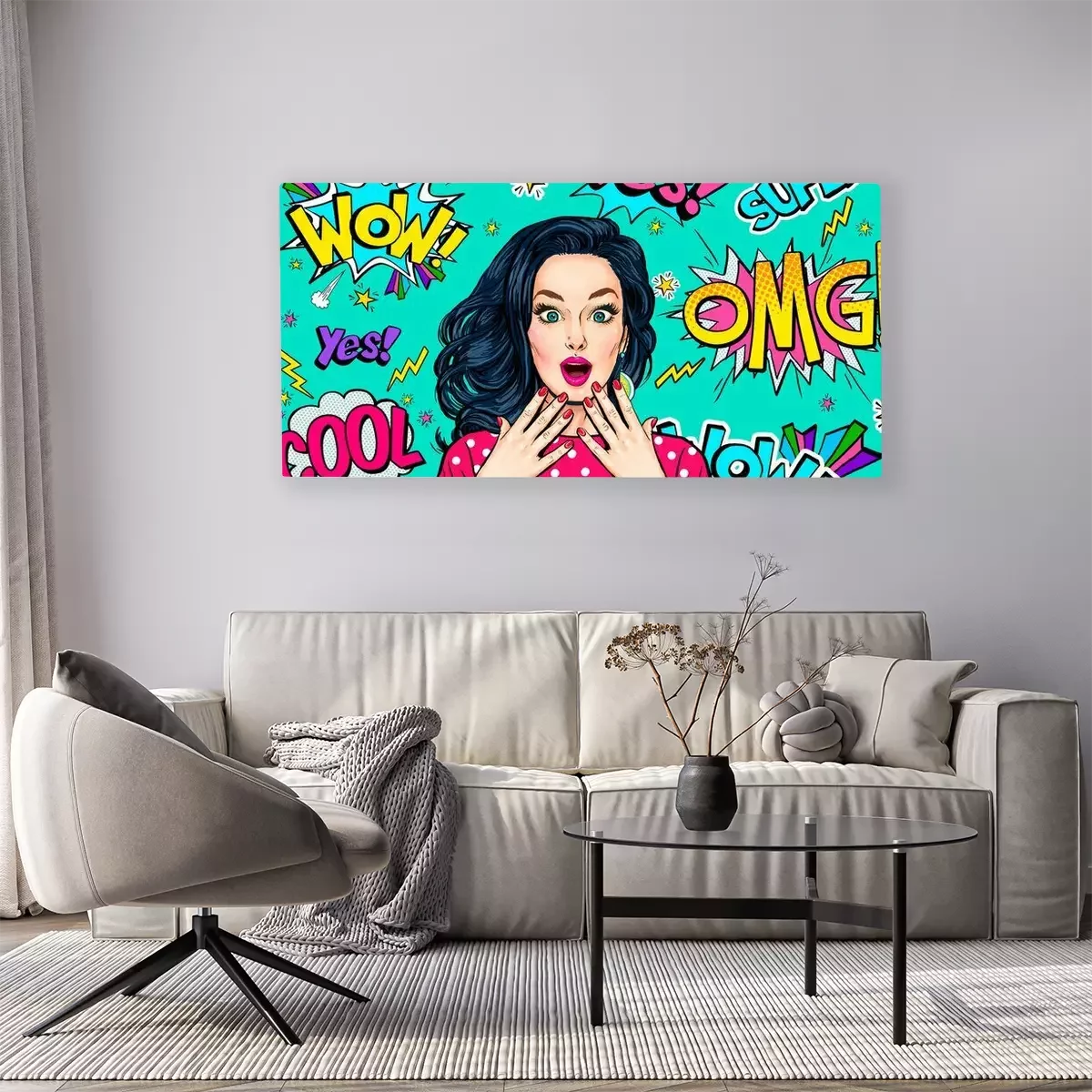 Bild Surprised  woman on Pop art  background . Advertising poster or party invitation with sexy club girl with open mouth in comic style. Presenting your product. Expressive facial expressions