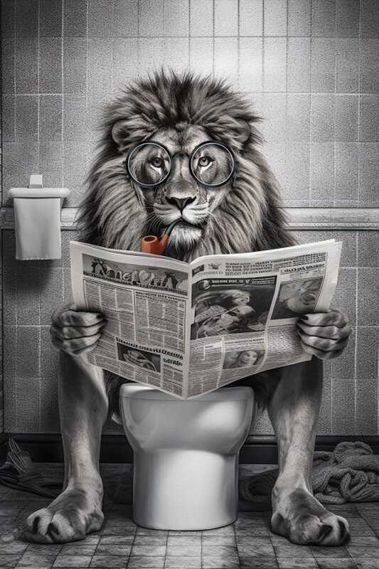Bild: Surreales Gemälde eines Löwen auf einer Toilette mit einer Zeitung