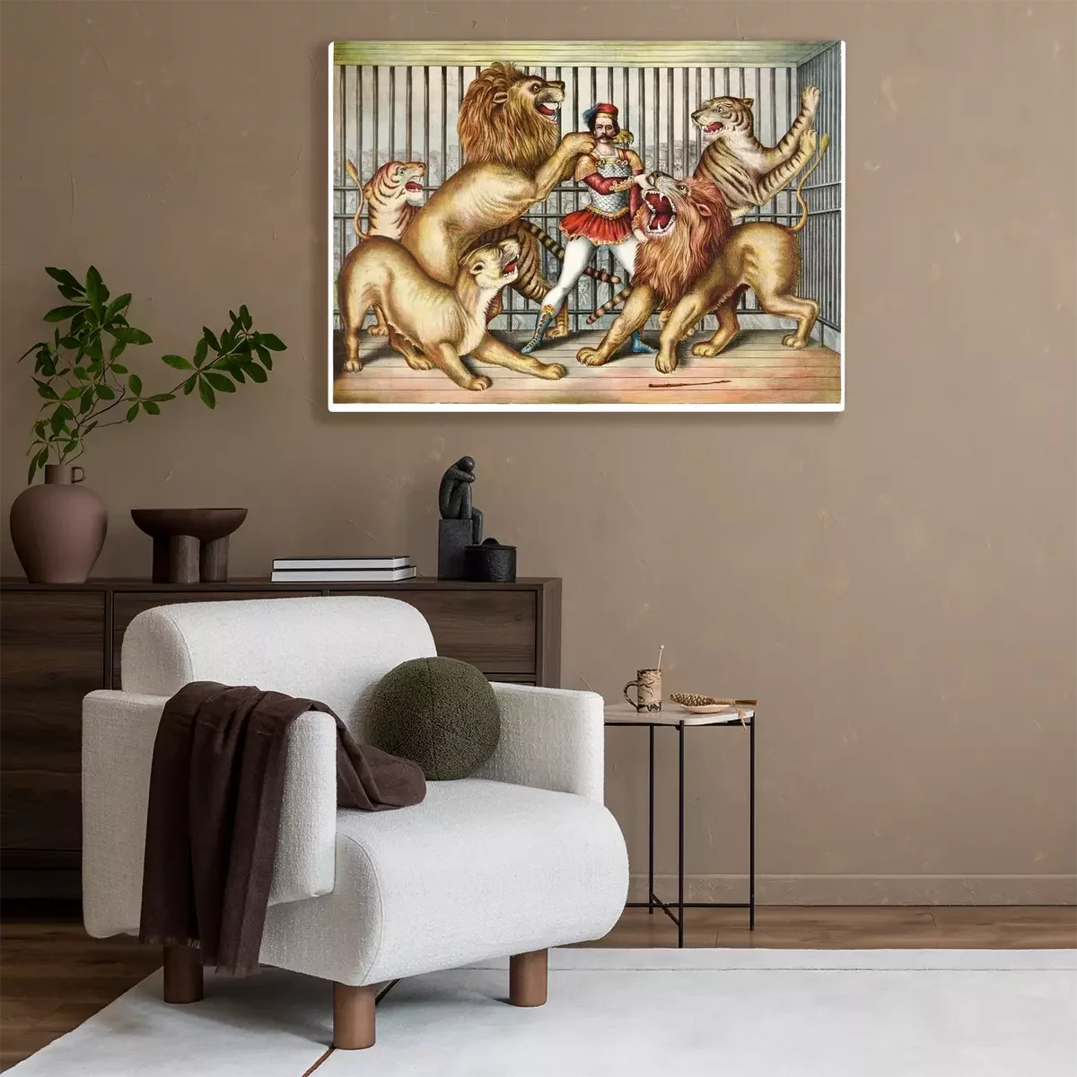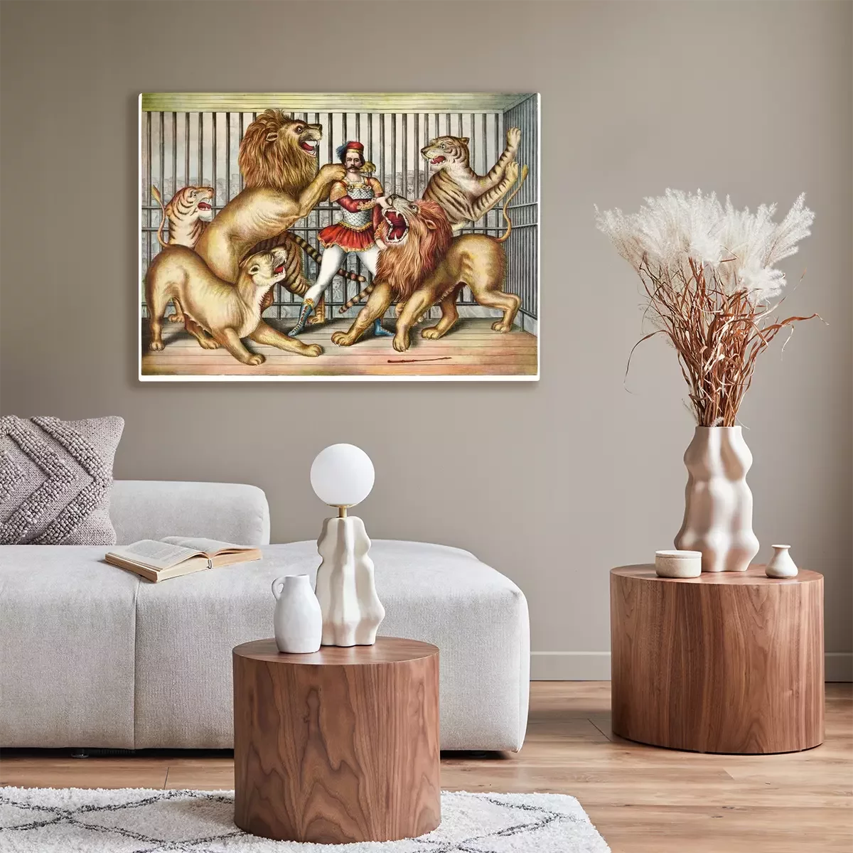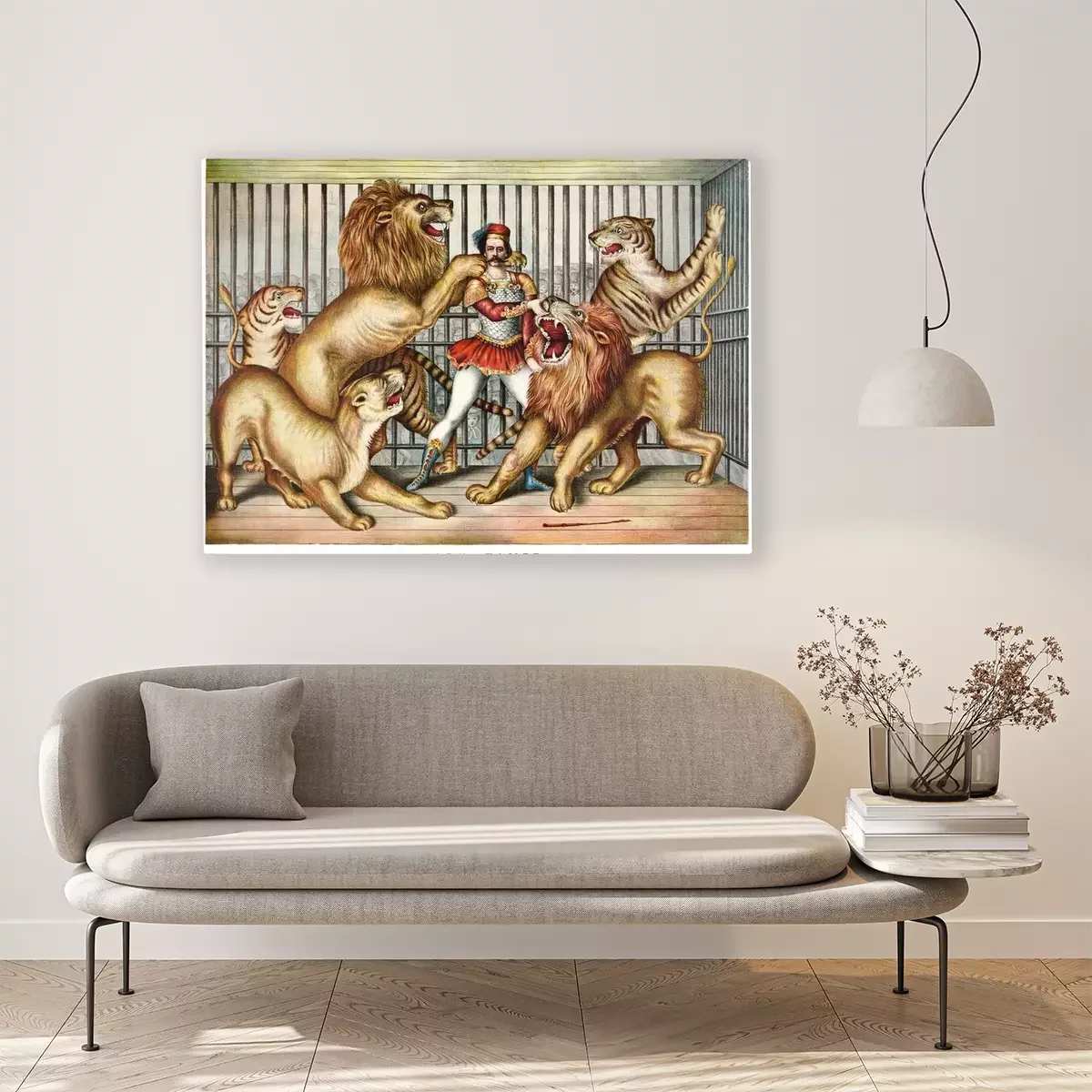 Bild: Tapferer Löwe zahmer umgeben von hungrigen Tieren in einem Käfig. Alte Abbildung durch nicht identifizierten Autor, publ. in Cincinnati, 1873