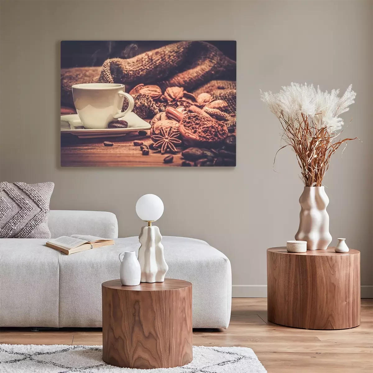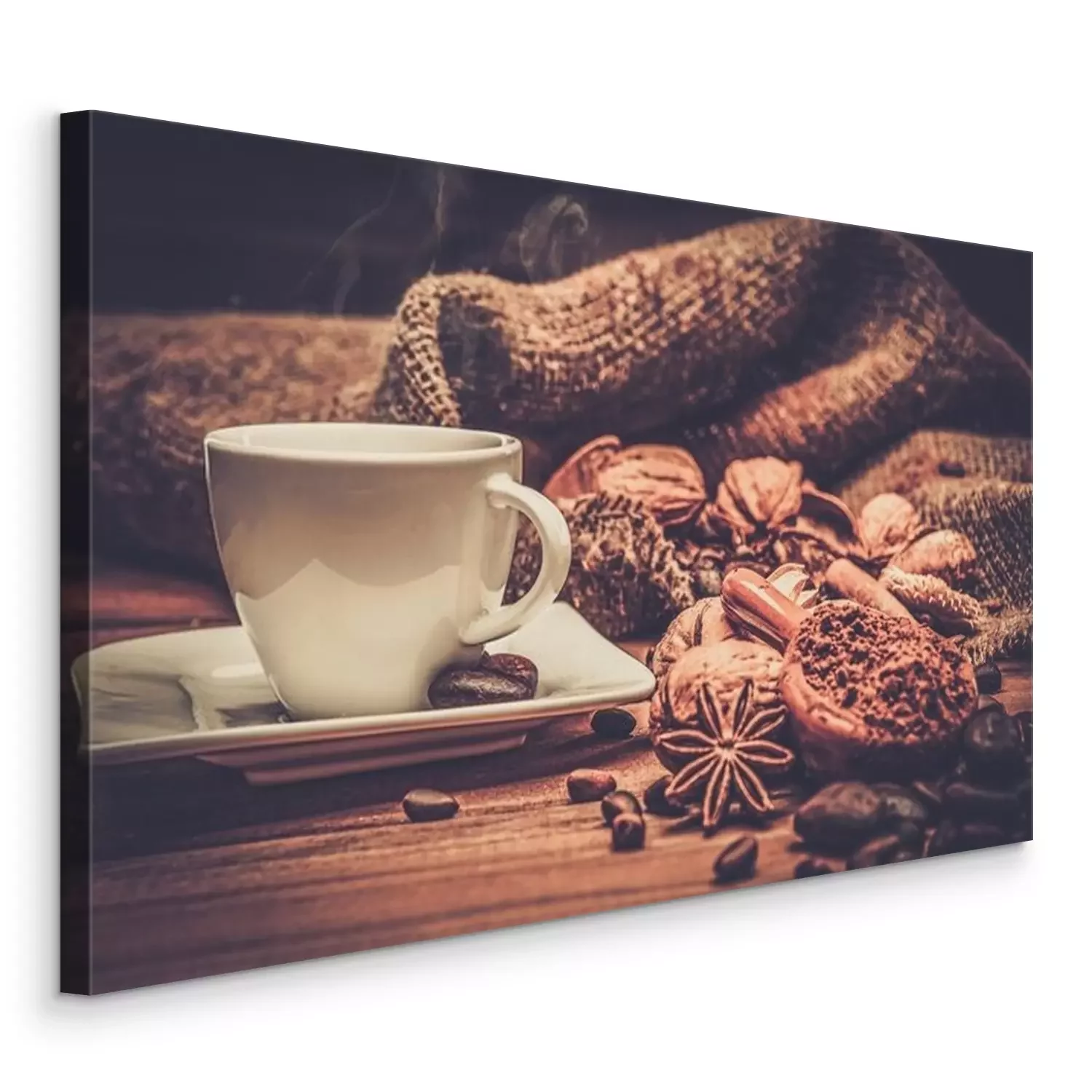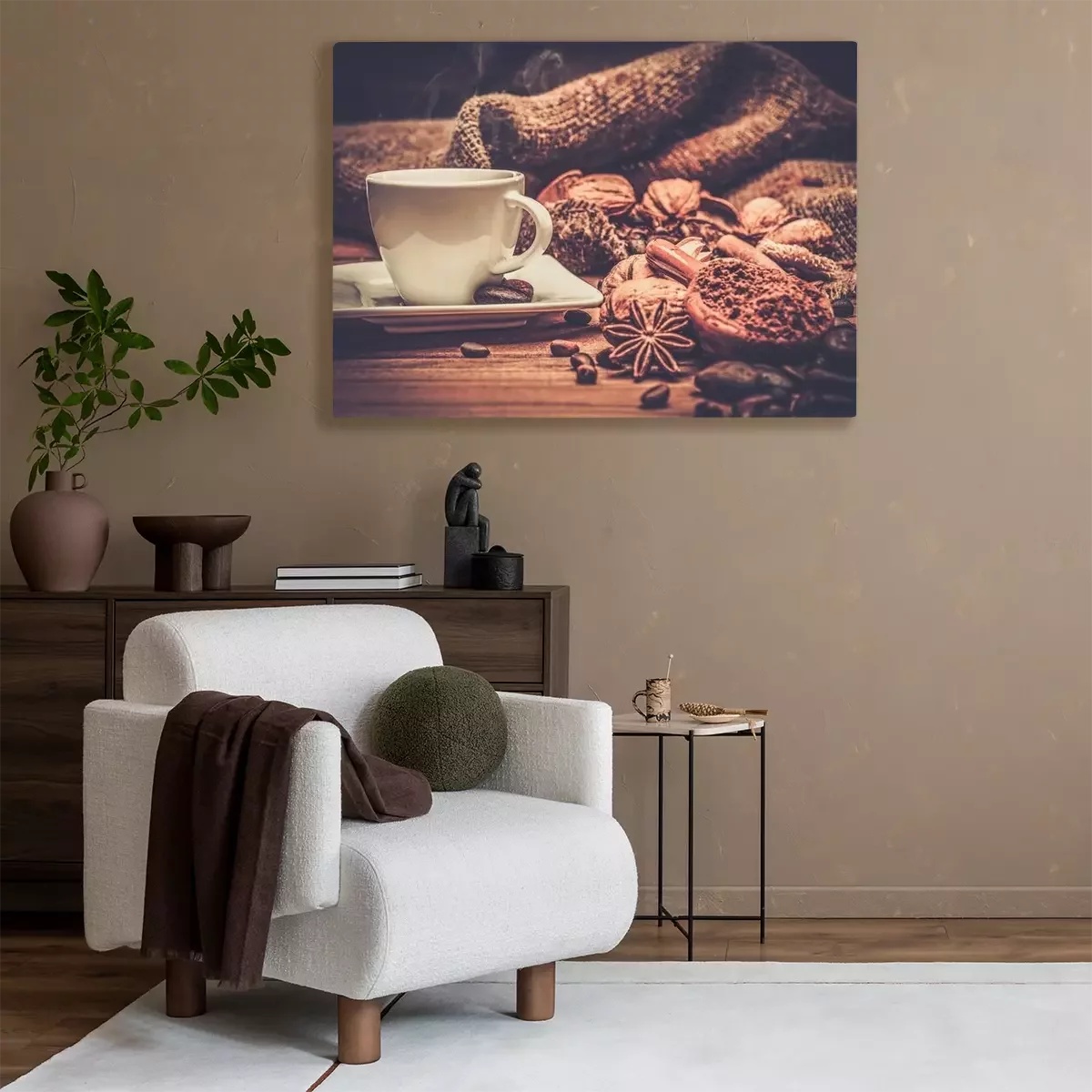 Kaffeebohnen inmitten von Zimt und Nüssen