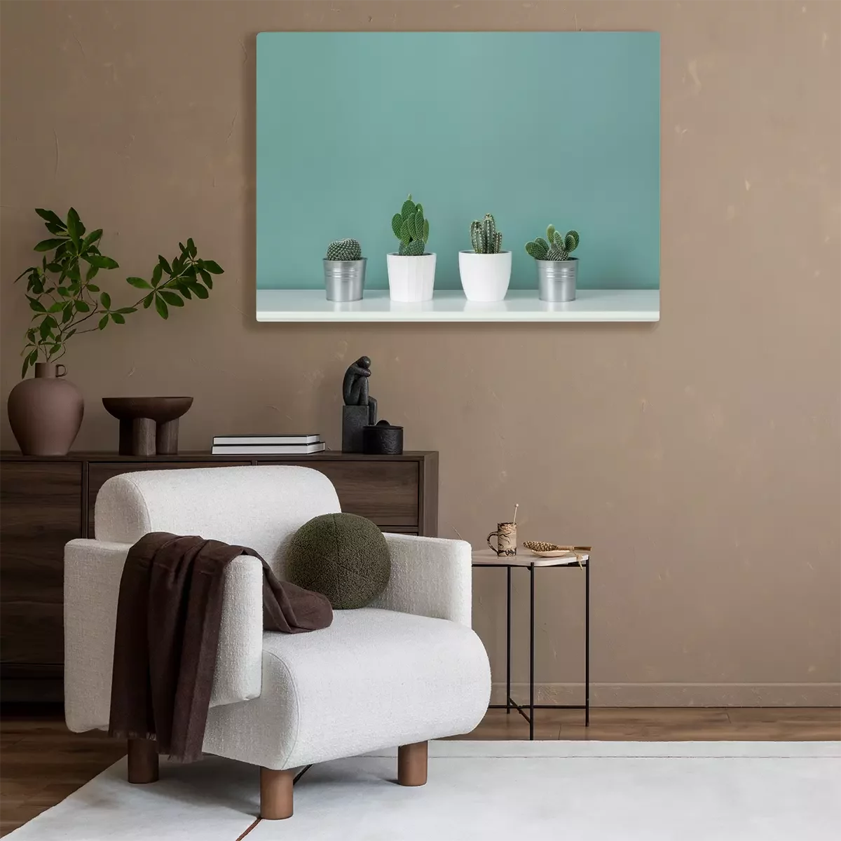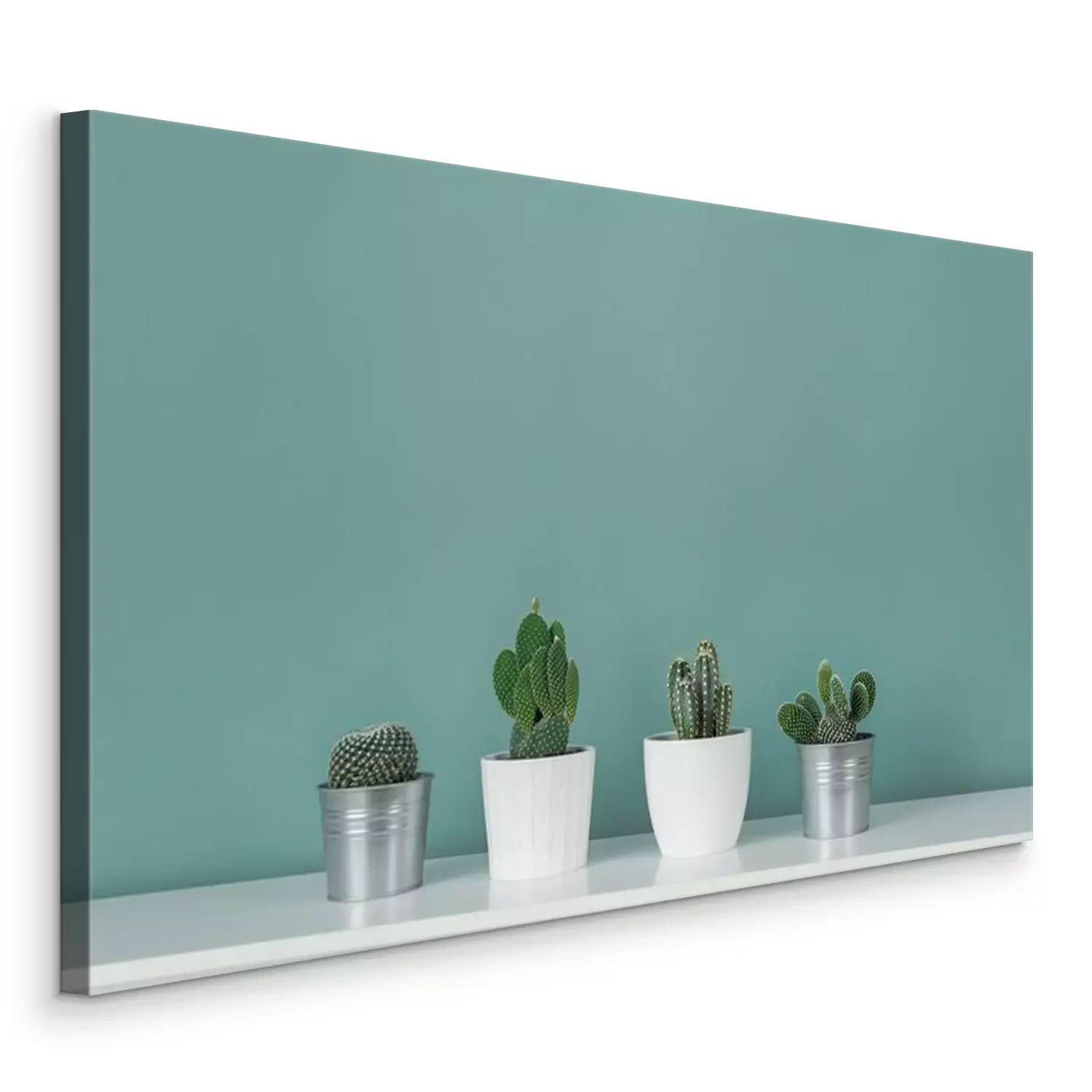 Moderne Raumdekoration.  Sammlung verschiedener Topfkaktus-Zimmerpflanzen auf weißem Regal gegen pastellfarbene türkisfarbene Wand.  Kaktuspflanzen Banner.