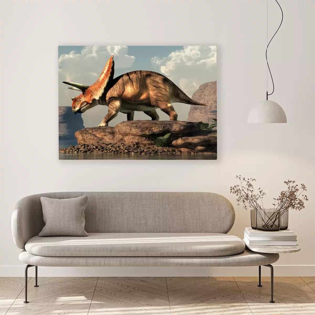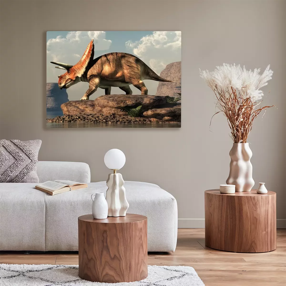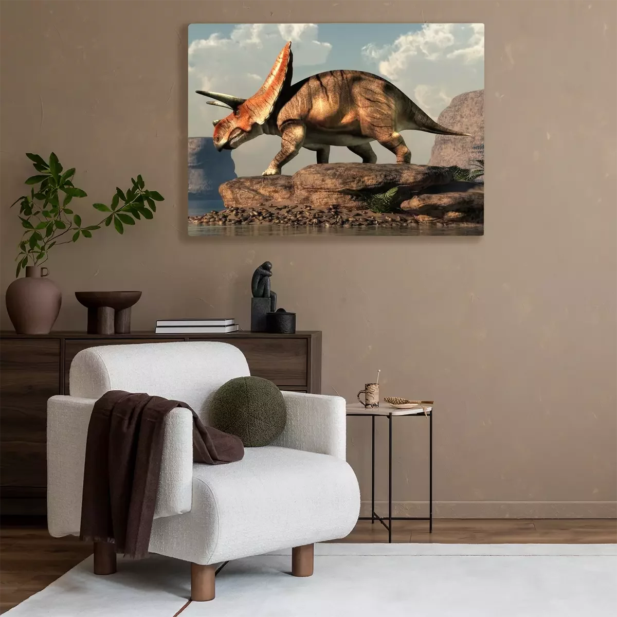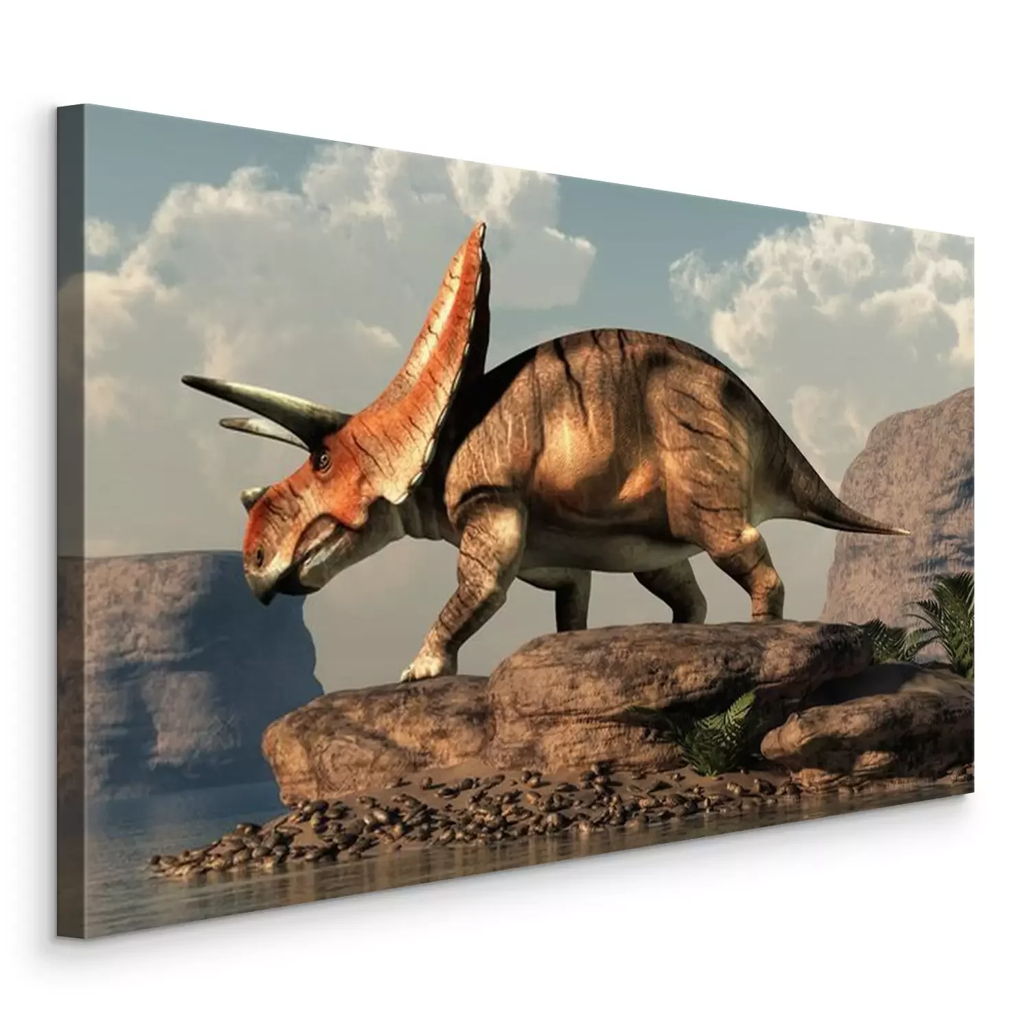 Bild Torosaurus auf einem Felsen am See