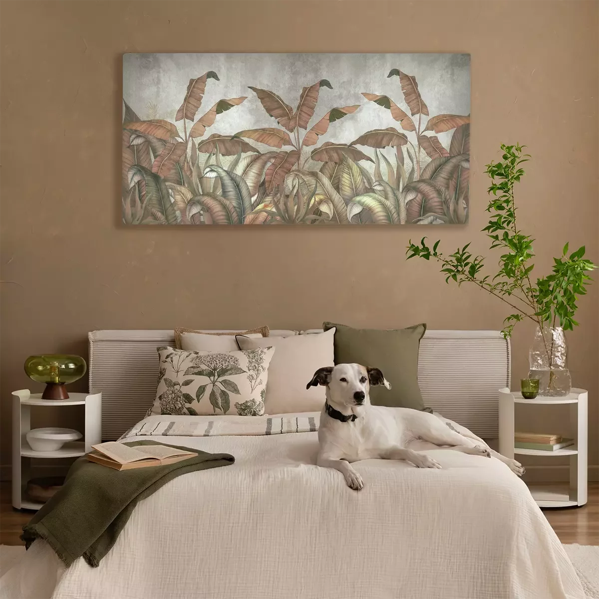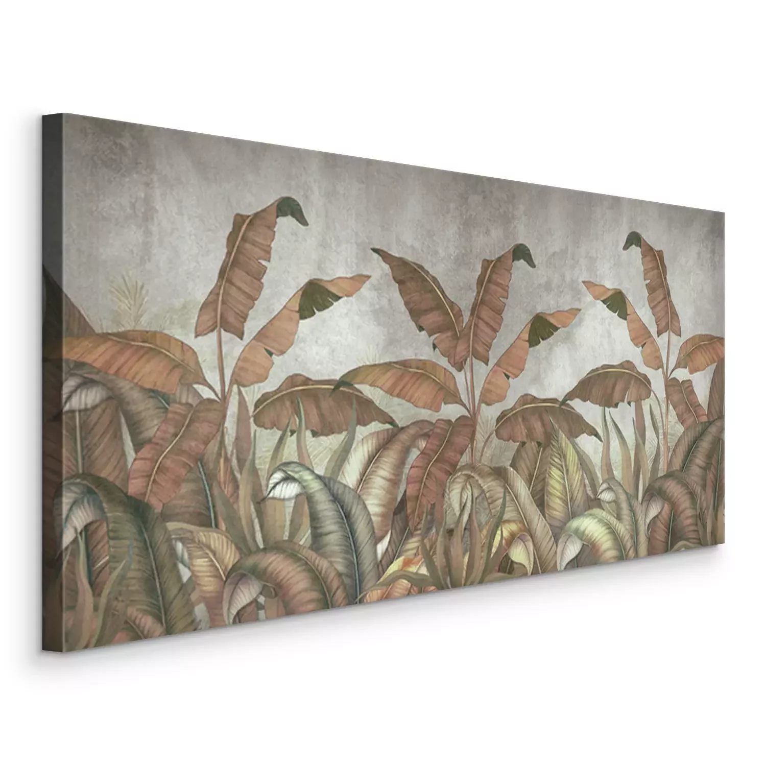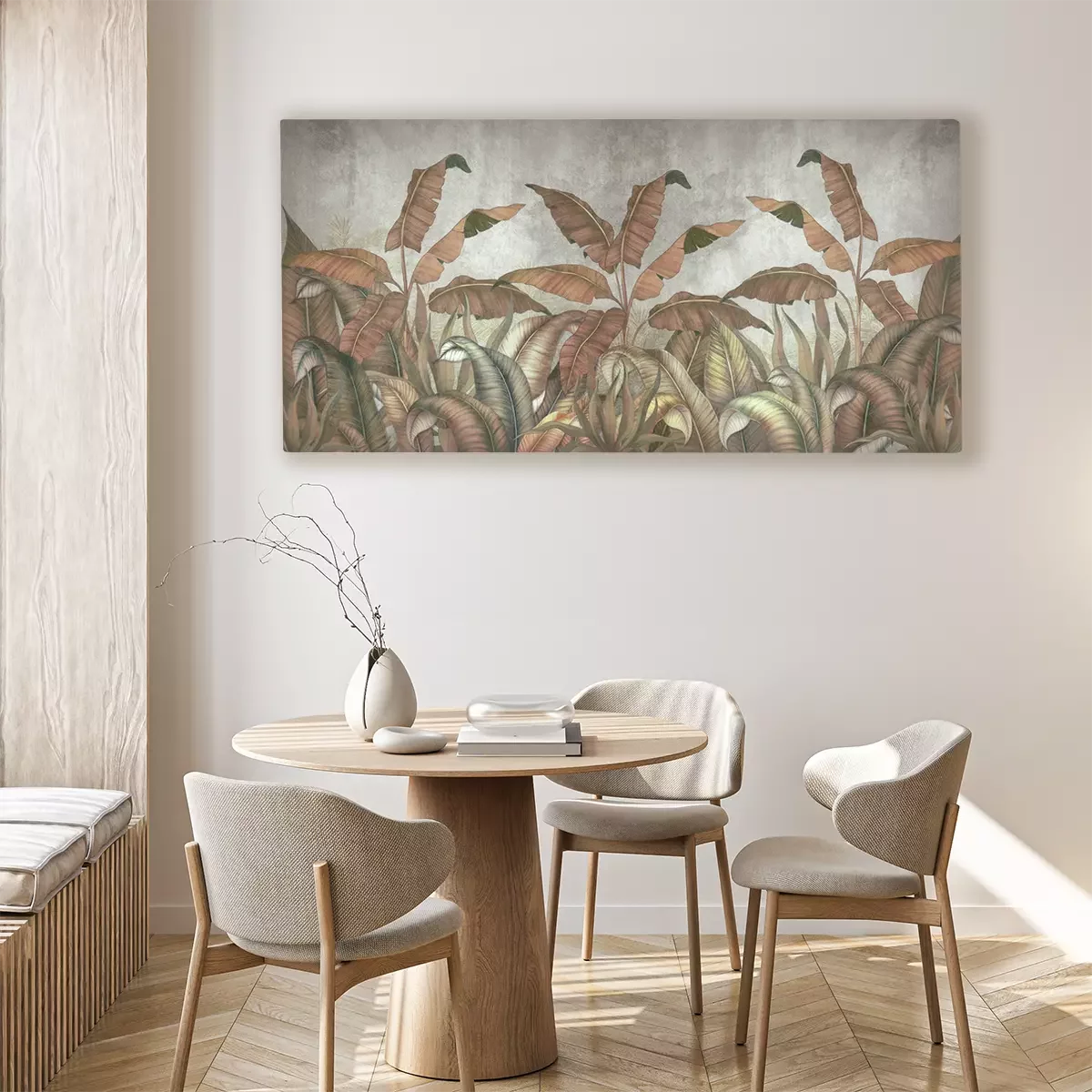 Bild: Tropical leaves on a gray background. Photo wallpaper with leaves. Fresco for the interior. Wall decor in grunge style. Painted leaves. Photo wallpapers 3d.
