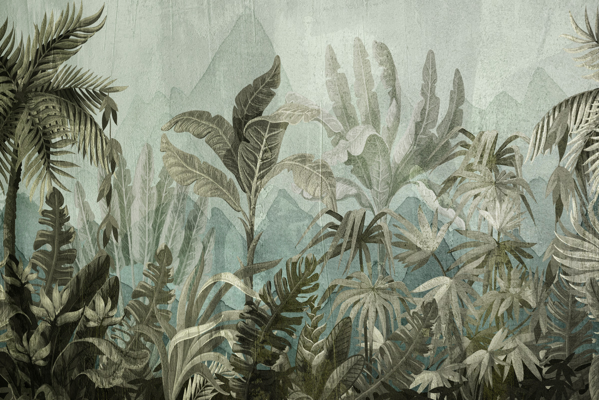 Bild: Tropische Blätter und Palmen in dunklen Grüntönen