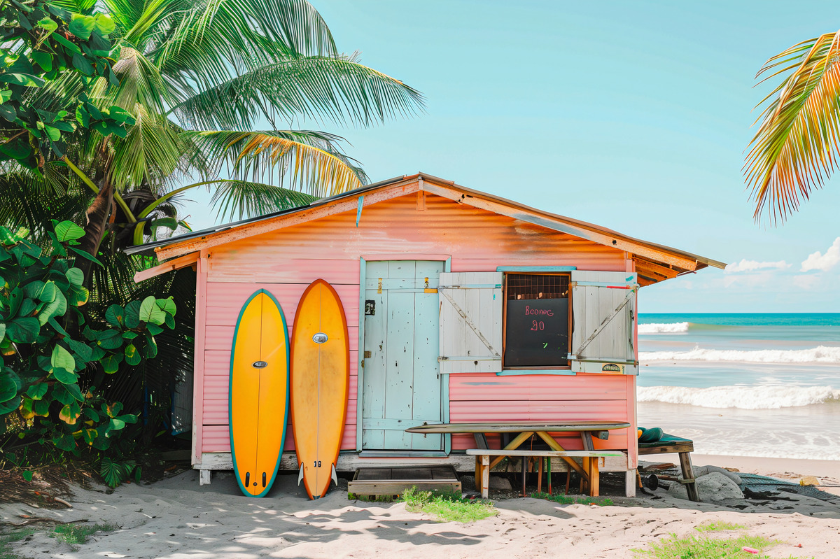 Bild: Tropisches Ferienhaus mit Palmen und dem Meer im Hintergrund