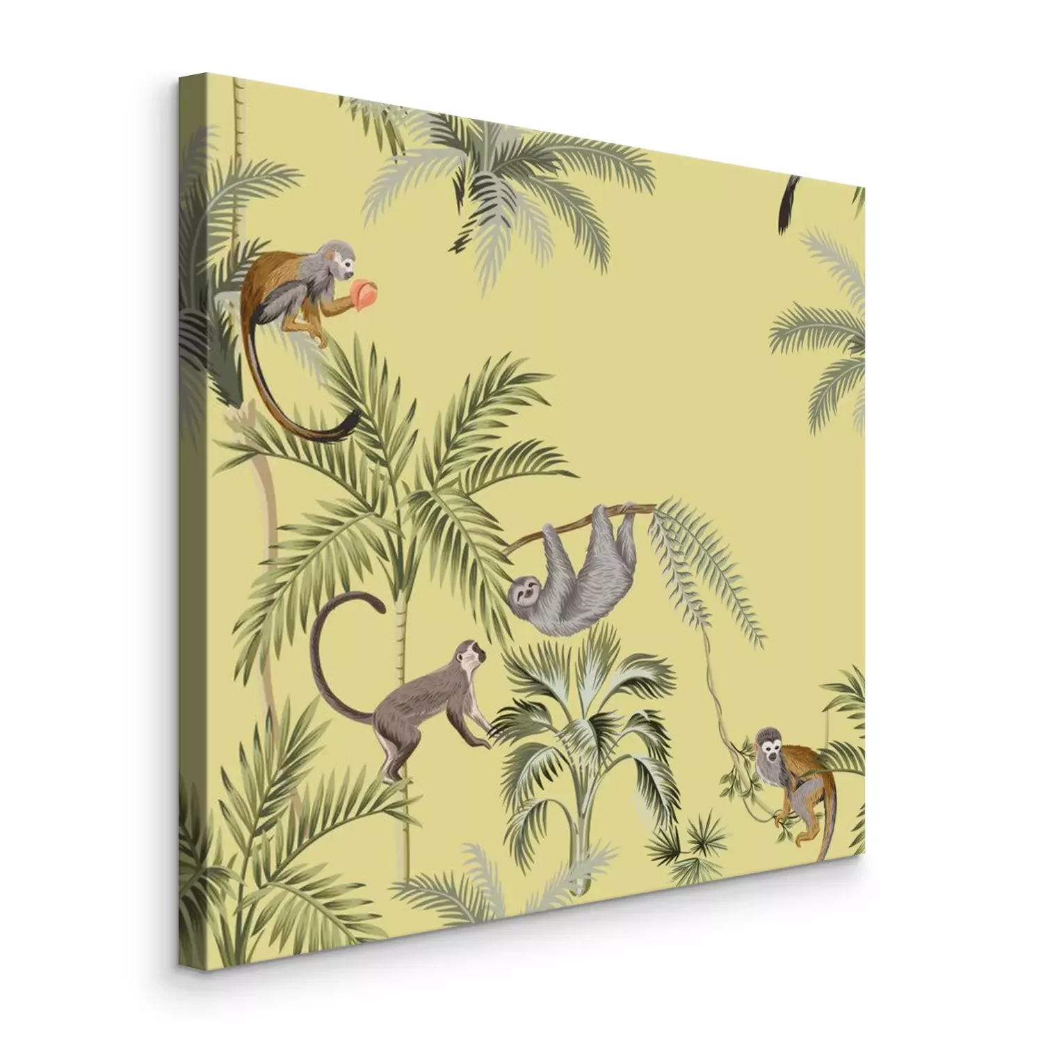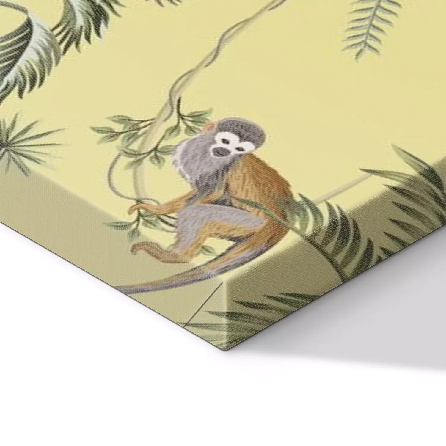 Tropical vintage monkey animal, hibiscus flower, peach fruit, palm leaves floral seamless pattern black background. Exotic jungle wallpaper.