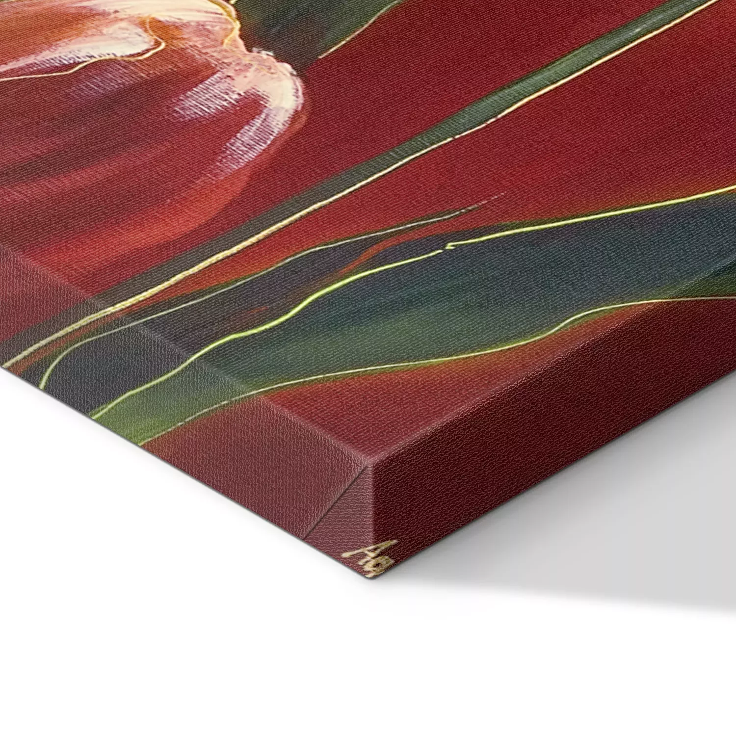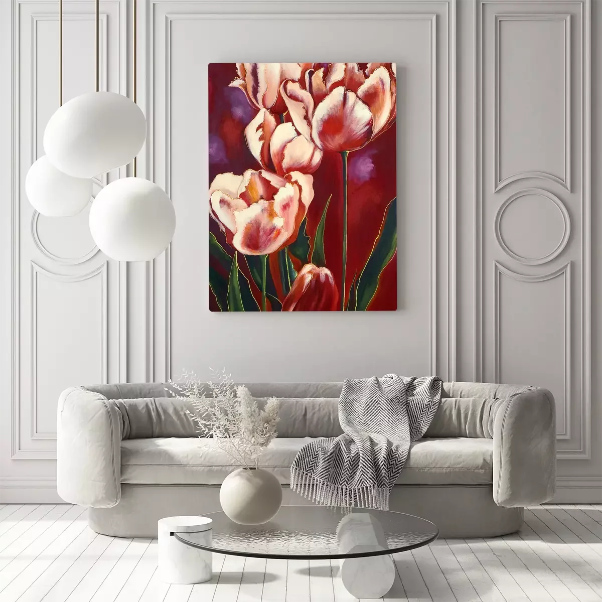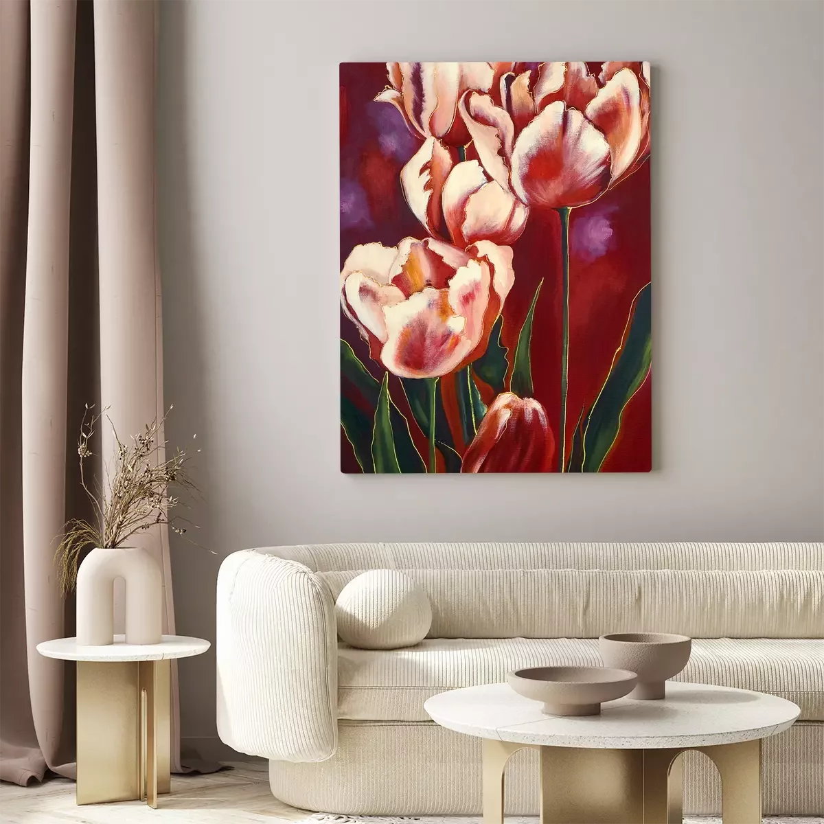 Tulpen auf burgunderrotem hintergrund in einem künstlerischen stil
