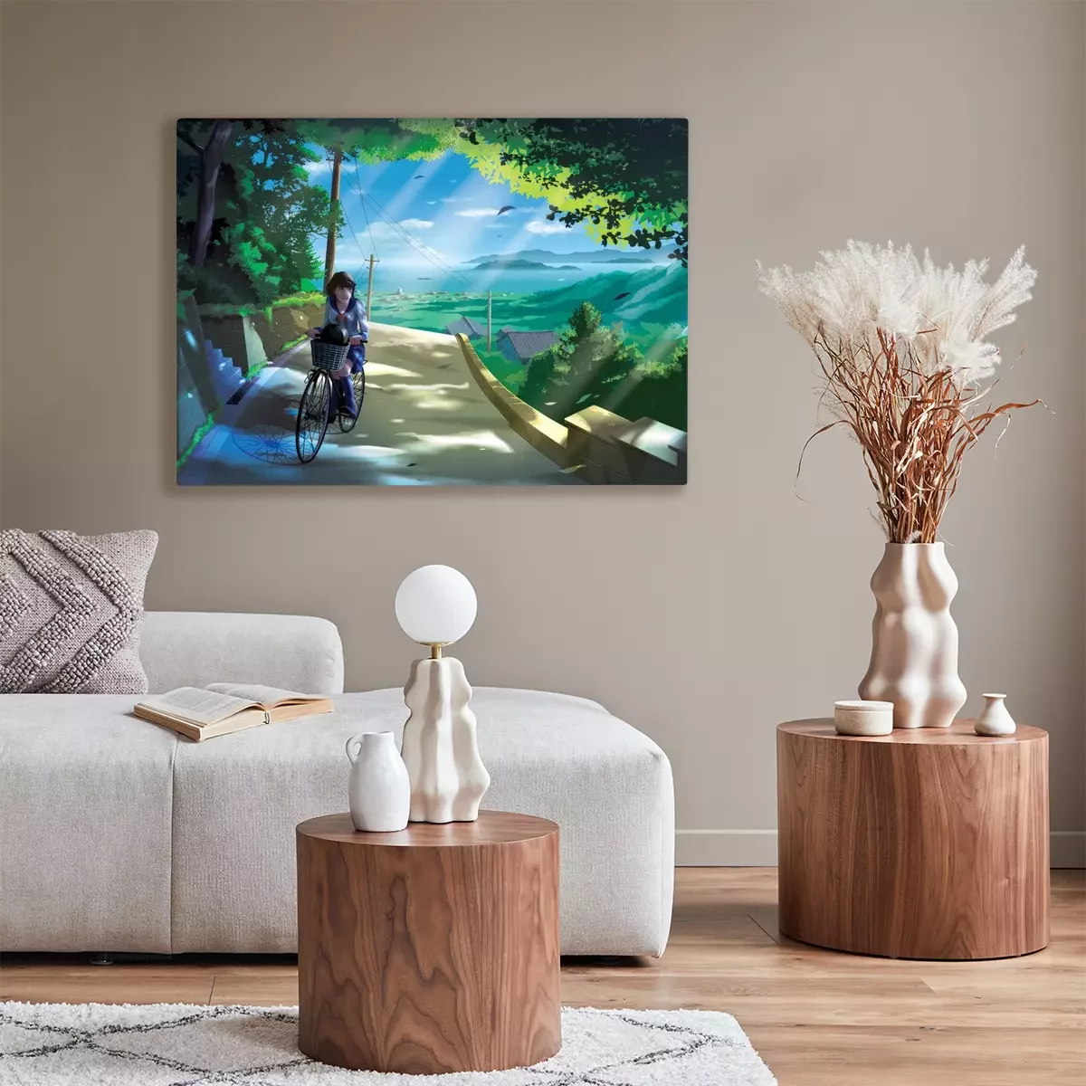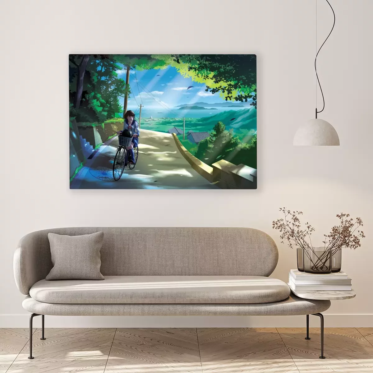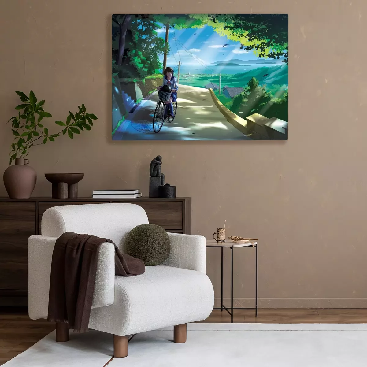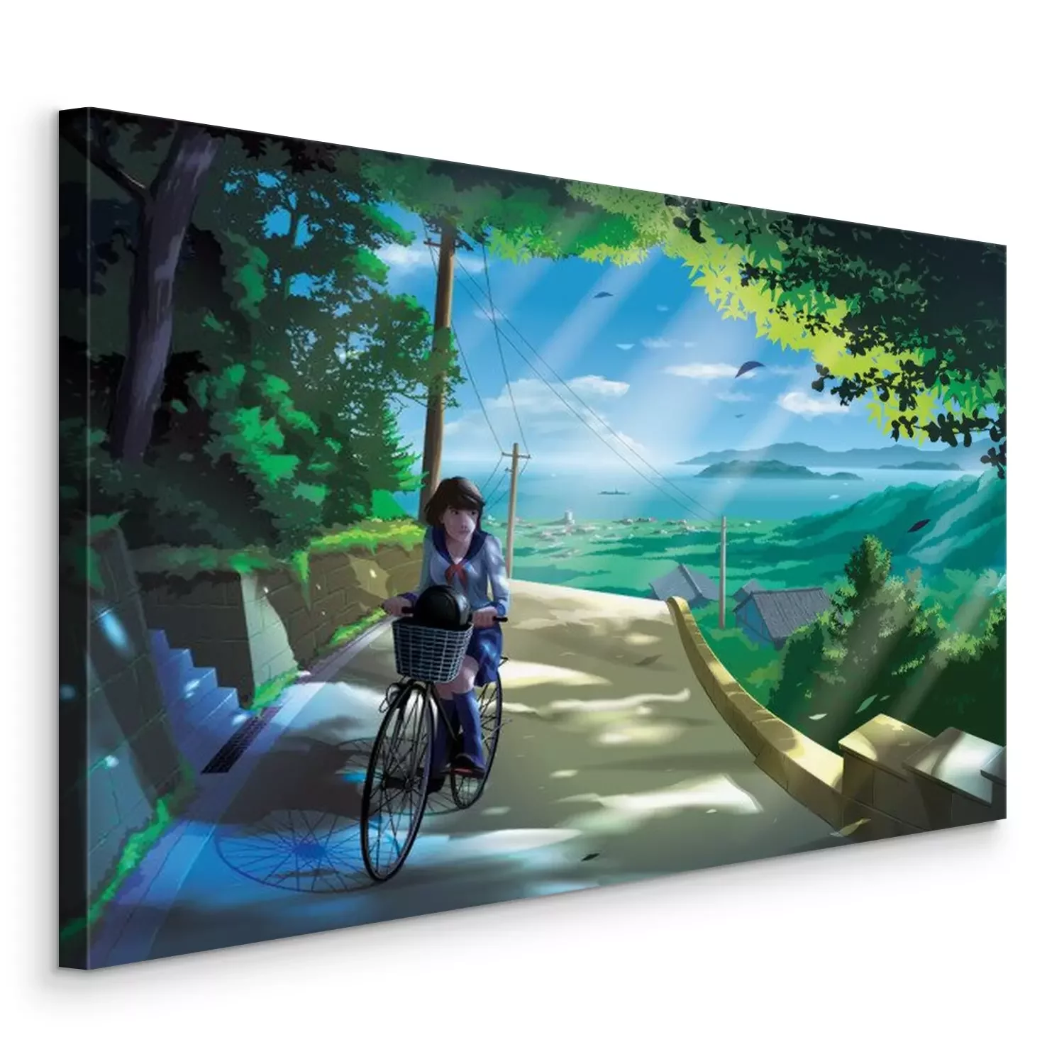 Bild vector illustration in an anime style of a Japanese girl student rides a bicycle on a road in the countryside