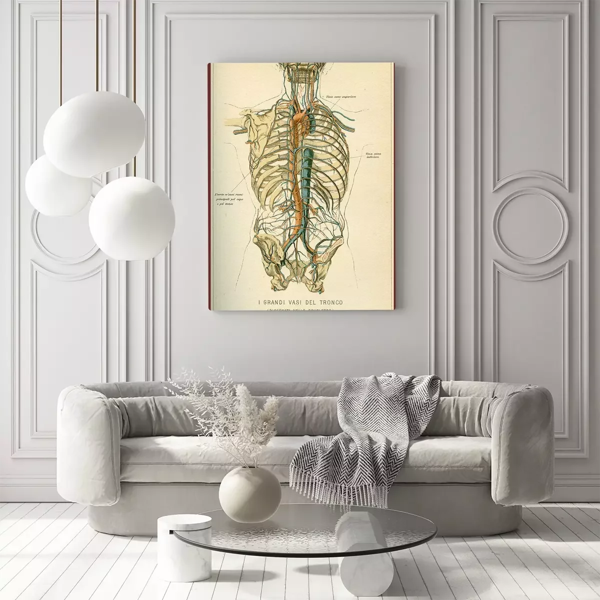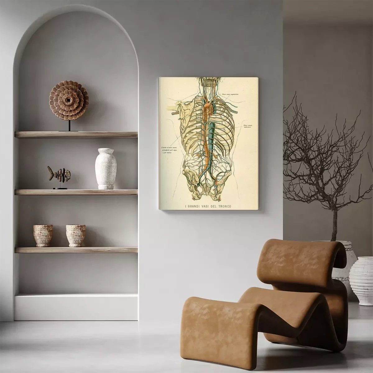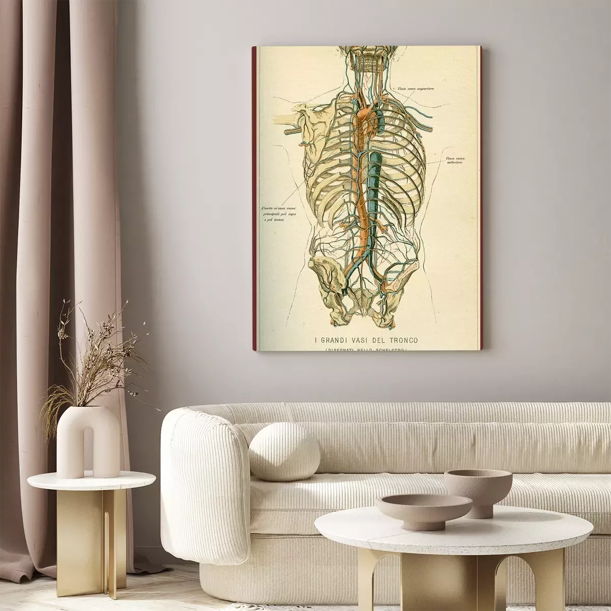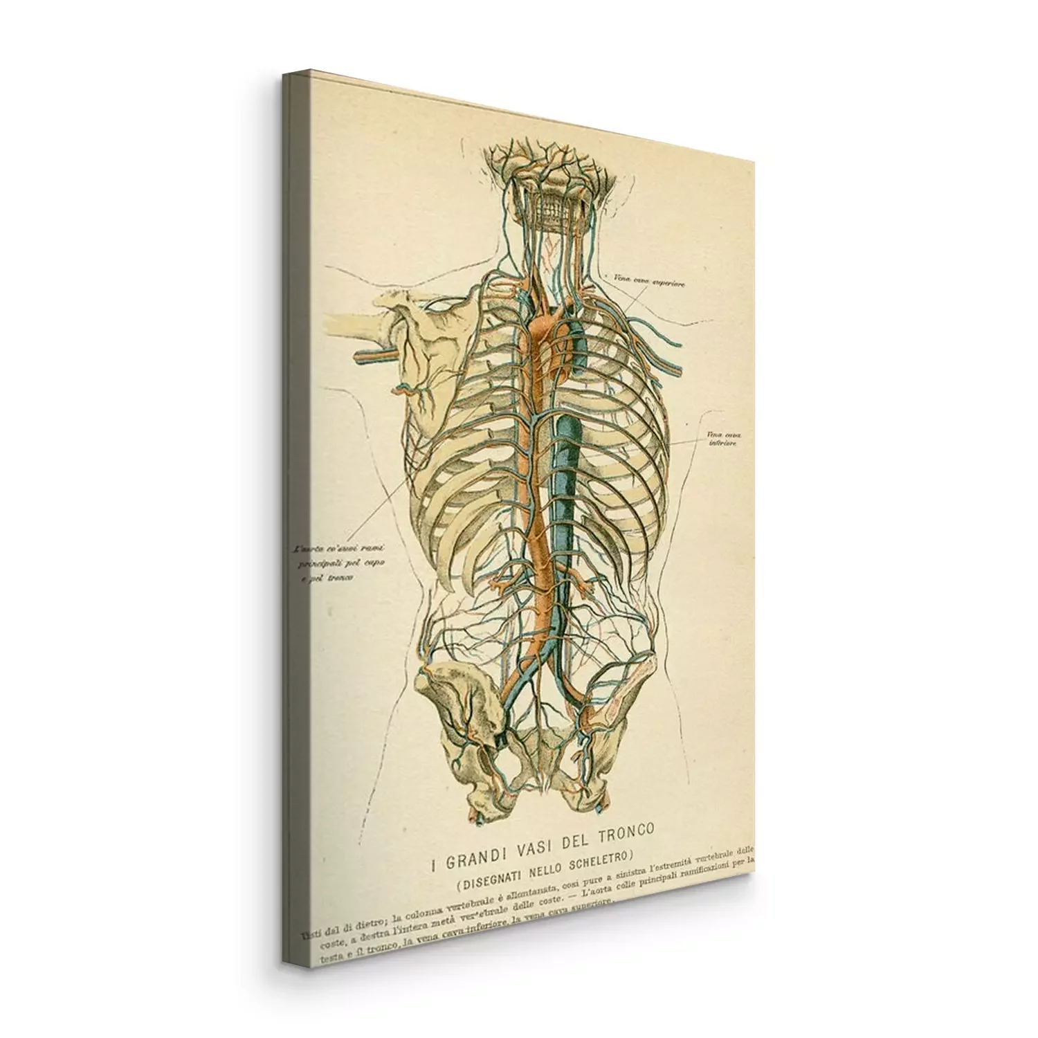 Bild: Vintage color table of anatomy, abdomen large blood vessels with skeleton, Italian anatomical descriptions