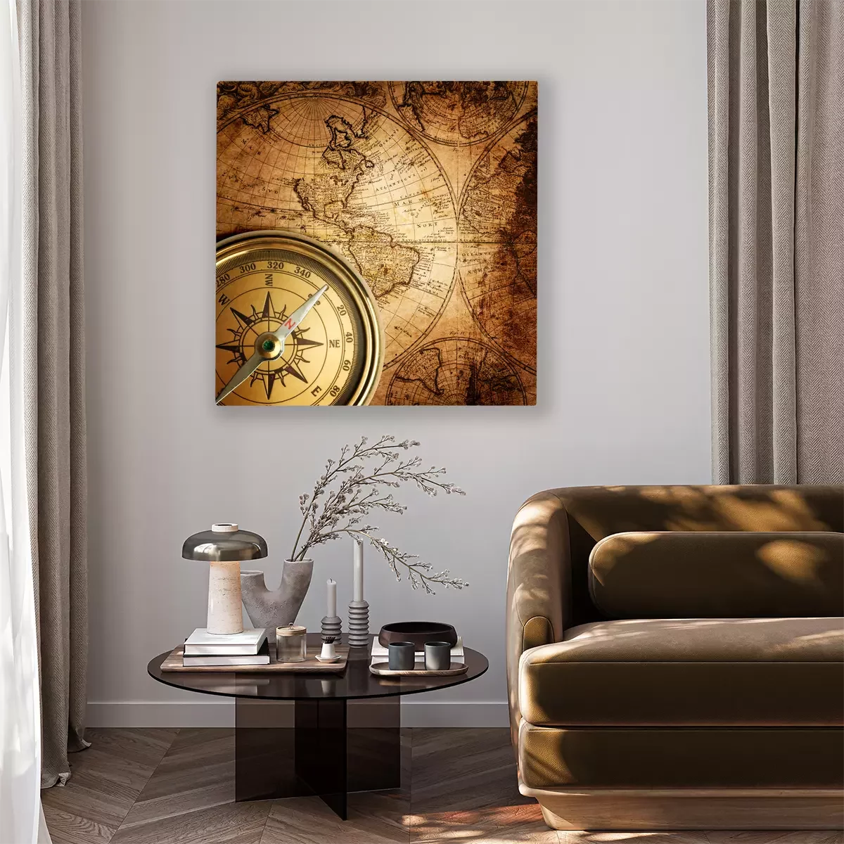 Alter Kompass, Fernglas und Seile auf einer alten Weltkarte