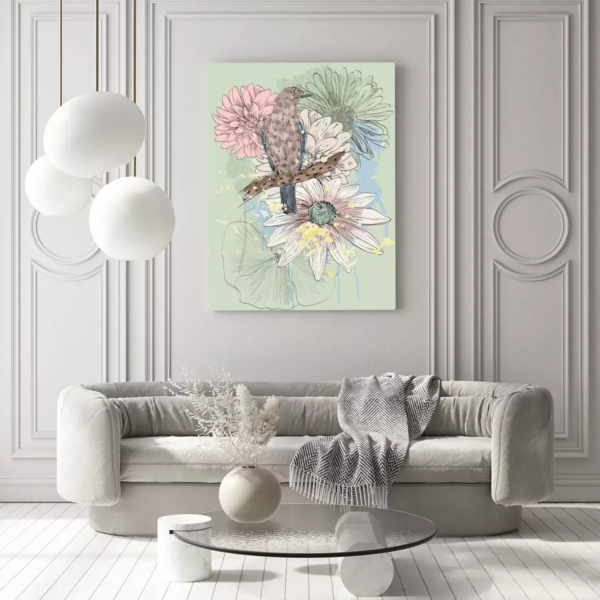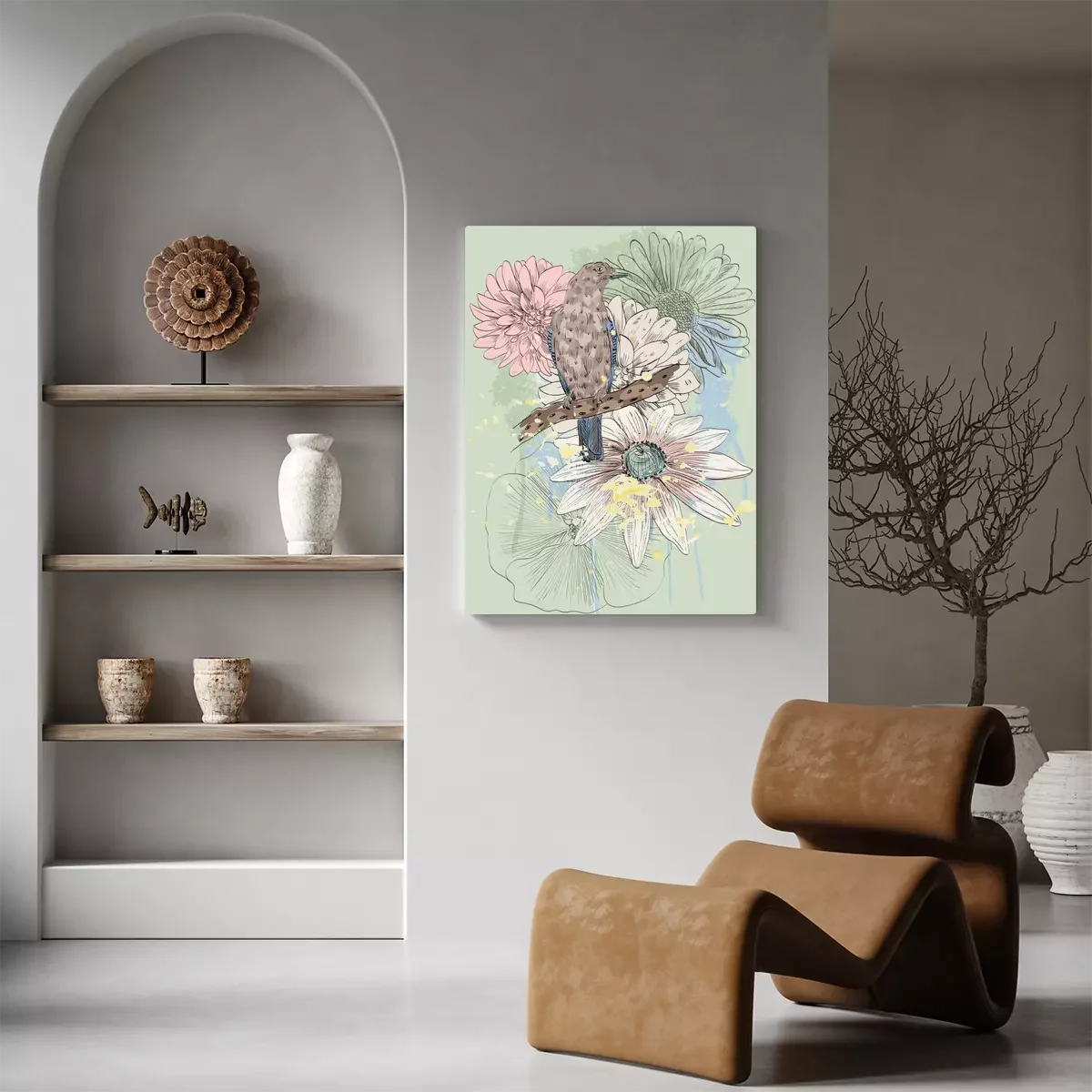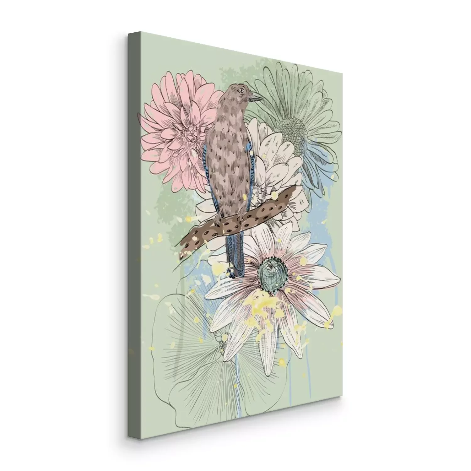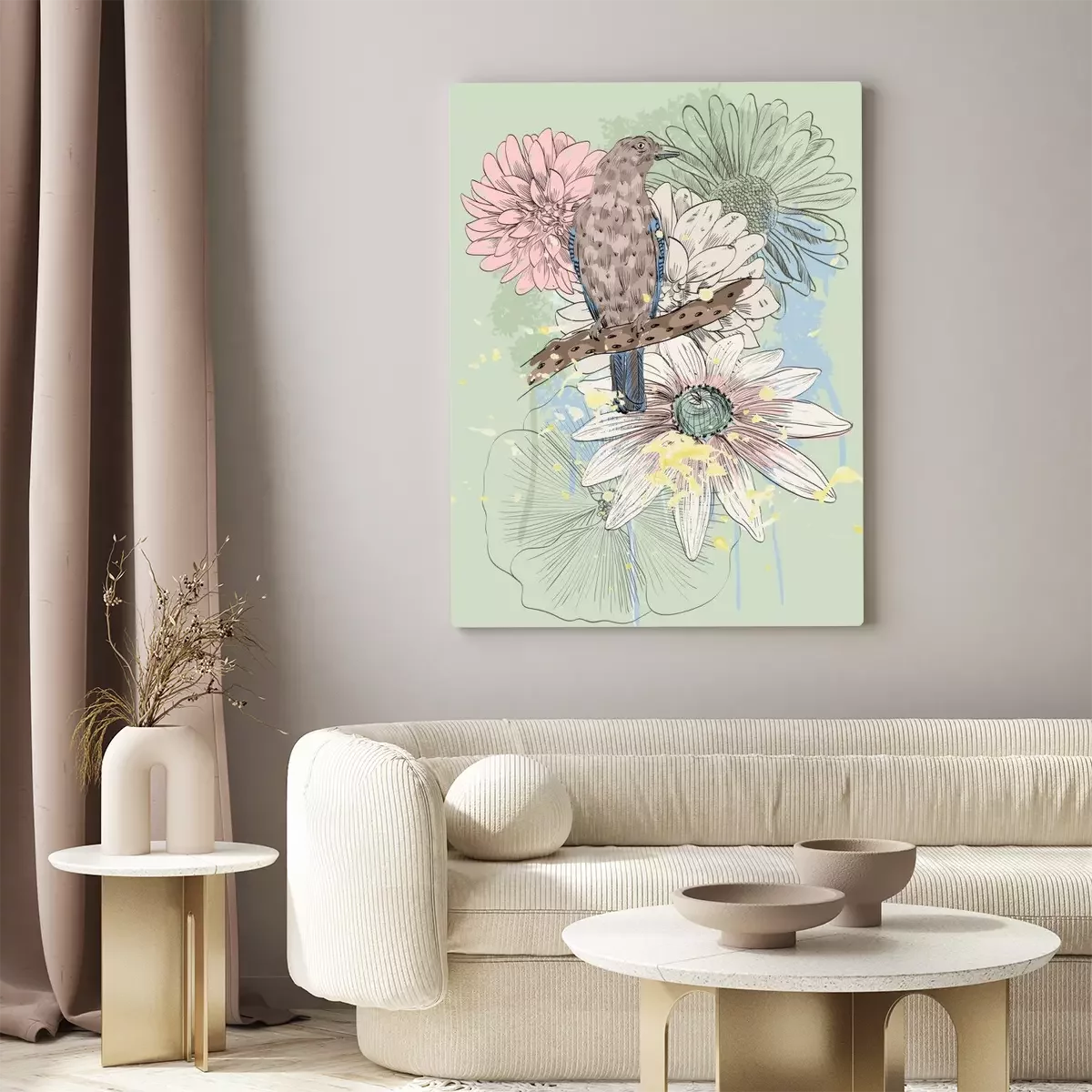 Bild: Vogel und Blumen auf grünem Hintergrund