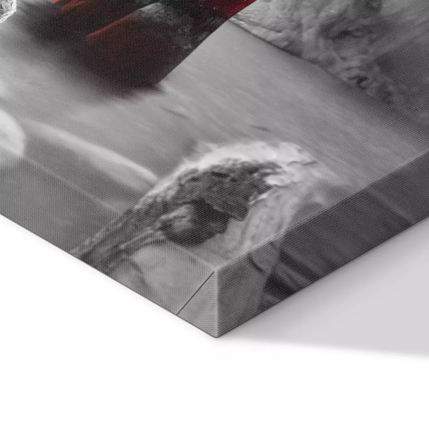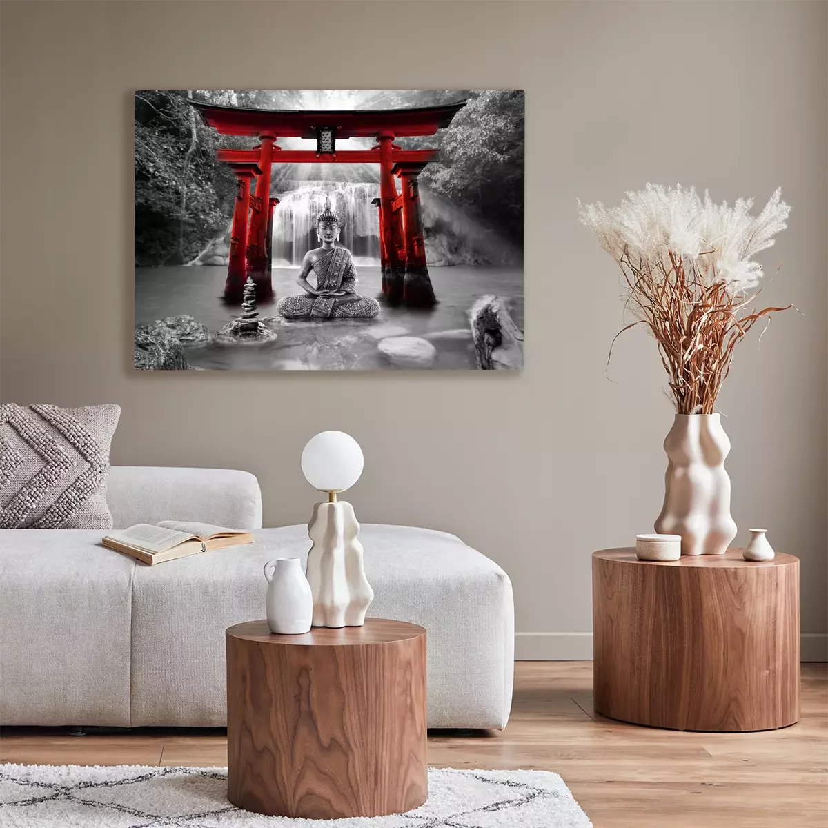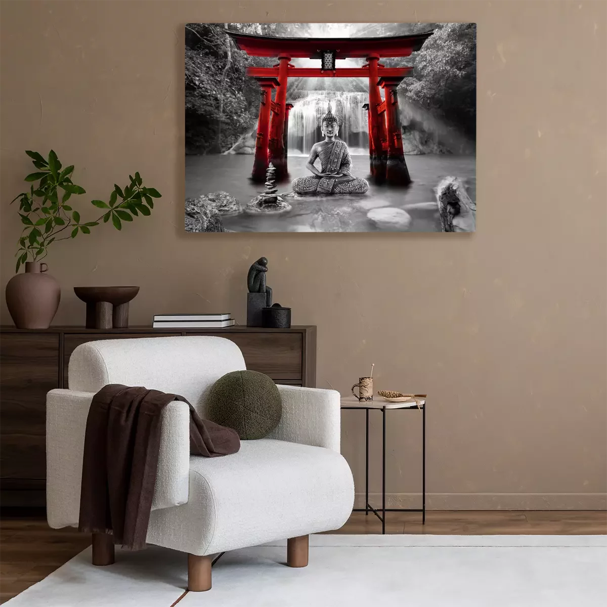 Wasserfall und buddha in schwarz-weiß mit einem roten bogen