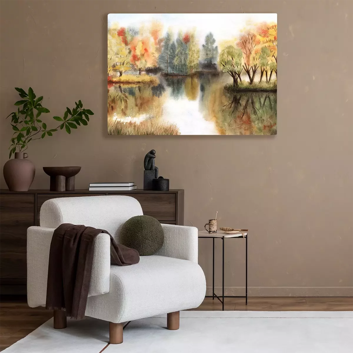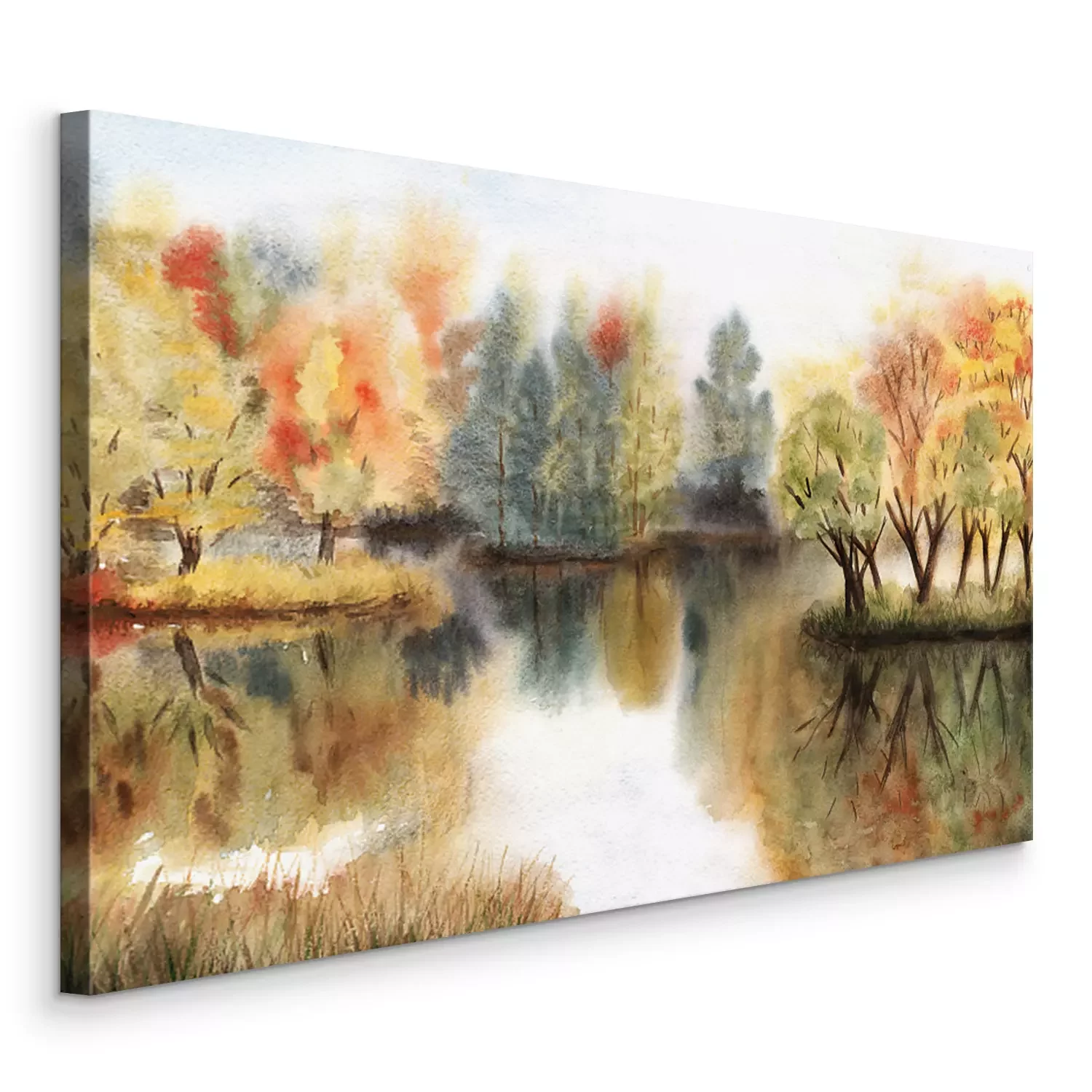Bild Watercolor autumn landscape with trees on islands and their reflections in a lake
