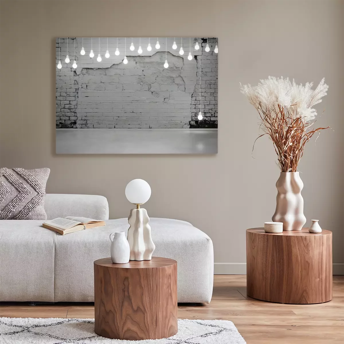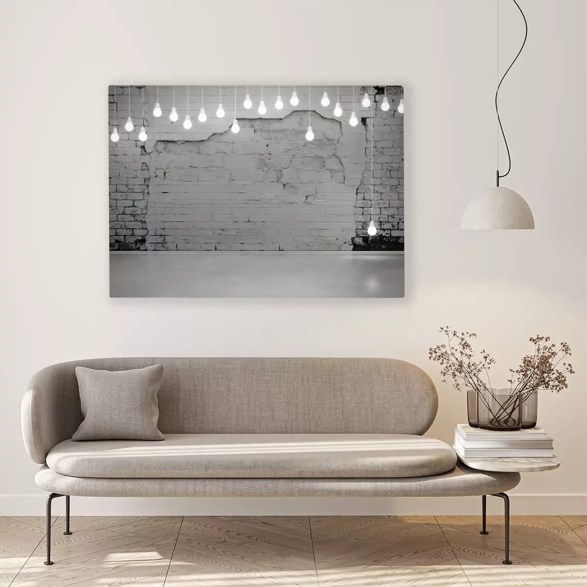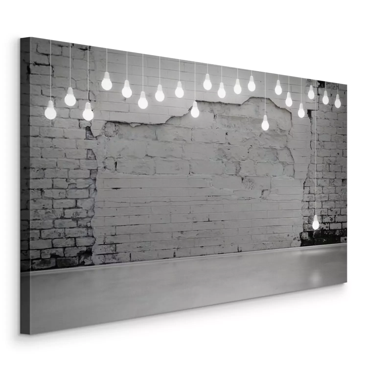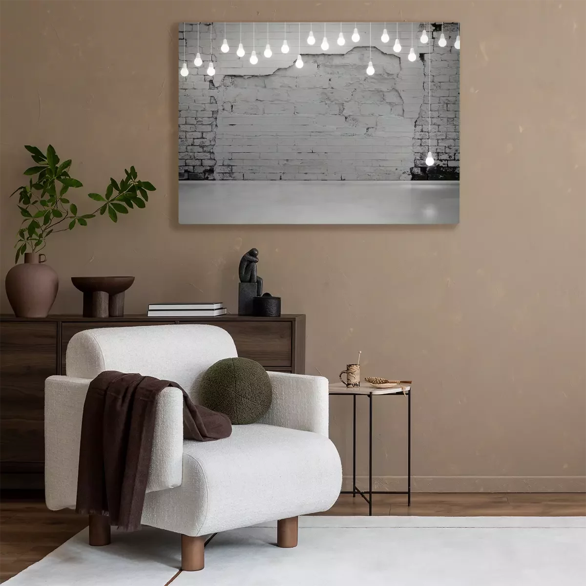 Bild: Weiße Backsteinmauer und Glühbirnen