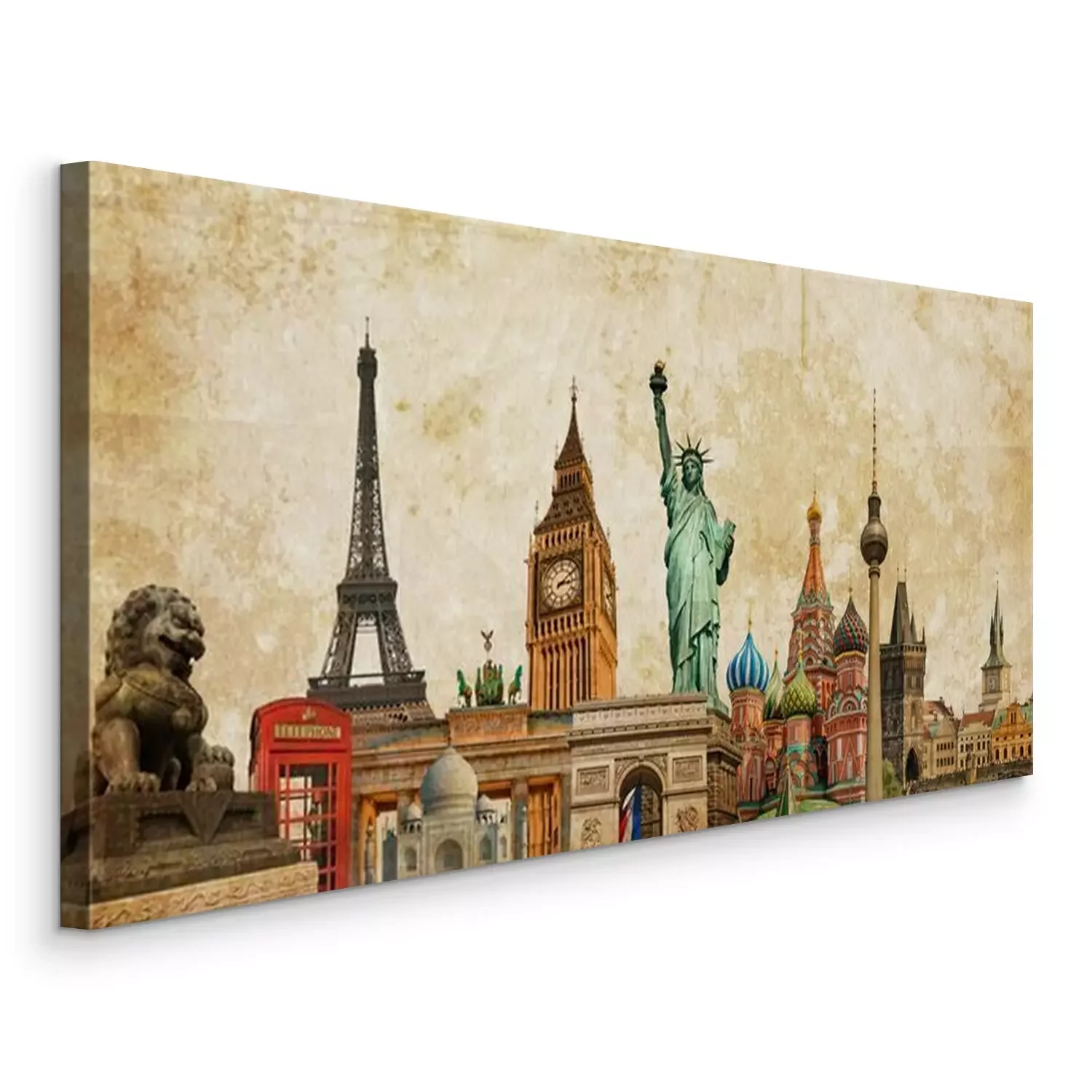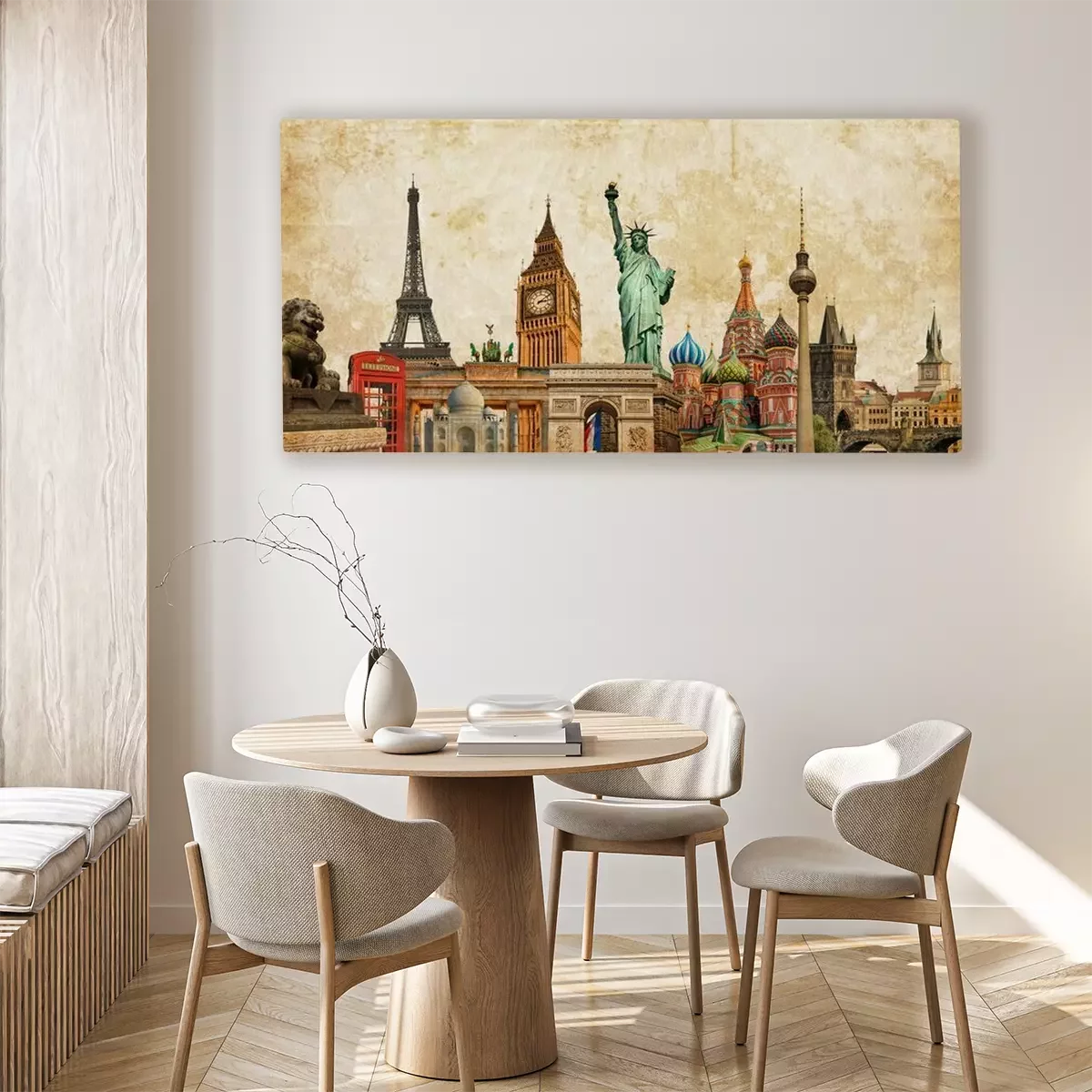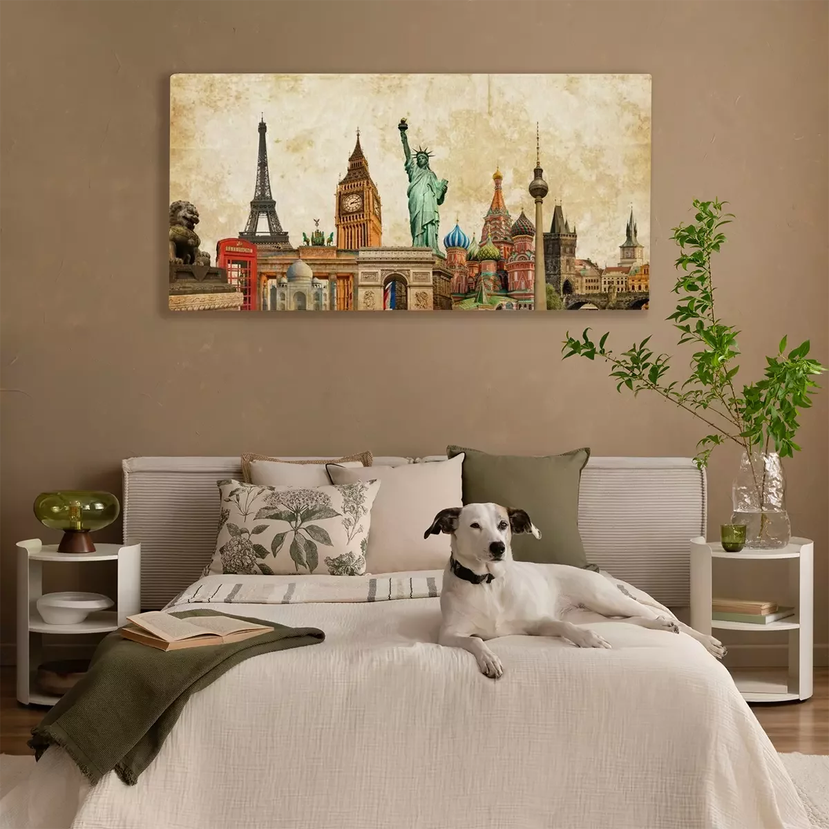 Bild: Welt Wahrzeichen Foto Collage auf Jahrgang tes Sepia texturierter Hintergrund, Reisen, Tourismus und Studie rund um die Welt Konzept, Vintage Postkarte