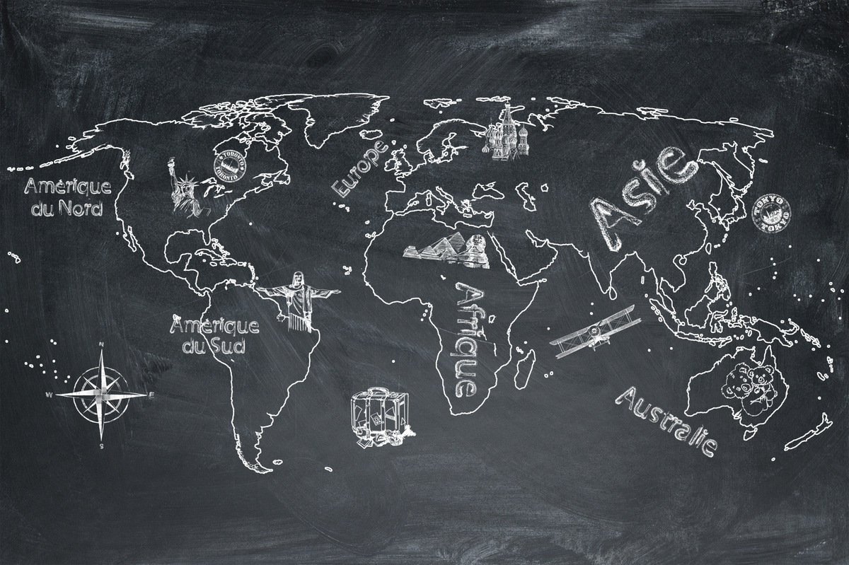 Bild: Weltkarte mit Kontinenten und Beschriftungen auf einer Tafel