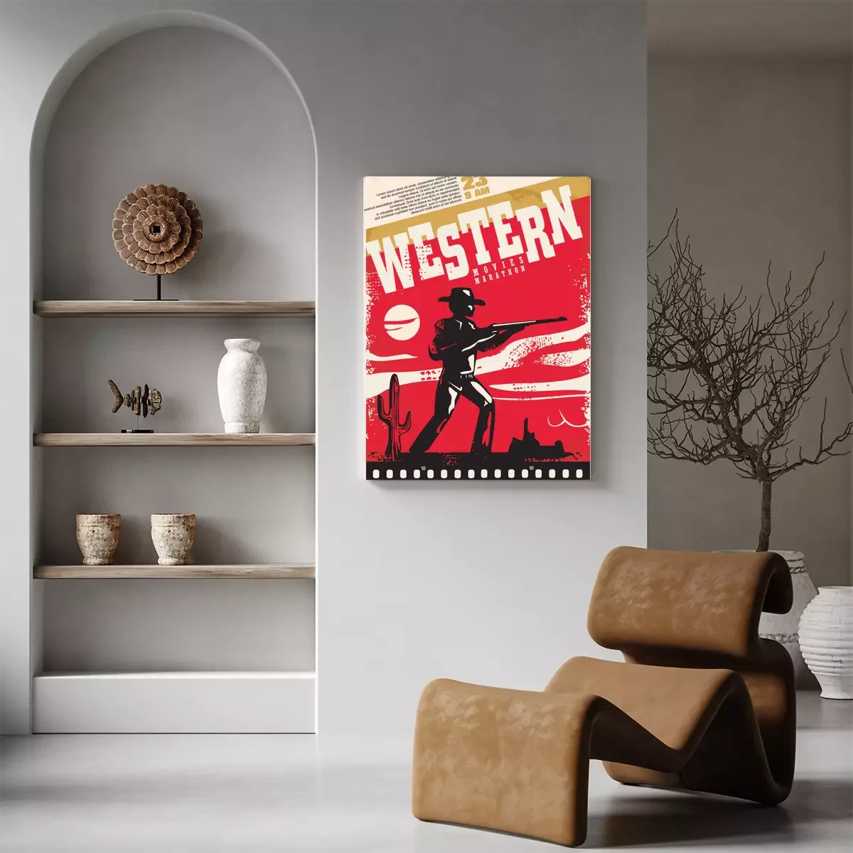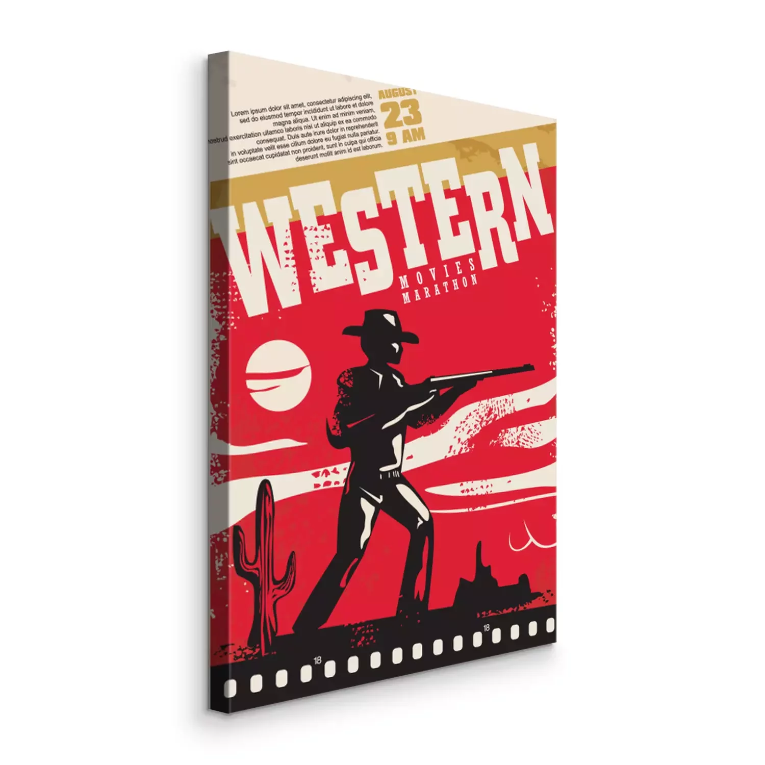 Bild Western movies marathon retro poster design layout. Cinema festival. Vintage film poster template with cowboy and wild west landscape.