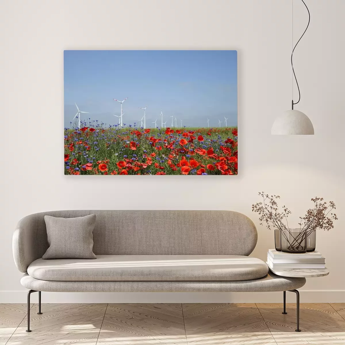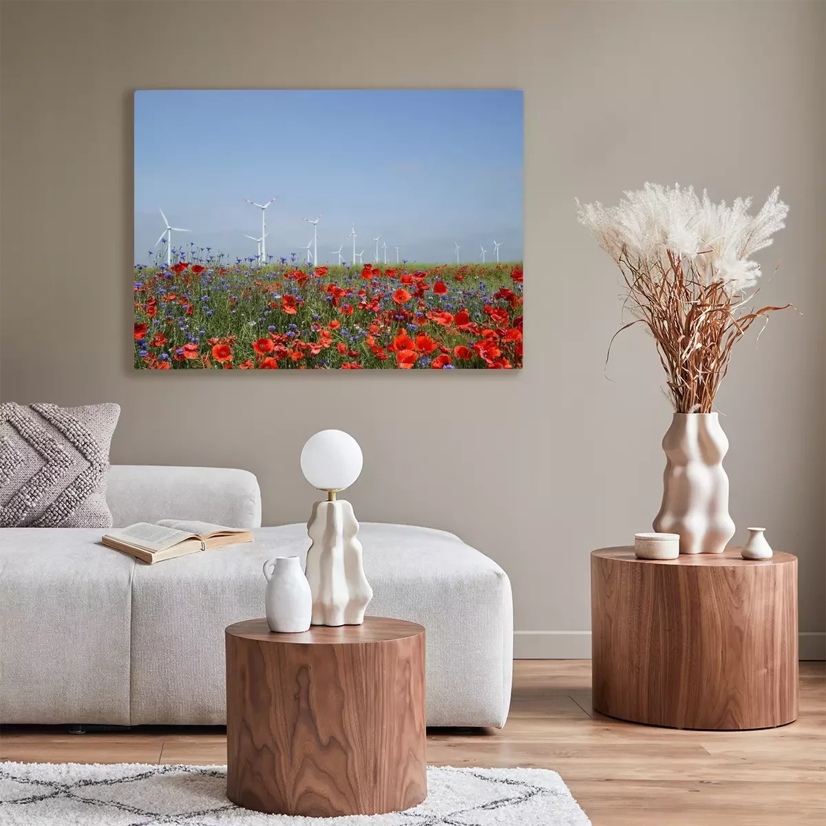 Bild: Windrad und Mohn- und Kornblumenfeld