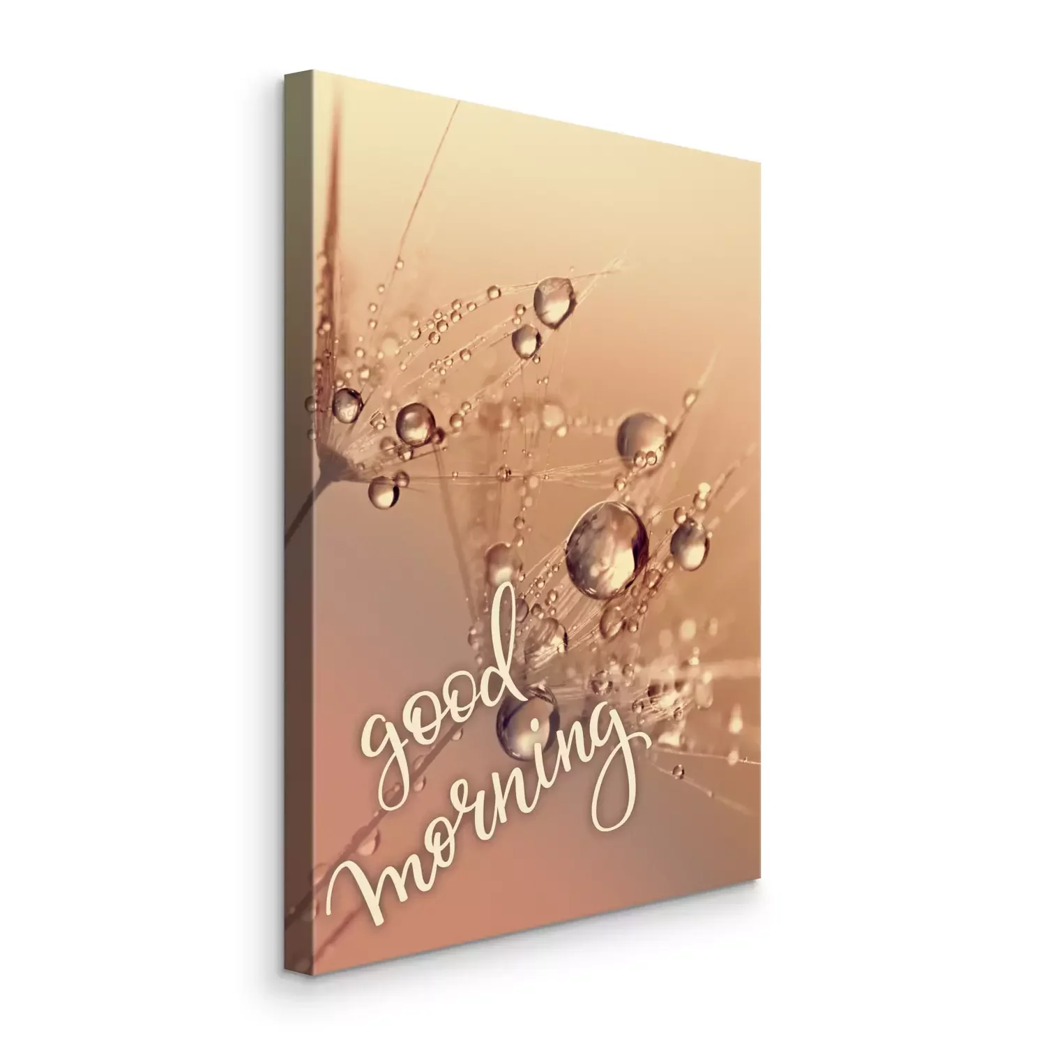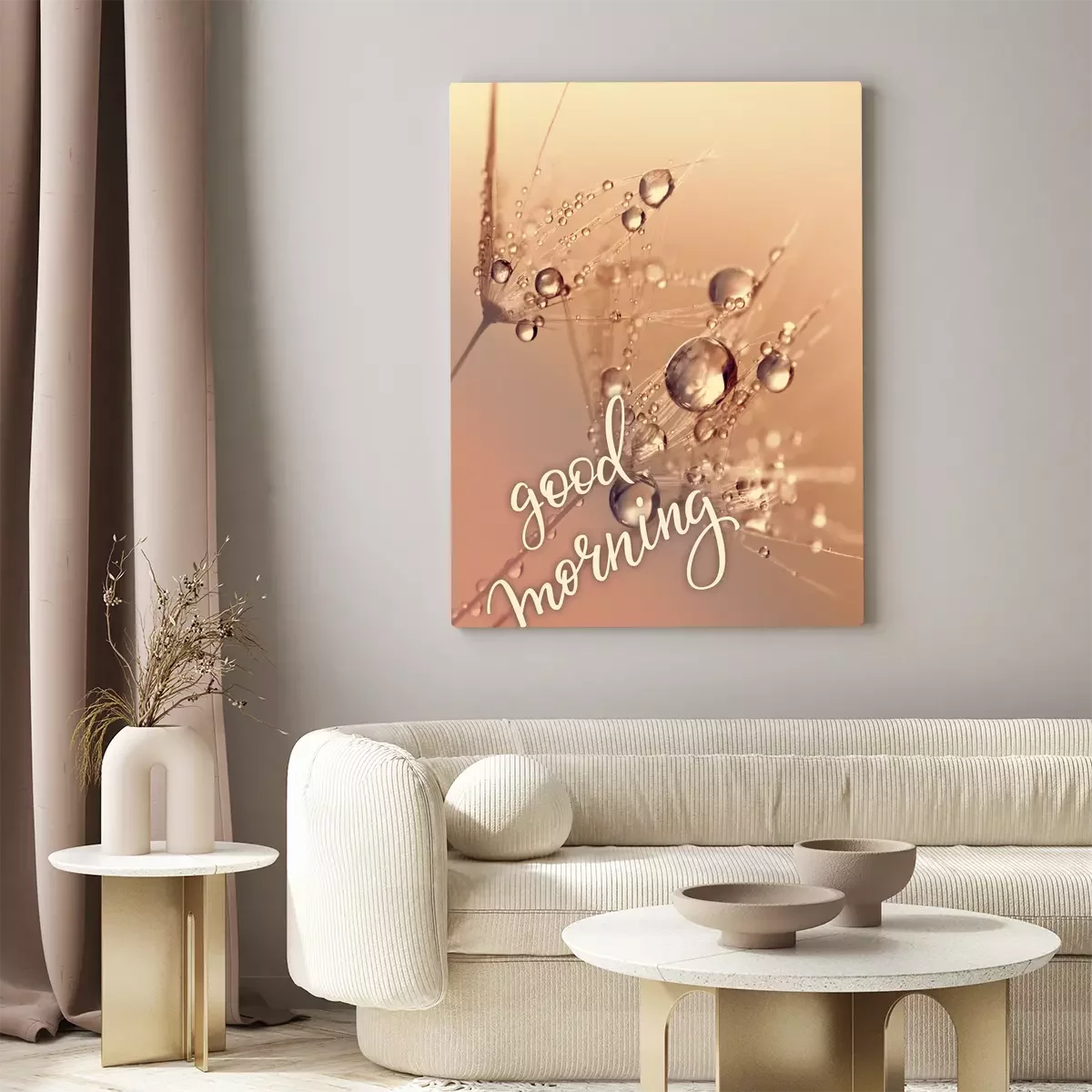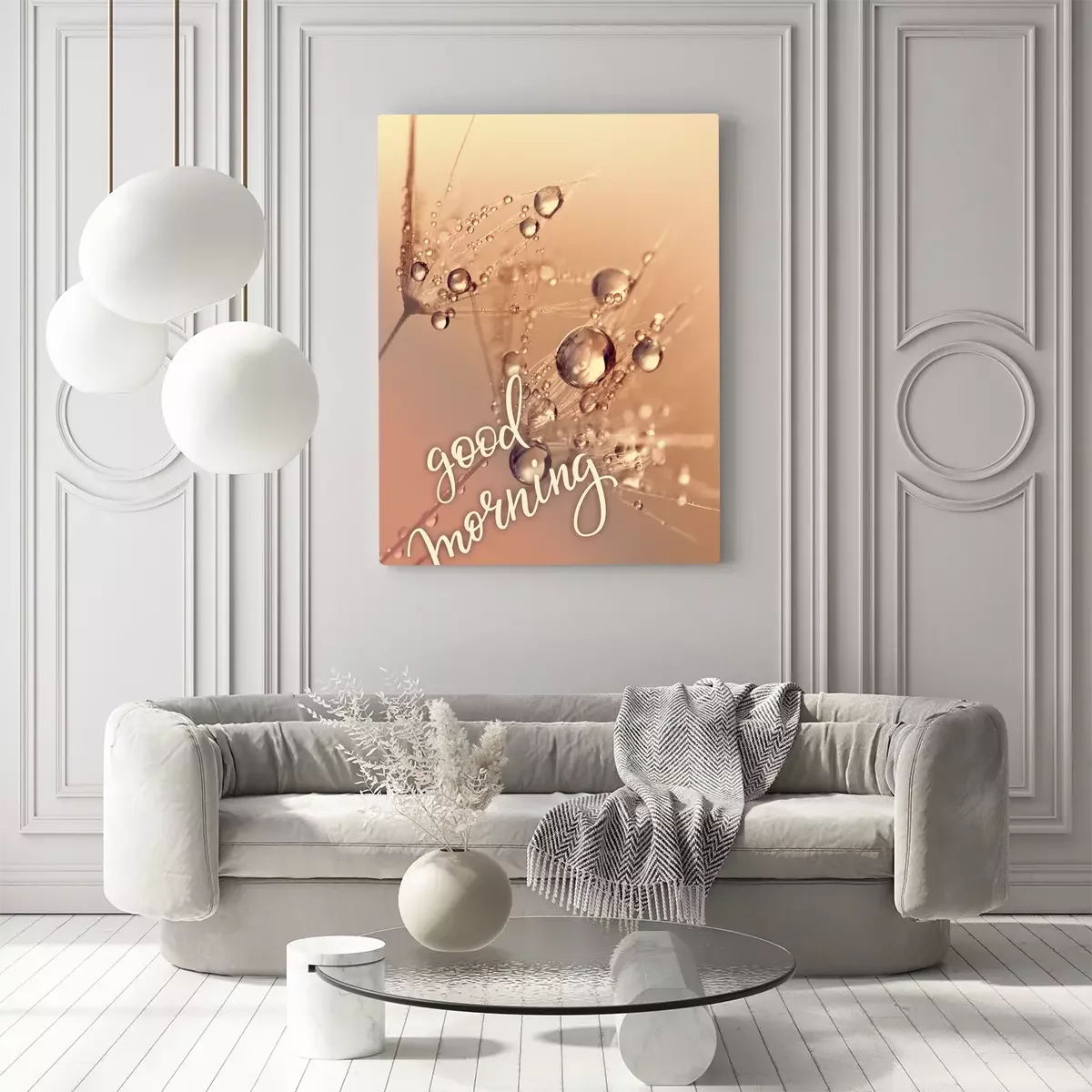 Beige löwenzahnblüten mit tau und den worten „guten morgen“