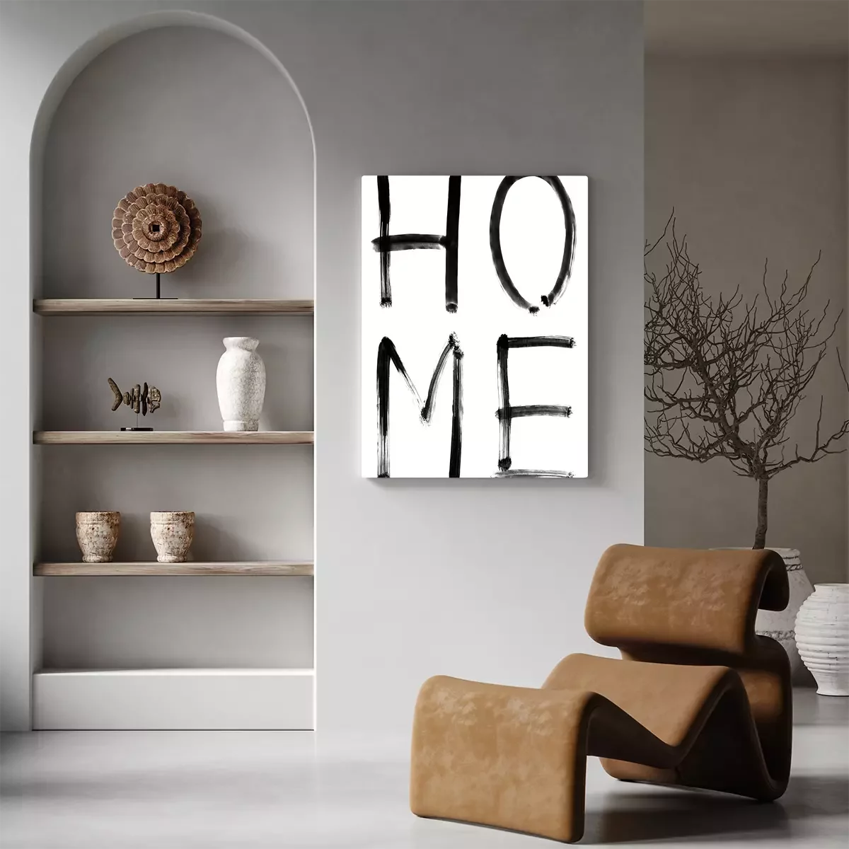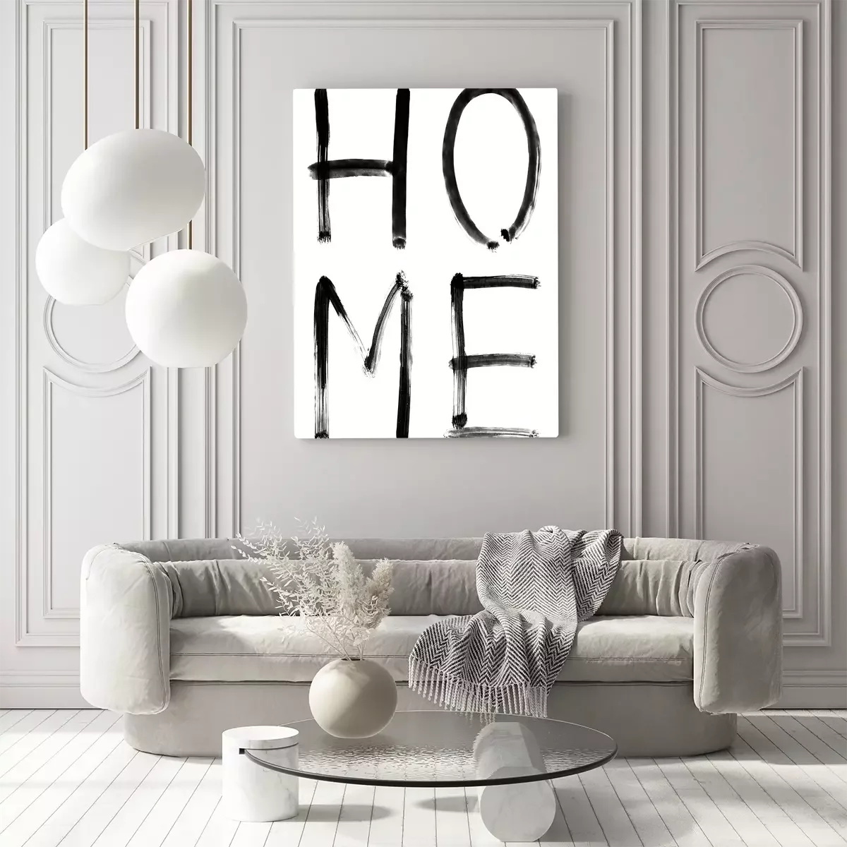 Schwarz gemalter schriftzug „home“ auf weißem hintergrund