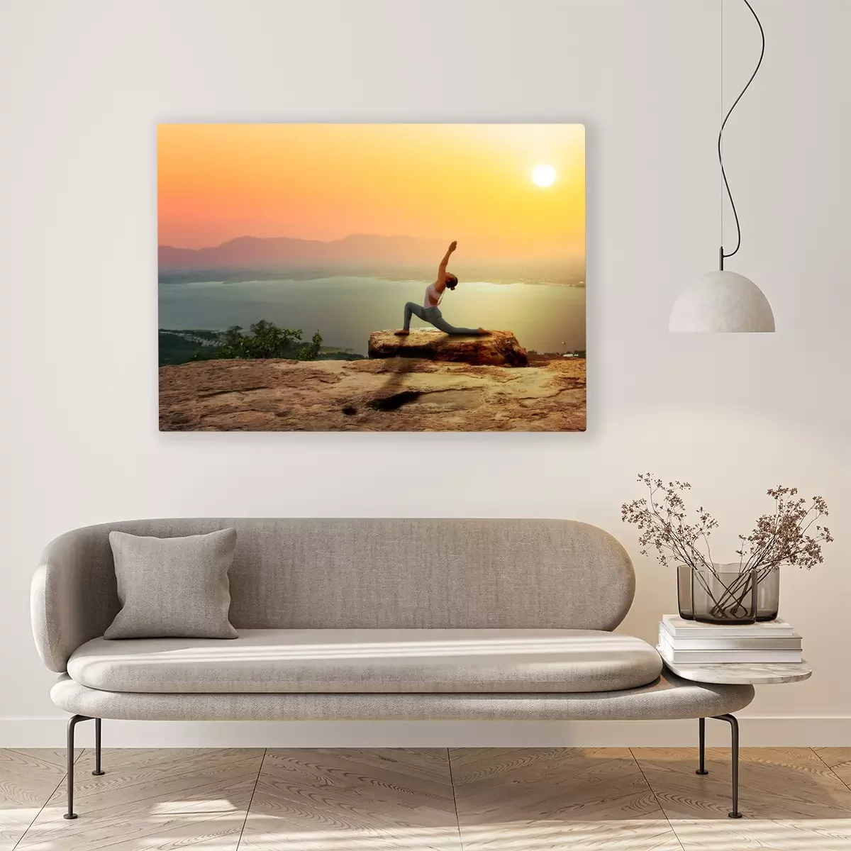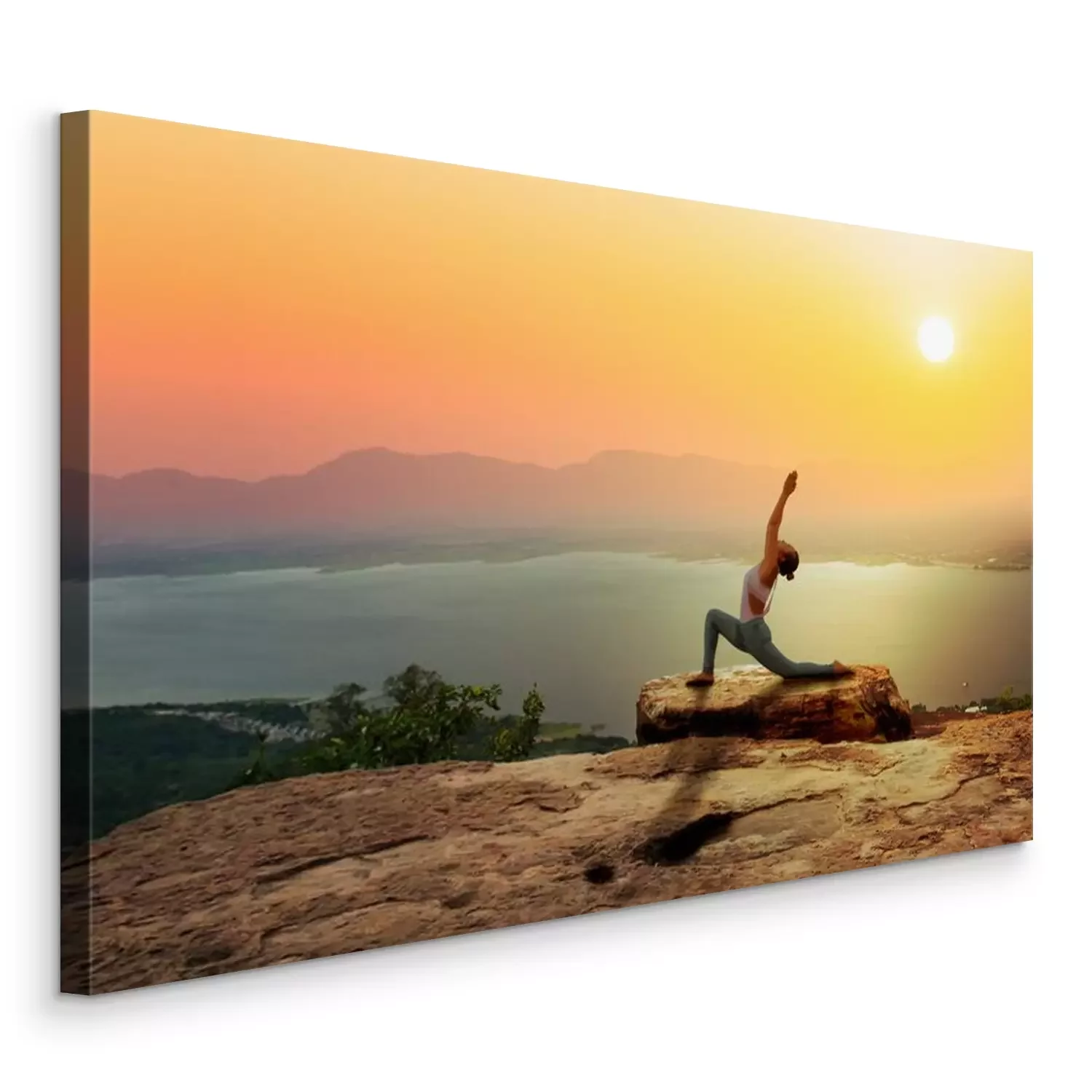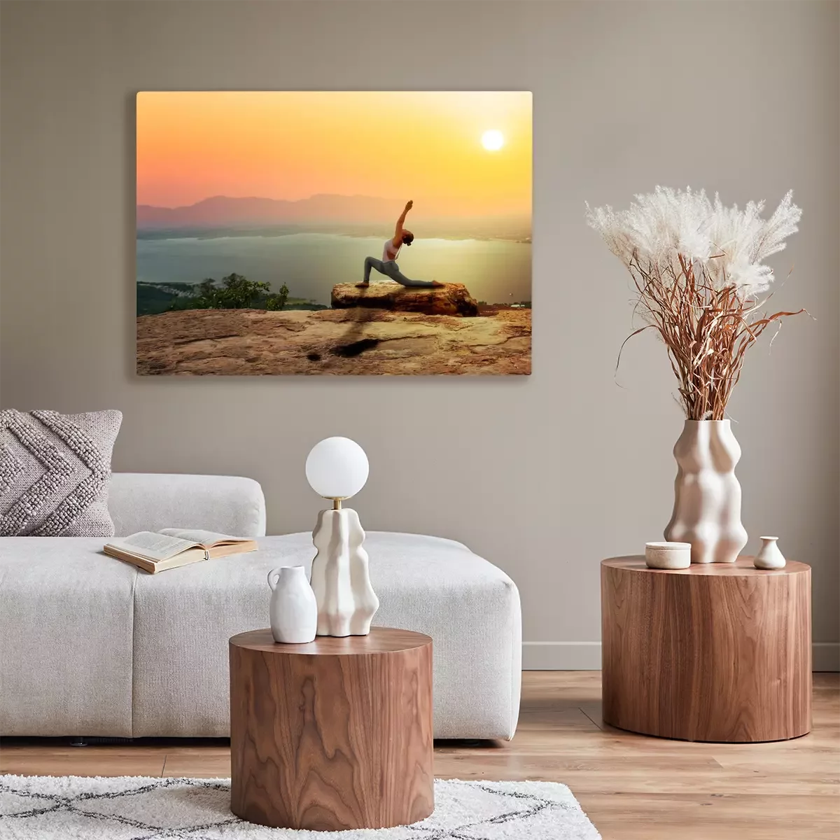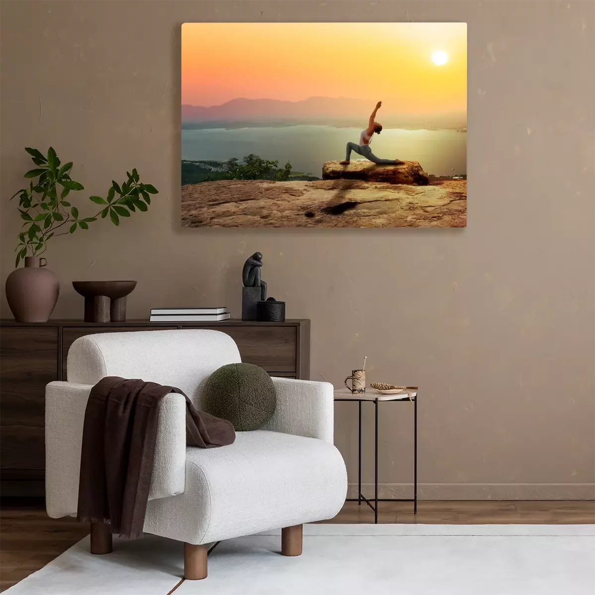 Bild Yoga bei Sonnenaufgang mit einer Berglandschaft im Hintergrund