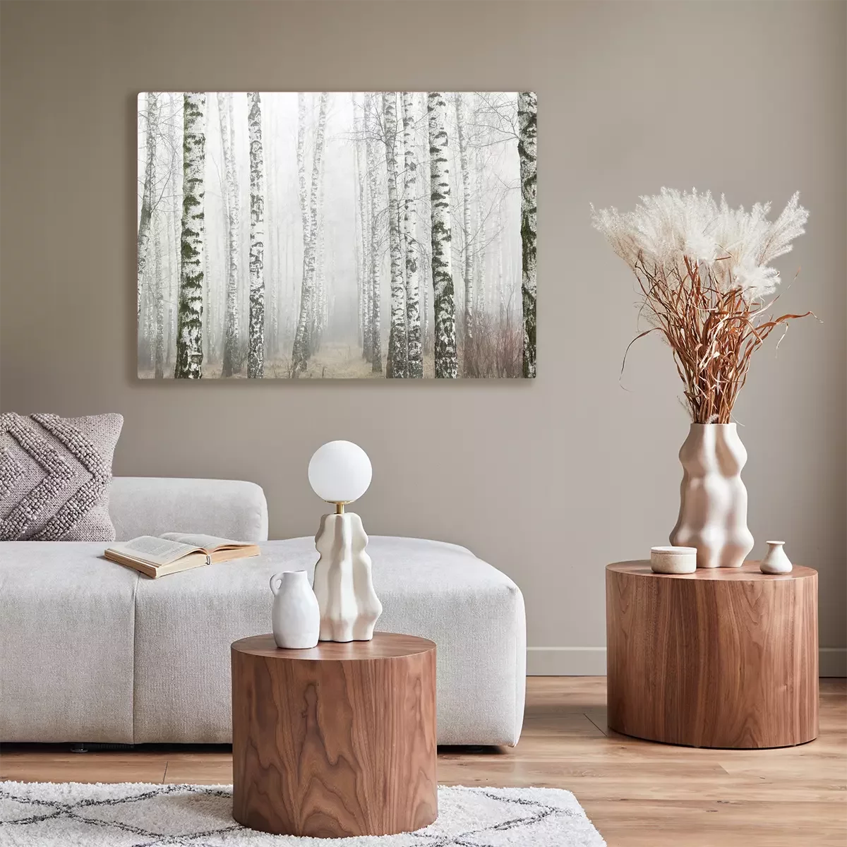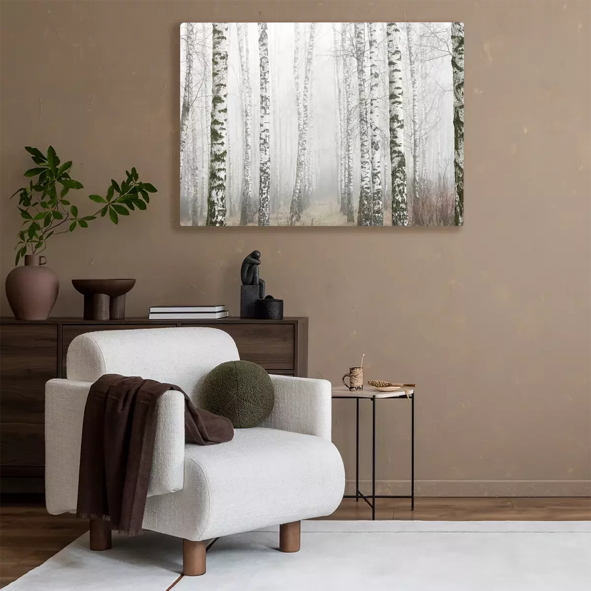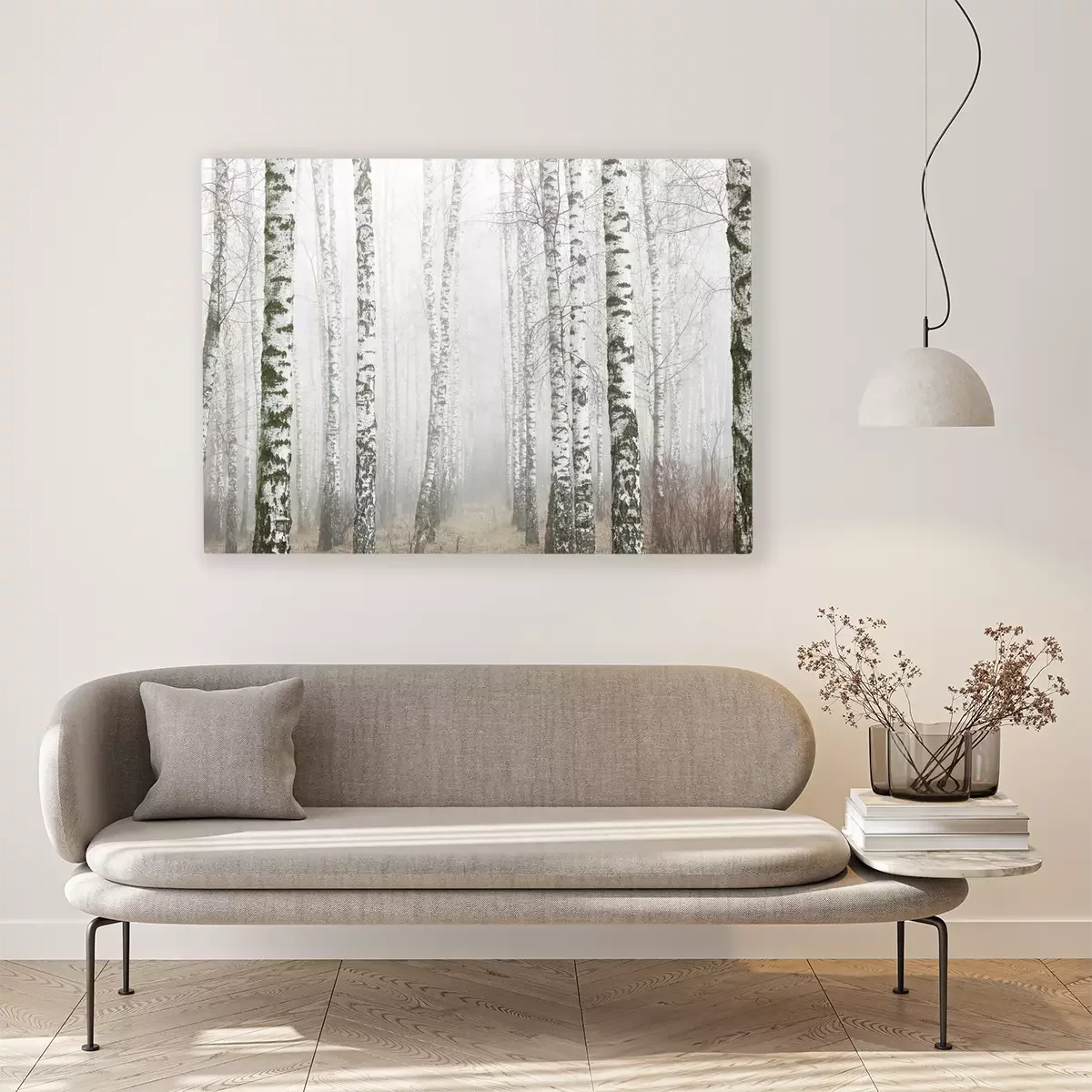 Bild: Young birches with black and white birch bark in spring in birch grove against background of other birches in foggy weather