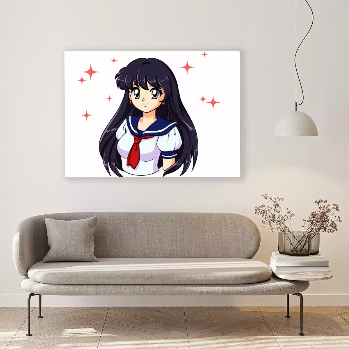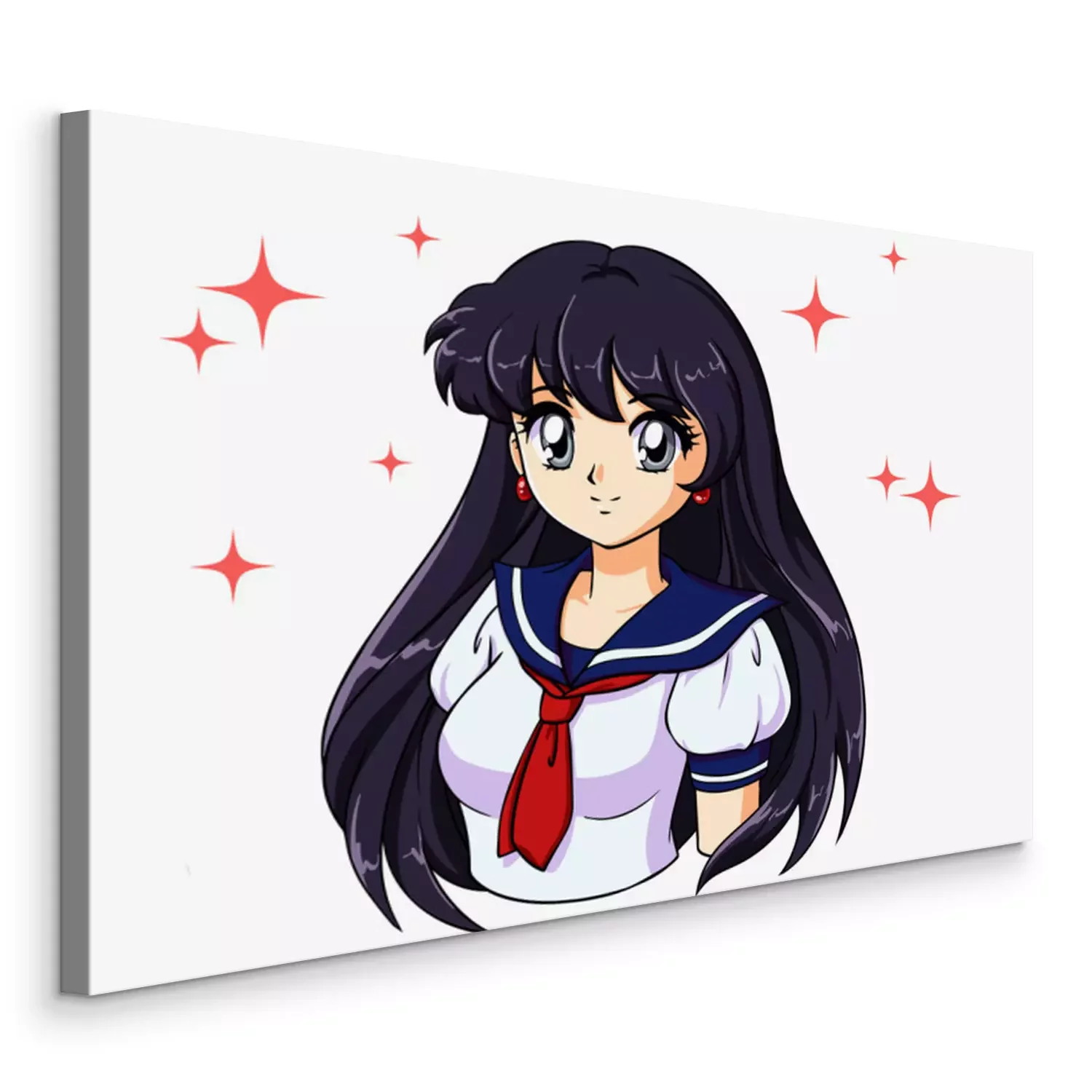 Happy anime face. Manga style big blue eyes, little nose and big kawaii mouth. Yellow sparkles in her eyes.