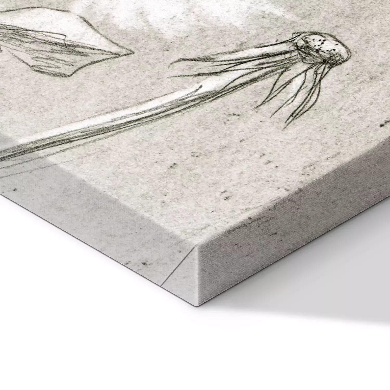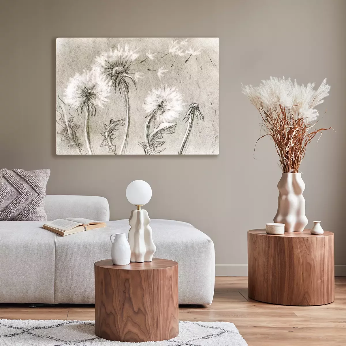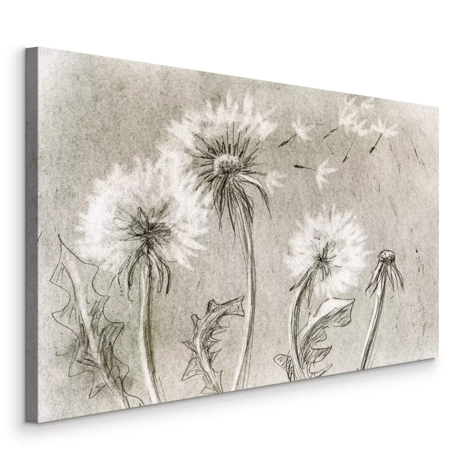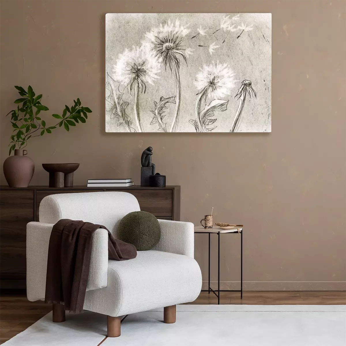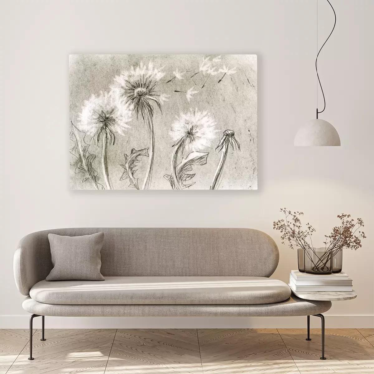 Zeichnung von löwenzahnblüten, deren samen in grautönen wegfliegen.