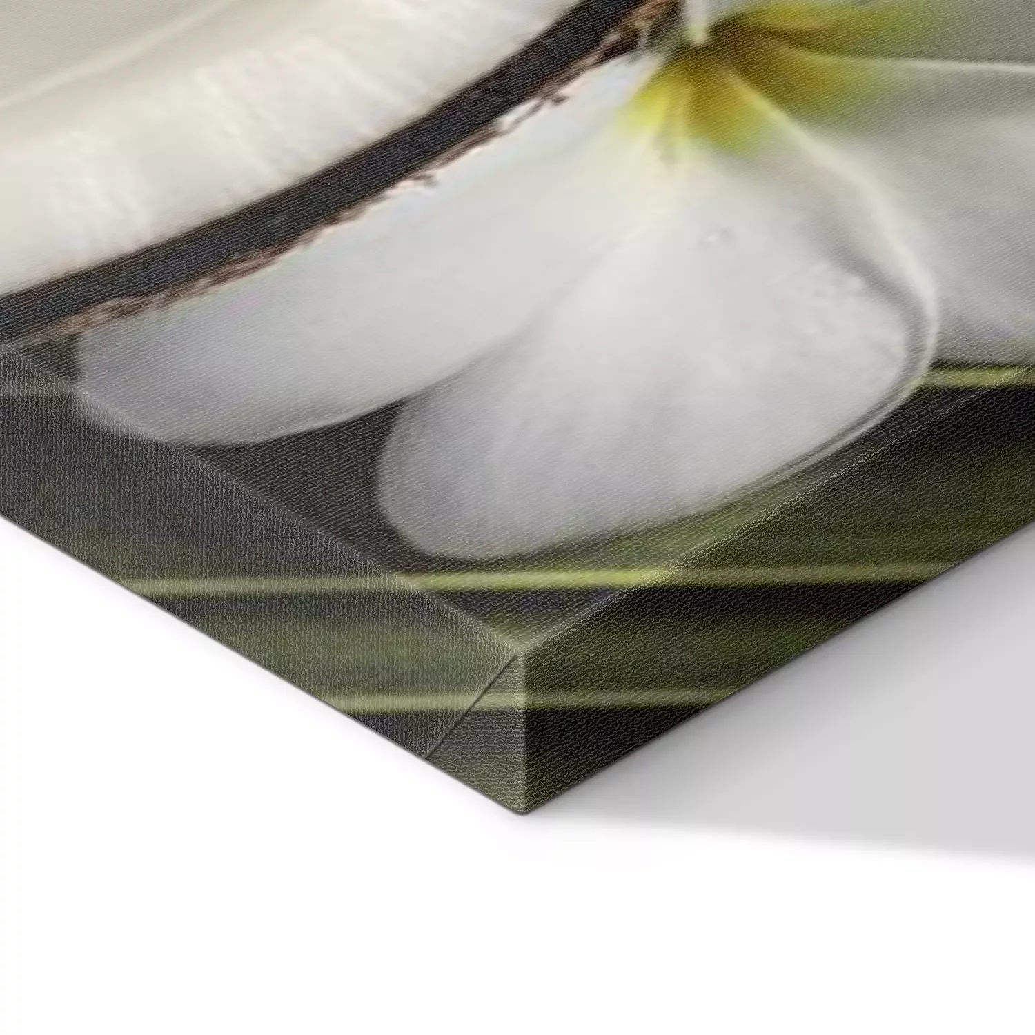 Bild: Zwei Hälften Kokosnuss und Orchidee