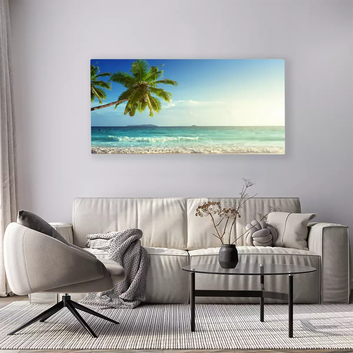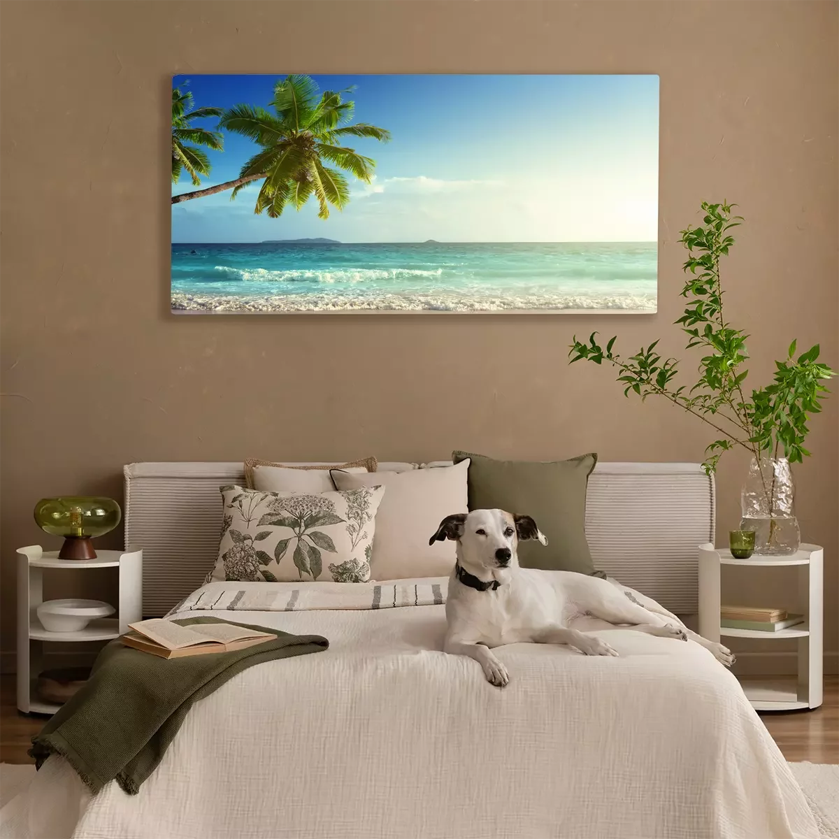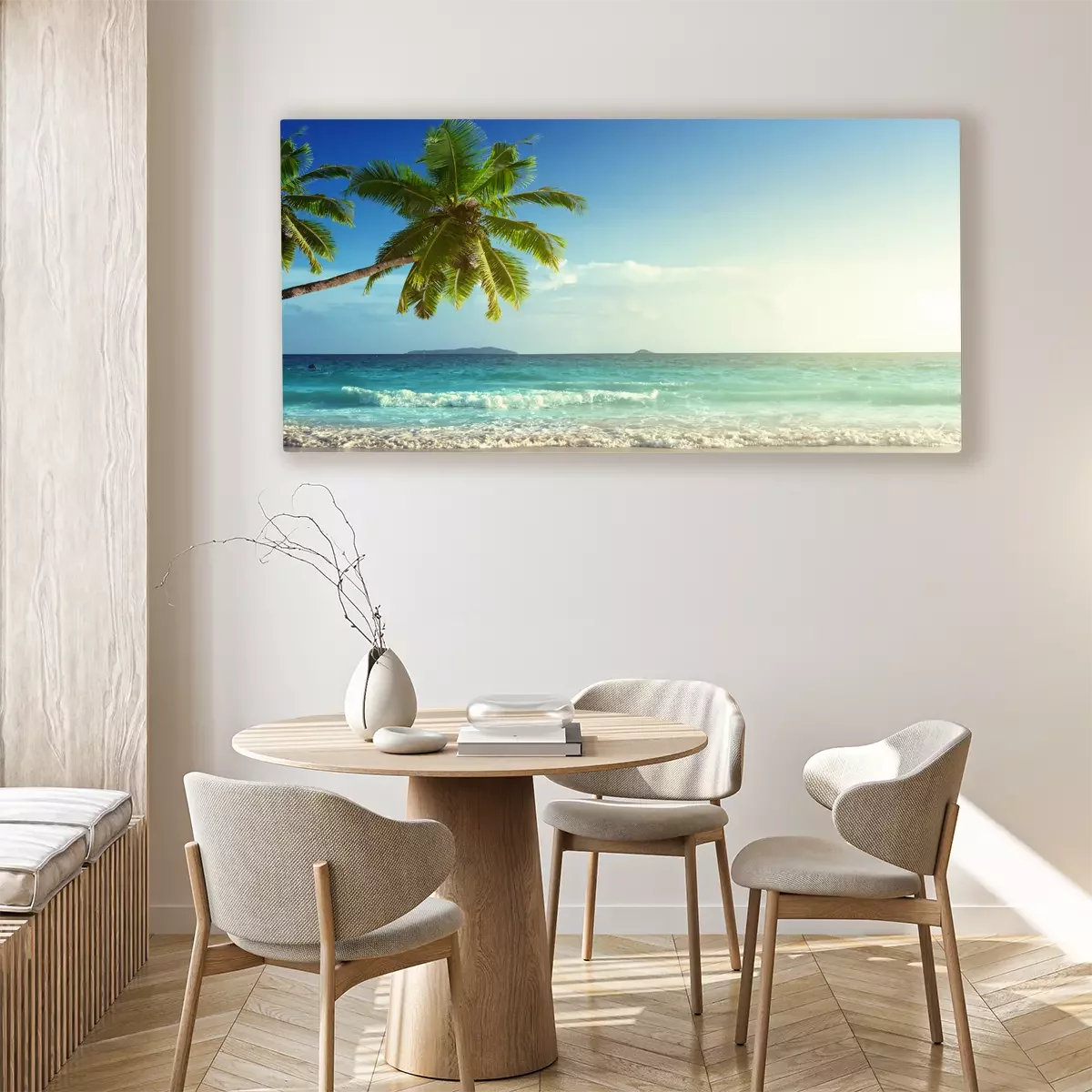 Zwei palmen, die sich über das türkisfarbene meer neigen